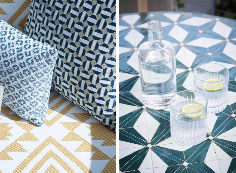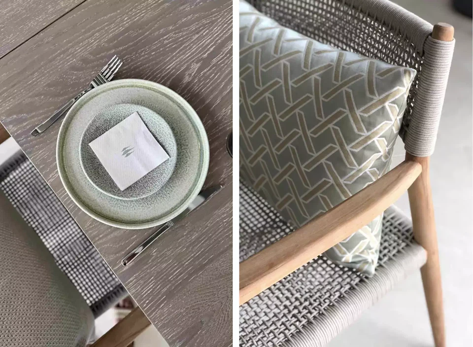 Die Terrasse verkörpert den ungezwungenen Charme und den mediterranen Geist des Restaurants. Der Aussenbereich wird durch kaltgepresste Bodenfliesen aus rohen und recycelten Materialien geprägt, die ein faszinierendes grafisches Muster bilden. Massgefertigte Bänke, die mit luxuriösen Stoffen gepolstert sind, werden durch lebhafte Akzentkissen ergänzt, während handgefertigte Mosaiktische für ein künstlerisches Flair sorgen. Diese Kombination schafft eine einladende und dennoch raffinierte Aussenumgebung, die sich perfekt zum Entspannen und Geniessen eignet.