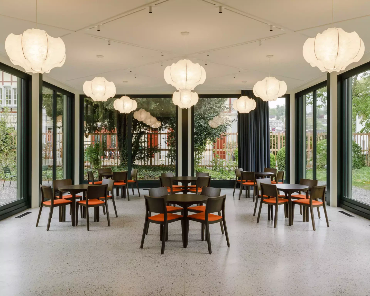 Das Projekt zur Erweiterung und Sanierung der Villa Flora in Winterthur bindet an die alte, künftig im Museumsbetrieb nicht mehr notwendige Küche einen Gartenpavillon an und schafft eine neue Eingangssequenz mit Kasse, Shop, Garderobe und kleinem Versammlungsraum, der über den neuen Lift direkt an die historische Treppenanlage angeschlossen ist. Der Hauptraum des feingliedrigen Pavillons ist ein neuer Ort des Treffens und des Austauschs und ein zeitgemässes Pendant zum historischen Gesellschaftsraum von Rittmeyer & Furrer. Der Pavillon schliesst den Garten zur Strasse ab und definiert dabei die neue Eingangssituation, die nicht mehr im beengten Raum an der lauten Strasse, sondern als Einstimmung auf eine stille Sammlung an der intimeren Gartenseite liegt. Er fasst den Garten dadurch gleichzeitig als neues grünes Zimmer, das den inneren Parcours des Hauses nach aussen erweitert und so den räumlichen und atmosphärischen Zusammenhang des historischen Ensembles in seiner grünen Stadtoase offen und erlebbar hält.