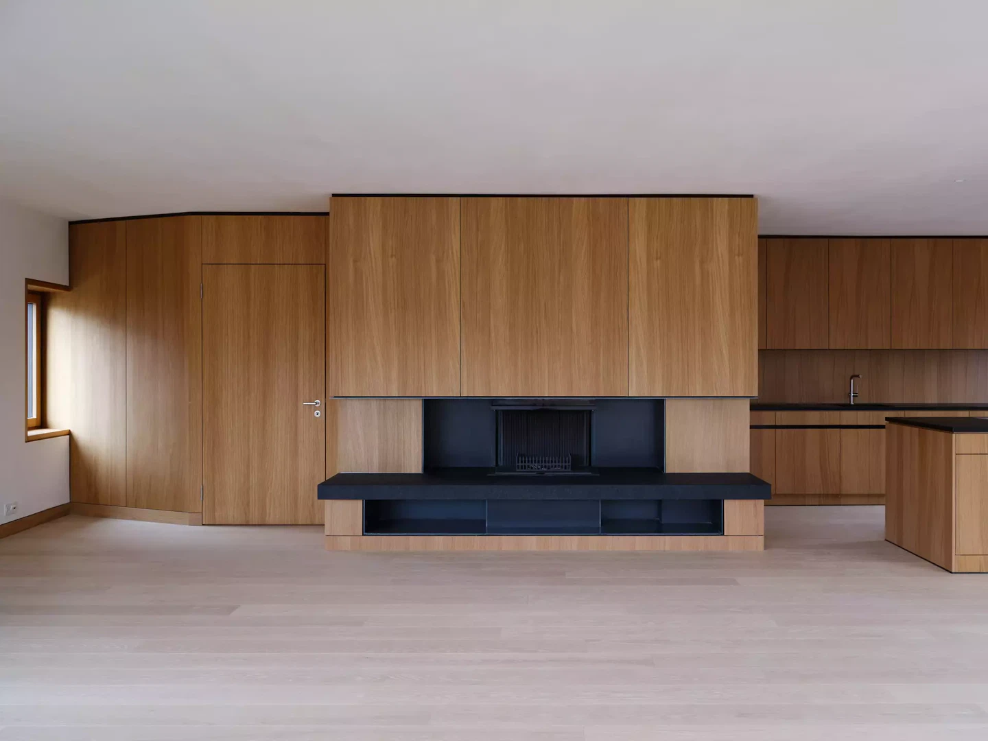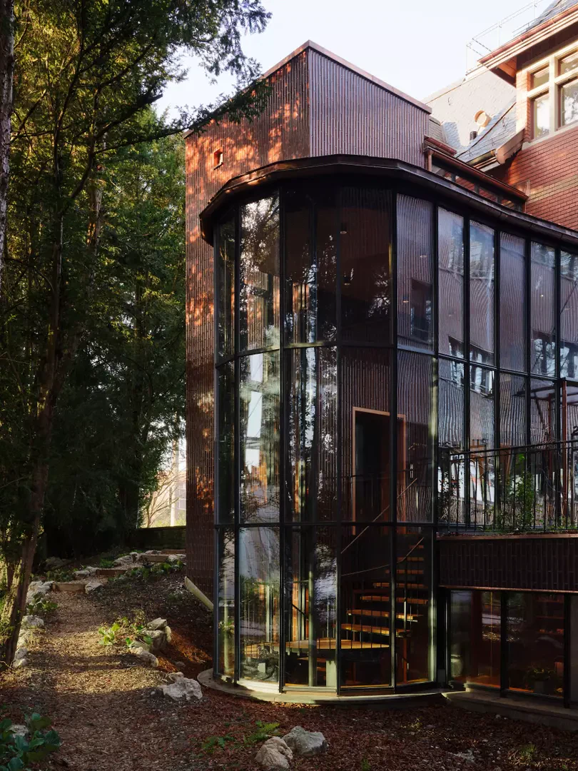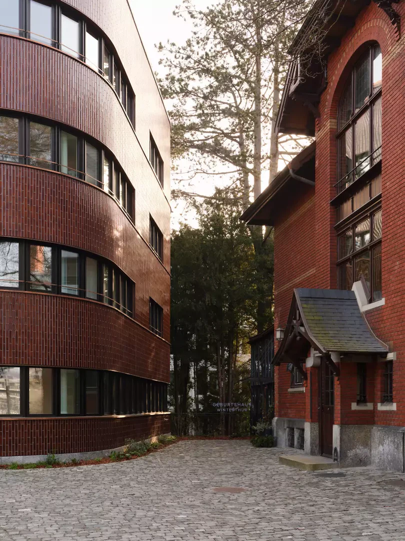 Der mächtige Granitsockel der Villa findet sein Gegenüber in reduzierter Ausführung am Neubau. Die Kupfereinfassungen der neuen Bandfenster referenzieren die antiken Dachrinnen der Villa. Die vertikal geschichteten Terrakottakacheln des Ergänzungsgebäudes spiegeln sich in den rötlichen Baumrinden der Eiben und Föhren im Ostgarten und reflektieren den Farbton der Villa Lindeneck. Sie vereinen die beiden Gebäude als Ensemble, ohne sich gegenseitig zu konkurrenzieren. Die Villa ist über ein verglastes Treppenhaus mit Bettenlift direkt mit der Geburtsabteilung im Ergänzungsgebäude verbunden. Hier befinden sich auf Parkniveau eine medizinische Nutzung und in den oberen Geschossen Praxen und vier weitere Wochenbett- oder Personalzimmer sowie eine hochwertige Stadtwohnung mit Dachgarten. In der Villa selbst befinden sich im Erdgeschoss die Aufenthaltsräume, die Küche und der Empfang. In den Obergeschossen sind in den historischen Zimmern sechs Wochenbettzimmer eingerichtet. Das prägnante dreieckige Grundstück mit seinem historischen Villengarten wird gegen die Bahn mit einer Schallschutzmauer neu gefasst und förmlich lesbar gemacht. Gleichzeitig inszeniert der räumlich vergrösserte nördliche Garten die Villa und gibt ihr die nötige Öffnung für die Eingangssituation. Die Villa Lindeneck wurde durch den Rückbau des Frühstückszimmers und der Garage aus den Jahren 1927 und 1933 wieder in ihrer ursprünglichen Form von 1897 lesbar gemacht.