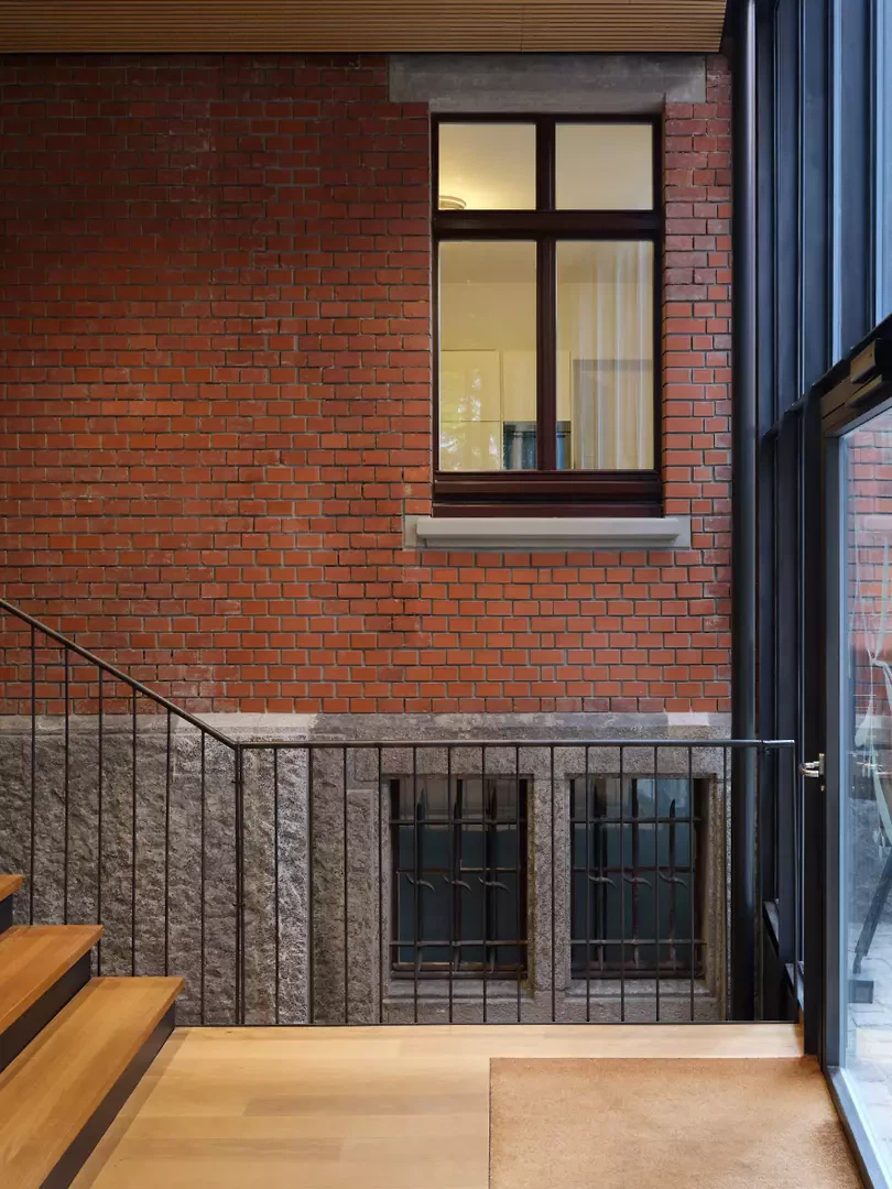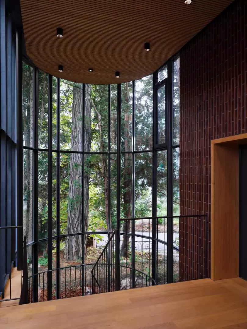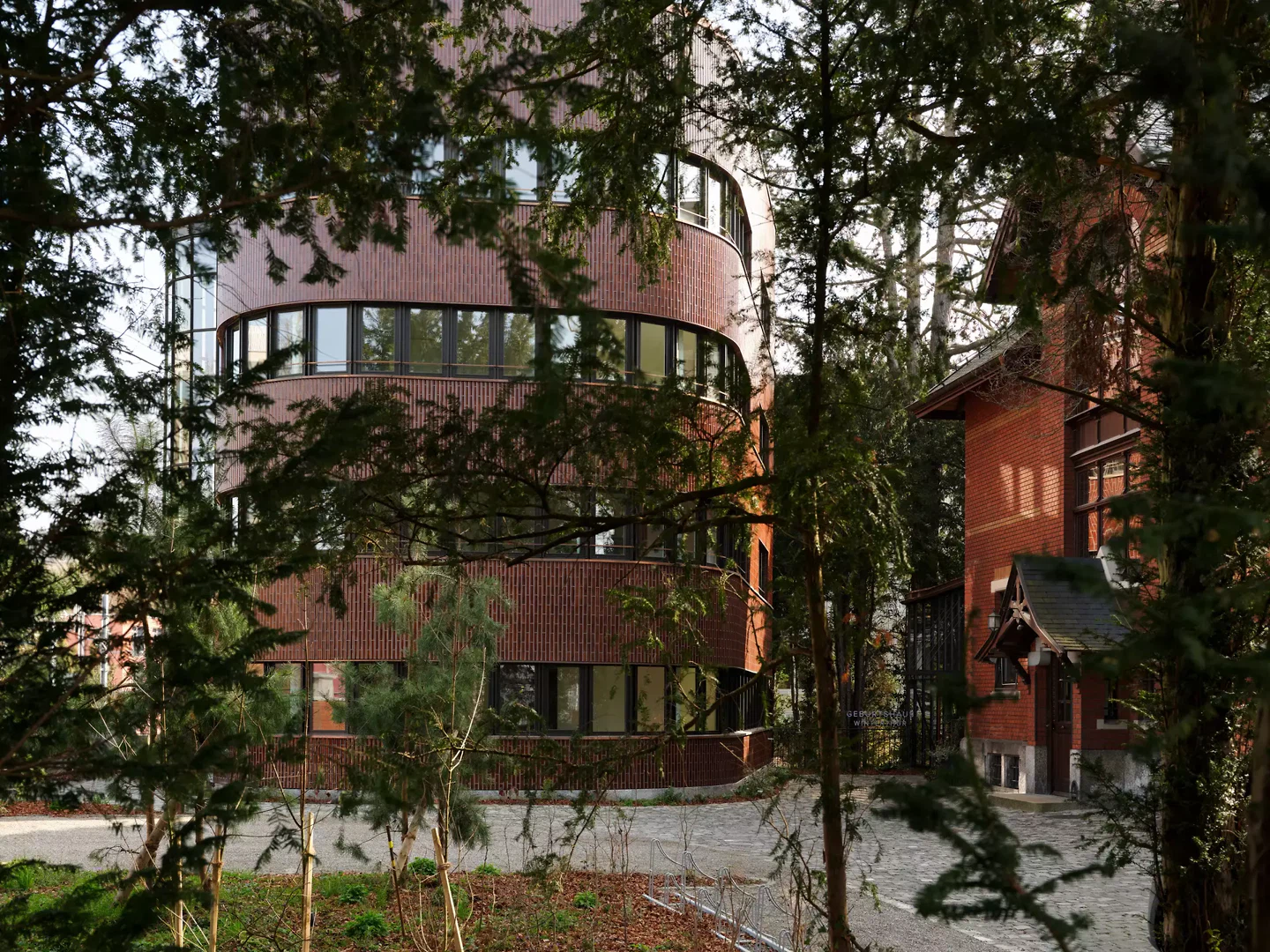 Die Umgebung der Villa und des Geburtshauses wird geprägt von einem geschützten Altbaumbestand auf gereiftem Boden dank jahrzehntelangem Laubeintrag. Die historischen Pflanzungen wurden epochengetreu wiederhergestellt und mit trockenheitstoleranten, standortgerechten Arten ergänzt. Durch eine sanfte Geländemodellierung wie auch über unterirdische Schotterrigolen gelangt das Dachwasser gezielt zu den Altbäumen. Die historische Natursteinpflästerung blieb, wo möglich, erhalten und wurde sorgfältig geschützt. Die ungebundenen Bauweisen der Beläge ermöglichen die lokale Versickerung des Regenwassers, womit der gesamte Garten den Grundsätzen der Schwammstadt und der Kreislaufwirtschaft entspricht. Das Grundstück erhielt im Norden einen neuen Mauerabschluss zur Bahnlinie hin – gestalterisch als repräsentative Weiterentwicklung der bestehenden historischen Einfassungsmauer konzipiert und in Klinker und Naturstein ausgeführt. Als prägnanter Abschluss der Parzelle fasst sie das Ensemble räumlich und verleiht dem Gesamtbild Geschlossenheit und Bestand. Der Dachgarten des Ergänzungsgebäudes wurde nach den Prinzipien der Schwammstadt gestaltet, was sowohl den Wasserhaushalt des Grundstücks als auch das urbane Mikroklima positiv beeinflusst. Der begrünte Dachgarten fügt sich dabei in das Bild des umgebenden Villengartens ein – das Ergänzungsgebäude wird so nicht nur räumlich, sondern auch ökologisch als Teil des Grüngürtels lesbar.