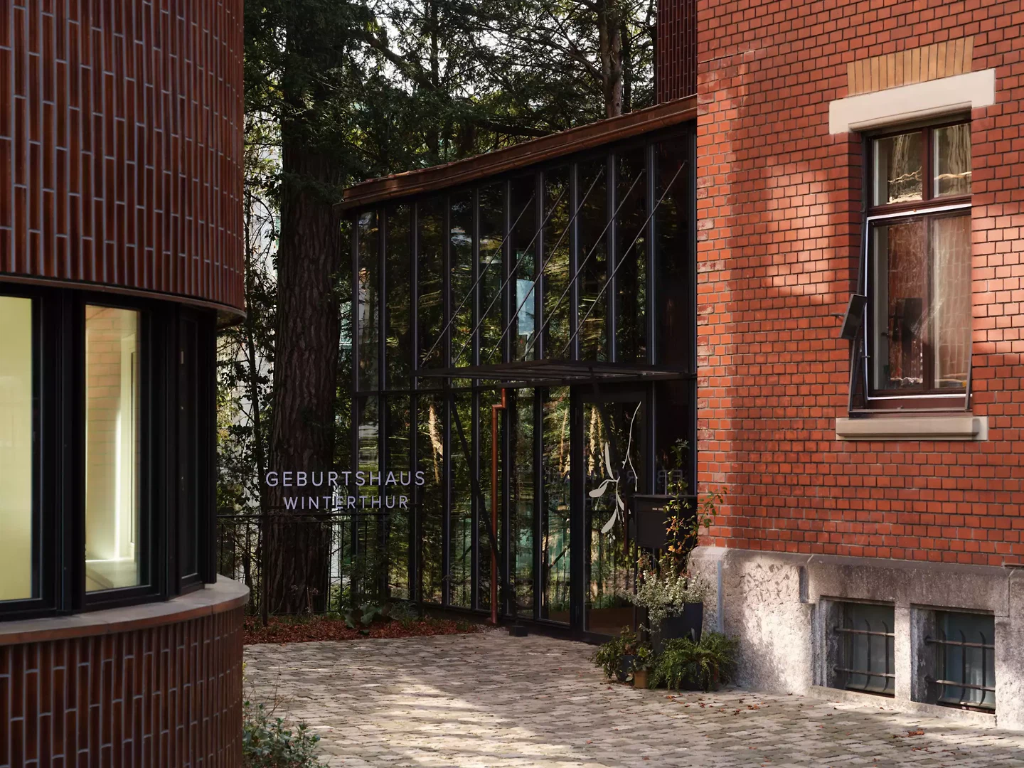 Über die alte Kopfsteinpflästerung betritt man den Park und vor einem öffnet sich das Ensemble Villa Lindeneck und Neubau. Die glasierte Oberfläche des Neubaus setzt ein gleichermassen bescheidenes wie auffälliges Zeichen zum matt-rötlichen, alten Backstein der Villa Lindeneck. Zwischen diesen beiden Körpern spannt sich ein Aussenraum auf, der zum Eingang der Geburtsabteilung führt. Der Zugang zum Neubau hingegen ist mit Absicht so positioniert, dass er beim Betreten des Gartens nicht sichtbar ist. Er liegt auf der rückwärtigen Seite und bewusst zurückgenommen, um den Fokus gezielt auf die Villa zu lenken.