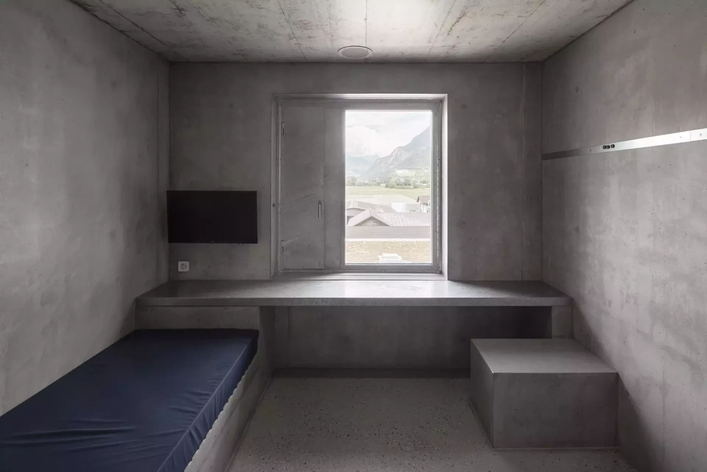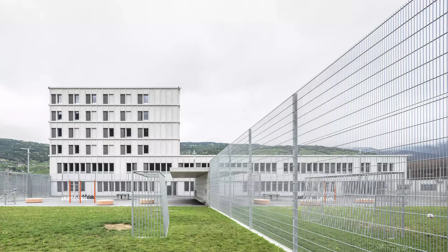 Das Projekt bestand darin, die neuen Hafträume zu errichten und gleichzeitig den Betrieb auf dem Gelände während der Bauarbeiten aufrechtzuerhalten. Das Programm ist in zwei separate Gebäude unterteilt: das Hauptgebäude mit 80 Zellen (Hochsicherheit) und ein Nebengebäude mit 24 Zellen (halboffene Haft). Das Hauptgebäude besteht aus einem horizontalen Sockel mit zwei Ebenen, in dem sich der Haupteingang, die Verwaltung, die Küche, Speisesäle und Behandlungsräume befinden, sowie einem erhöhten Teil mit vier Etagen, die jeweils 20 Zellen enthalten. Die vier Etagen gruppieren sich um einen zentralen Kern mit Aufzügen, Treppen, Duschen usw. Die Zellen liegen am äußeren Rand und sind über einen Flur erschlossen, der zugleich Aufenthaltsbereiche schafft. Die Anordnung der Zellen bietet eine gute Aussicht in die umgebende Landschaft. Eine regelmässige vertikale Gliederung strukturiert die Fassaden und definiert die Verteilung von verglasten und geschlossenen Flächen. Diese Elemente bestehen aus faserverstärktem Beton. Die Struktur erlaubt eine versetzte Anordnung der Öffnungen, ohne das Gleichgewicht der Fassade zu stören. Allen Insassen wird ein Ausblick in die Landschaft ohne die Sicht versperrende Gitterstäbe ermöglicht. Die geschlossenen Flächen bestehen aus Platten aus faserverstärktem Beton, während die verglasten Flächen aus einem fixen Teil und einem Öffnungsflügel aus verzinktem Stahl bestehen. Das Projekt mit Umgebung und Nebengebäuden wird noch bis 2027 fortgeführt.