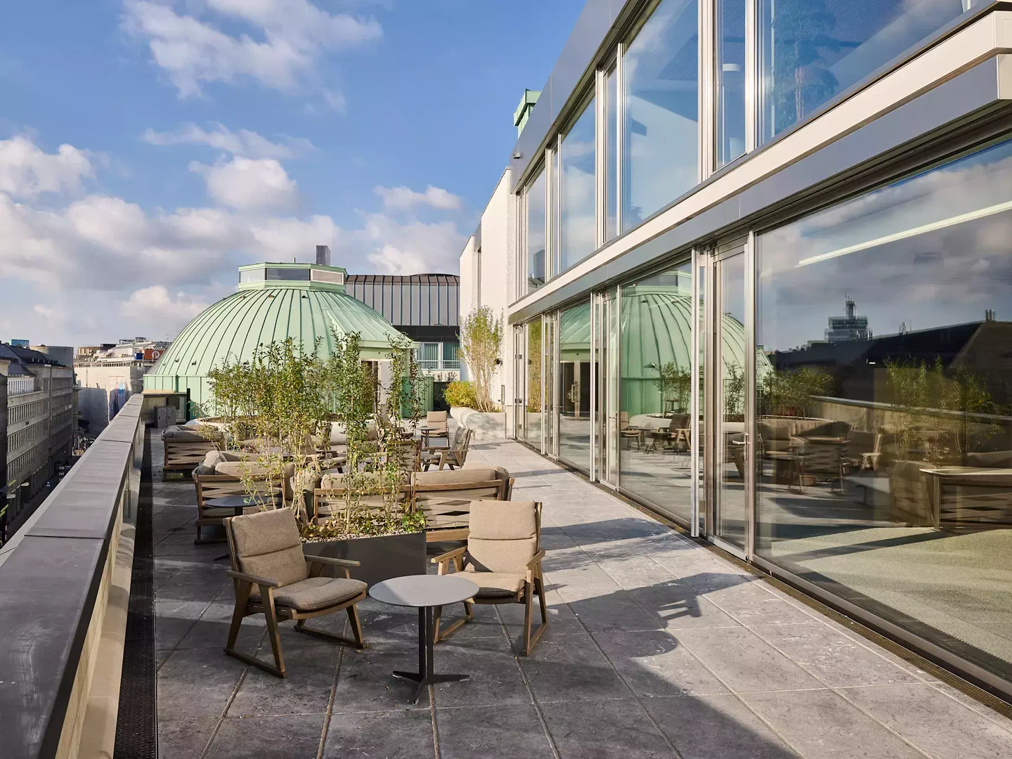 Der Eingang an der Bahnhofstrasse führt zum repräsentativeren der beiden peripher angeordneten Erschliessungskerne, welche die dienenden Funktionen bündeln. Von hier aus gelangt man in die grosszügigen, von ACPV Architects und Archipel offen gestalteten Officebereiche der oberen Geschosse einschliesslich der Dachterrasse. Banker*innen eilen vorbei und verschwinden im Aufzug, dessen elegant materialisierter Vorraum den zurückhaltend edlen Ausdruck des Hauses gleich beim Betreten spürbar macht. Die Bewegung durch das betont luftige Treppenhaus ist ein fast meditatives räumliches Erlebnis. Die weissen Äderungen der schwarzen Saint-Michel Kalksteine auf den Stufen und Wänden erinnern an Reflexionen auf Wasseroberflächen, die Maserungen des honigfarbenen italienischen Olivenholz-Furniers an den Handläufen wirken beinahe ornamental und grosse handgefertigte Glasleuchten verströmen ein gedämpftes Licht. Wegführung, Blickbezüge und Proportionen etablieren eine subtile Hierarchie, die leise an die Pracht der ehemaligen Börse erinnert. Der Eindruck von Grosszügigkeit wird dabei jedoch nicht über Dekor erreicht, sondern aus der sorgfältigen Abstimmung von Raumhöhe, Lichtführung und Materialität. Parallel dazu spannt sich im Sockel und Untergeschoss auf rund 4000 Quadratmetern ein mehrgeschossiger Geschäftsbereich des Luxuskaufhauses Bongénie auf, der vom Genfer Intérieur- und Architekturbüro Version B gestaltet wurde. Die angeschlossene Gastronomie stammt aus der Feder der Pariser Gestalter*innen Maison Sarah Lavoine. Erschlossen wird er über zentral angeordnete Rolltreppen und einen Lift. Ein Mezzaningeschoss verzahnt die Ebenen zudem räumlich. Vom darüberliegenden Atrium belichtet, entstehen Sichtbeziehungen über mehrere Geschosse hinweg – eine Sequenz, die den Raum nicht nur im Inneren, sondern auch zum Strassenraum hin durchlässig erscheinen lässt.