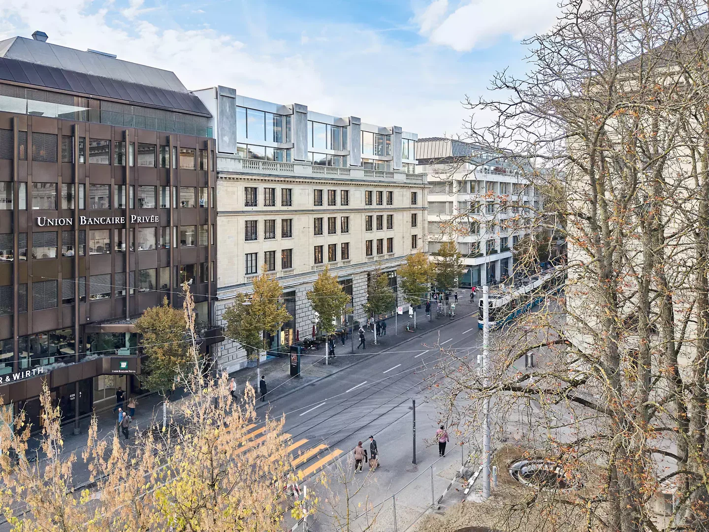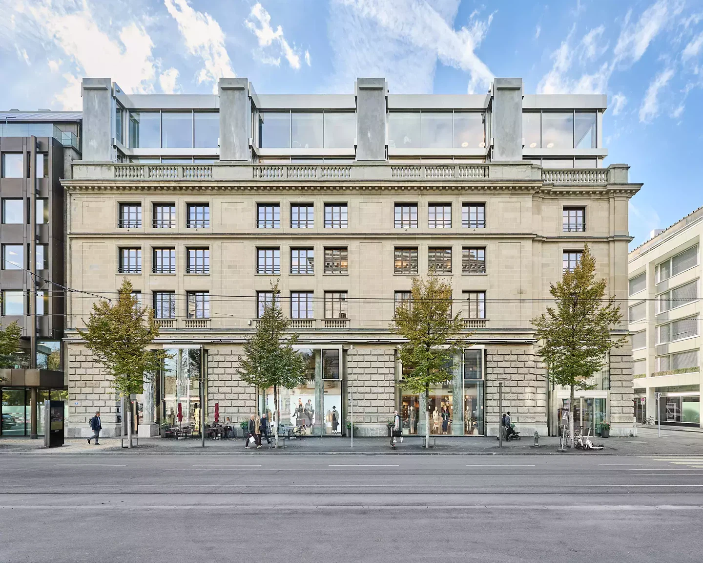 Lange litt das an der Bahnhofstrasse 3 vis-à-vis vom Bürkliplatz gelegene Geschäftshaus – 1880 als erste Zürcher Börse errichtet und seither vielfach überformt – unter einer unzureichenden Einbindung in seinen repräsentativen Kontext. Mit der jüngsten Transformation hat Studio Märkli die stadträumlichen Bezüge präzise nachjustiert: Aus der Logik der denkmalgeschützten Fassaden heraus weitergeführt, hat der Bau wesentlich an Kraft und Ausdruck gewonnen.