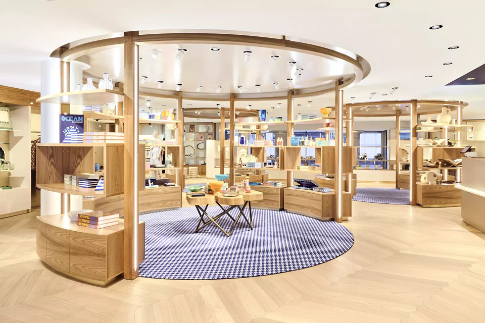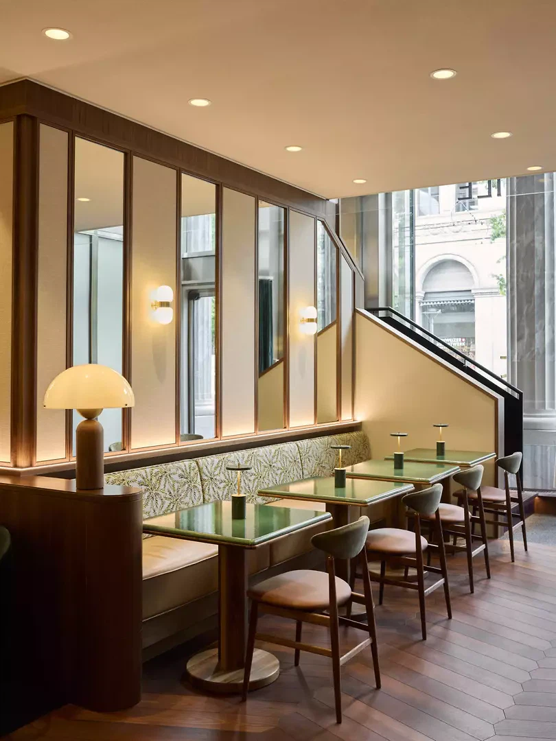 Der Eingang an der Bahnhofstrasse führt zum repräsentativeren der beiden peripher angeordneten Erschliessungskerne, welche die dienenden Funktionen bündeln. Von hier aus gelangt man in die grosszügigen, von ACPV Architects und Archipel offen gestalteten Officebereiche der oberen Geschosse einschliesslich der Dachterrasse. Banker*innen eilen vorbei und verschwinden im Aufzug, dessen elegant materialisierter Vorraum den zurückhaltend edlen Ausdruck des Hauses gleich beim Betreten spürbar macht. Die Bewegung durch das betont luftige Treppenhaus ist ein fast meditatives räumliches Erlebnis. Die weissen Äderungen der schwarzen Saint-Michel Kalksteine auf den Stufen und Wänden erinnern an Reflexionen auf Wasseroberflächen, die Maserungen des honigfarbenen italienischen Olivenholz-Furniers an den Handläufen wirken beinahe ornamental und grosse handgefertigte Glasleuchten verströmen ein gedämpftes Licht. Wegführung, Blickbezüge und Proportionen etablieren eine subtile Hierarchie, die leise an die Pracht der ehemaligen Börse erinnert. Der Eindruck von Grosszügigkeit wird dabei jedoch nicht über Dekor erreicht, sondern aus der sorgfältigen Abstimmung von Raumhöhe, Lichtführung und Materialität. Parallel dazu spannt sich im Sockel und Untergeschoss auf rund 4000 Quadratmetern ein mehrgeschossiger Geschäftsbereich des Luxuskaufhauses Bongénie auf, der vom Genfer Intérieur- und Architekturbüro Version B gestaltet wurde. Die angeschlossene Gastronomie stammt aus der Feder der Pariser Gestalter*innen Maison Sarah Lavoine. Erschlossen wird er über zentral angeordnete Rolltreppen und einen Lift. Ein Mezzaningeschoss verzahnt die Ebenen zudem räumlich. Vom darüberliegenden Atrium belichtet, entstehen Sichtbeziehungen über mehrere Geschosse hinweg – eine Sequenz, die den Raum nicht nur im Inneren, sondern auch zum Strassenraum hin durchlässig erscheinen lässt.