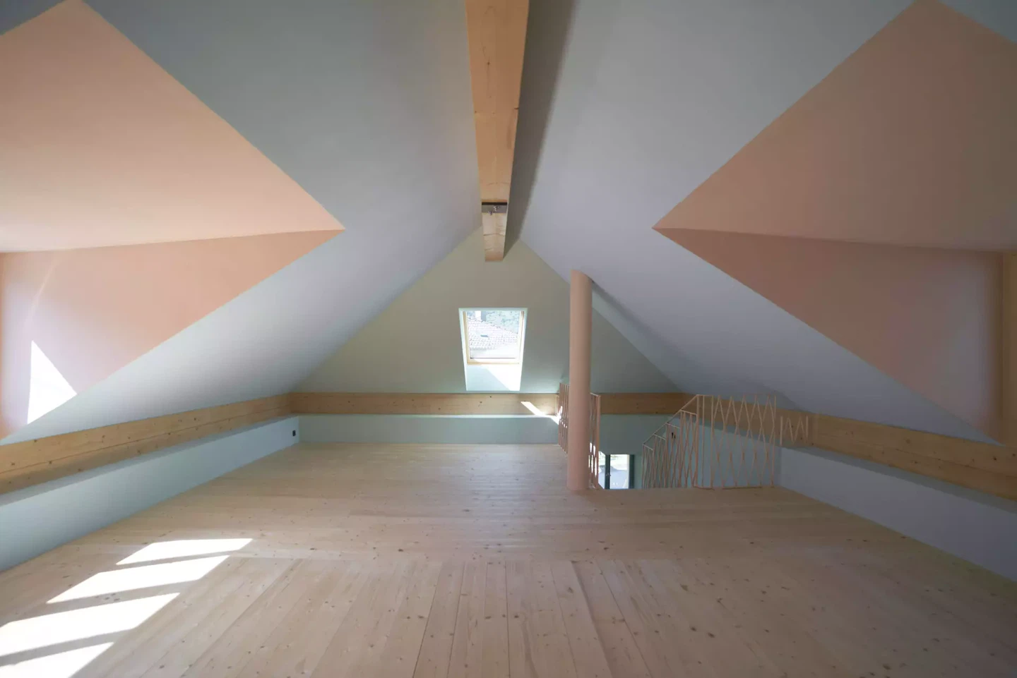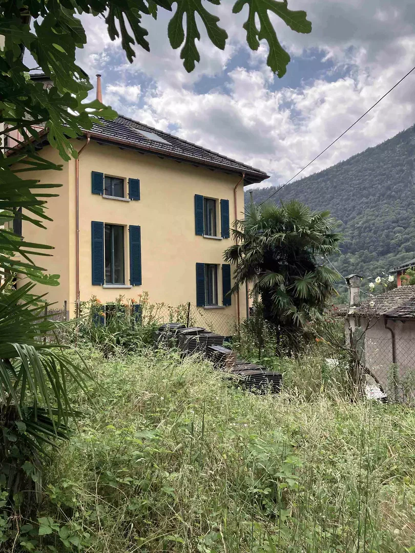 Das markante Tessiner Haus bildet den Abschluss einer Zeile dreier Häuser in einer verwinkelten Kernzone im Bleniotal. Das ortsbildprägende Haus (1909) wurde von zurückgekehrten Emigranten unter Einbezug eines viergeschossigen, schmalen Lagerhauses realisiert. In den 1970er-Jahren wurde es um einen zweigeschossigen Badanbau erweitert, der die Hauptfassade verstellte. Die 2025 vollendete Transformation stellt die Baustruktur wieder her und erneuert diese wo nötig. Die Qualitäten der ursprünglichen Substanz waren noch zu erkennen, jedoch grösstenteils unter Bauschichten verborgen. Die Themen Farbe, Licht und Bewegung standen bald im Vordergrund, um das Haus von der düsteren Materialität vergangener Eingriffe zu befreien. Durch den Rückbau des Anbaus wird die Westfassade wiederhergestellt, das Treppenhaus öffnet sich erneut zum Garten und empfängt Tageslicht. Das neue räumliche Konzept für die jahrelang unbewohnte Struktur ermöglicht flexible Nutzungsformen zwischen Gäste-, Wohn- und Atelierhaus. Das in den 1970er-Jahren erneuerte Walmdach konnte aufgrund seiner mangelhaften konstruktiven Ausführung nicht erhalten werden. Die Dachgeometrie wurde neu aufgebaut, gedämmt und mit Indach-Solarmodulen versehen. Durch den Abbruch der trennenden Wand und der Integration zweier Lukarnen sowie eines Dachfensters kann der Dachraum nun als grosszügiger, gut belichteter Gemeinschafts- oder Atelierraum mit Blick in die Bergwelt genutzt werden. Die Gestaltung ist geprägt durch den Einsatz bewährter Materialien wie Holzdielen und Kalkputz, die Wiederverwendung bestehender Bauteile in neuem Kontext sowie den Einsatz neuer Elemente. Alle bestehenden Türen wurden erhalten und farblich adaptiert – ehemalige Fenstergitter wurden zu Treppengeländern transformiert. Zeitgemässe energetische und klimatechnische Massnahmen wurden subtil integriert. Die Farb- und Materialwechsel sind inspiriert von jenen des Tals.
