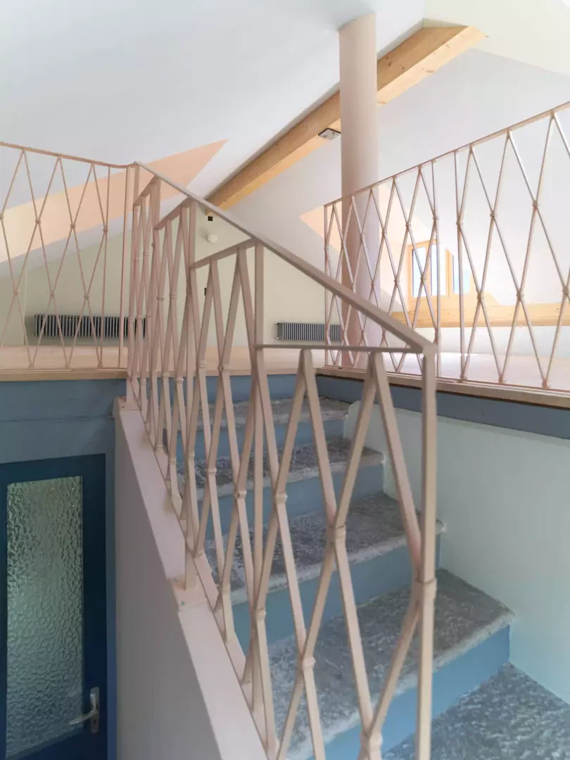 Neuer Dachraum Wiederhergestellte Fassade Indach-Solarmodule Treppe in den Dachraum Fenstergitter wurden zu Geländern transformiert Kompaktes Bad Türen wurden erhalten und farblich integriert Farben, Stuck und Holzdielen wurden wiederhergestellt Feiner Kalkputz Ehemaliges Lagerhaus Zusammenspiel von Farbe, Material und Licht