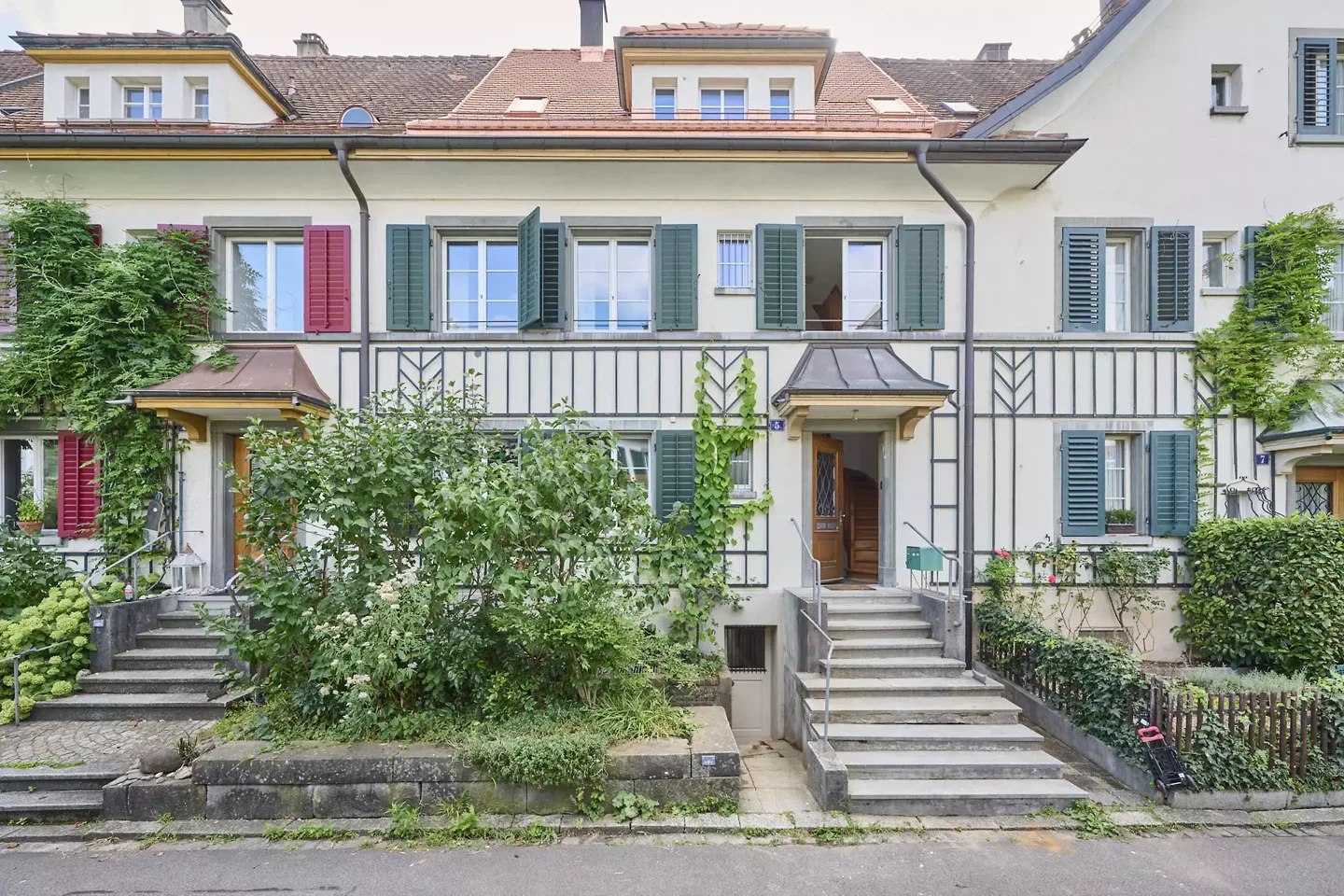 In der inventalisierten Wohnsiedlung in Zürich Wollishofen ist das Reihenhaus aus den 1920er-Jahren ein Beispiel des romantisch geprägten Heimatstils. Die Siedlung bildet einen geschlossenen Wohnhof mit Vorgärten, kurzen Treppenaufgängen und einer homogenen Erscheinung in Volumetrie, Materialwahl und Farbigkeit.
