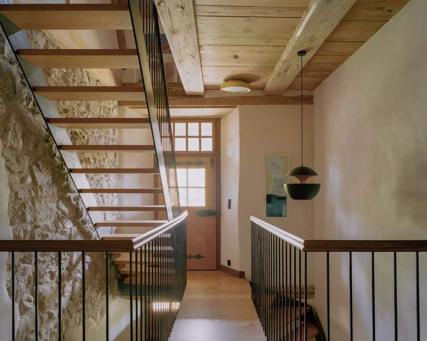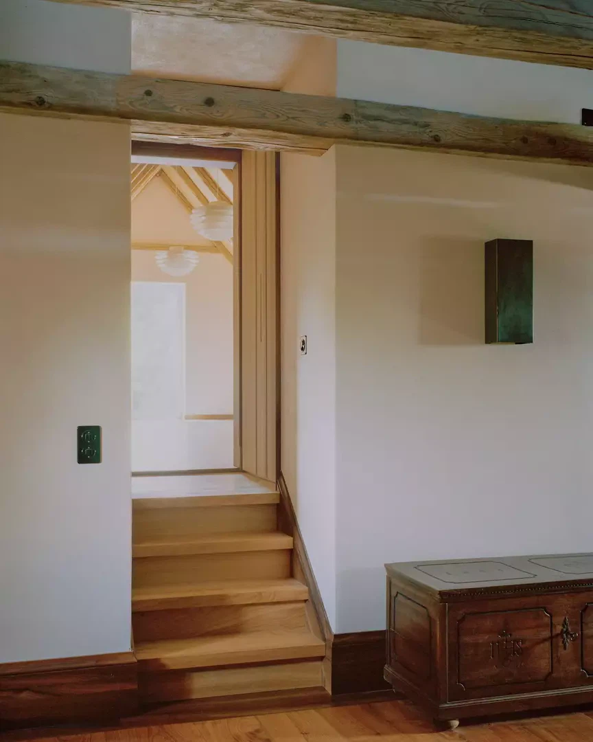 Im Inneren wurden die Gebäudeteile auf jedem Geschoss miteinander verbunden. Ein neuer Durchbruch in der bestehenden Bruchsteinmauer erschliesst den ehemaligen Ökonomieteil vom Vorraum des 2. Obergeschosses aus. Der Rückbau der Kehlbalkenlage macht den imposanten Dachraum der Scheune wieder erlebbar. Das Treppenhaus wurde vom Erdgeschoss bis ins Dachgeschoss vereinigt und mit einer neuen Treppe aus Schwarzstahl mit Tritten aus Kirschbaum ausgestattet. Die damals geschlossene Küche öffnet sich neu zum Essbereich im Tenn. Die Bodenbeläge aus massivem Kirschbaum mit Nussbaumfriesen in den Wohnräumen und Guntliweider Hartsandstein in Küche, Bädern und Wellnessbereich setzen ein durchgehendes Materialbild. Neue Türen nehmen als konstruktive Neuinterpretation die Materialität der historischen Futtertüren aus Nussbaum auf. Verputzflächen erhielten einen mit Naturpigmenten eingefärbten hydraulischen Kalkputz, der ohne Farbanstrich belassen wurde. Alle historisch wertvollen Bauteile, Kachelöfen, Tonplattenböden, Schrankeinbauten, Wandtäfer und Türen blieben dabei vollständig erhalten und erhielten lediglich eine Auffrischung der Oberflächen.