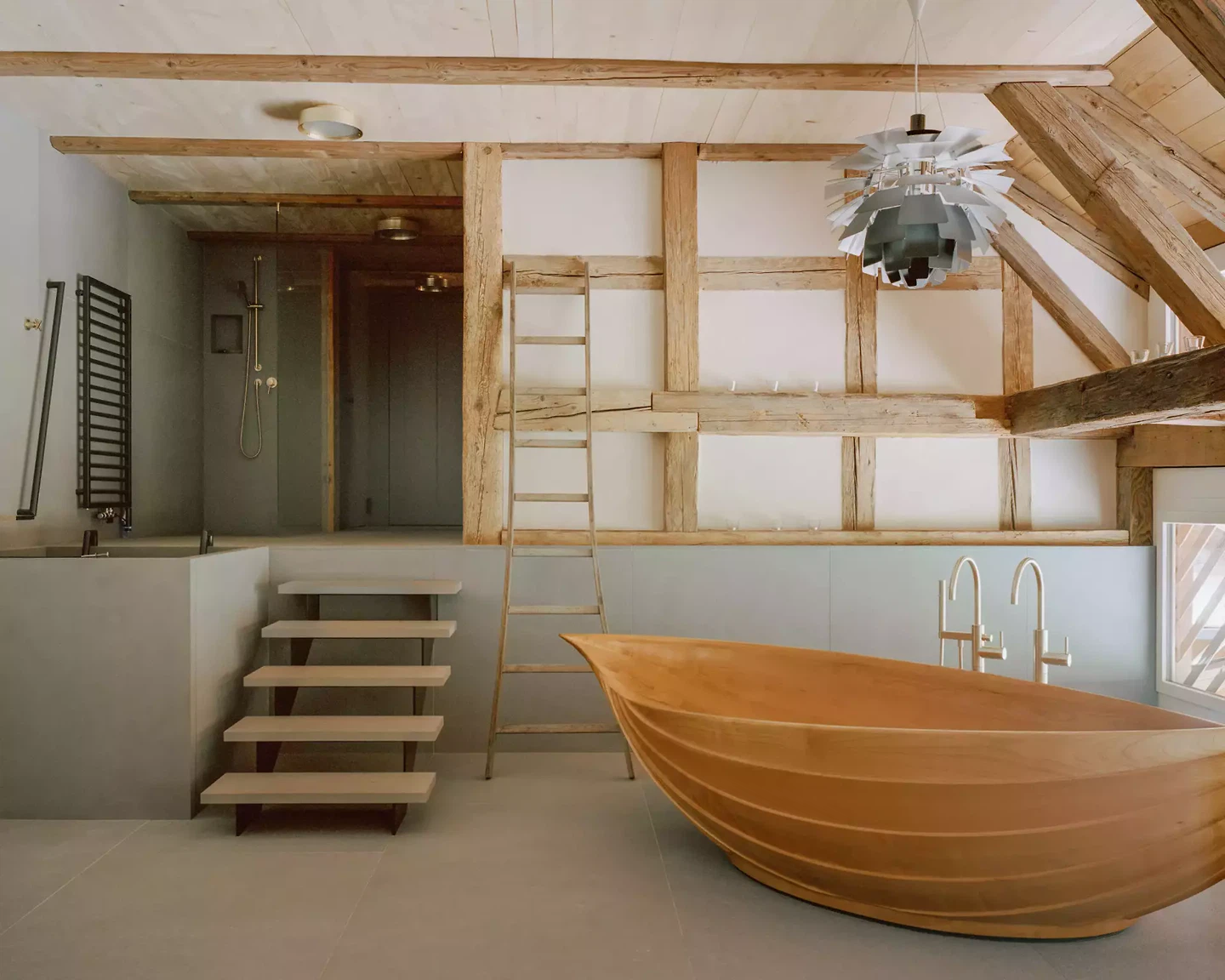 Der räumlich markanteste Eingriff ist der Wellnessbereich im Dachraum des ehemaligen Scheunenteils. Der freigelegte Dachstuhl und die Holzbadewanne als skulpturales Element unter den alten Balken machen deutlich, dass hier der Kontrast zwischen historischer Struktur und zeitgenössischer Nutzung nicht aufgelöst, sondern bewusst gehalten wird.