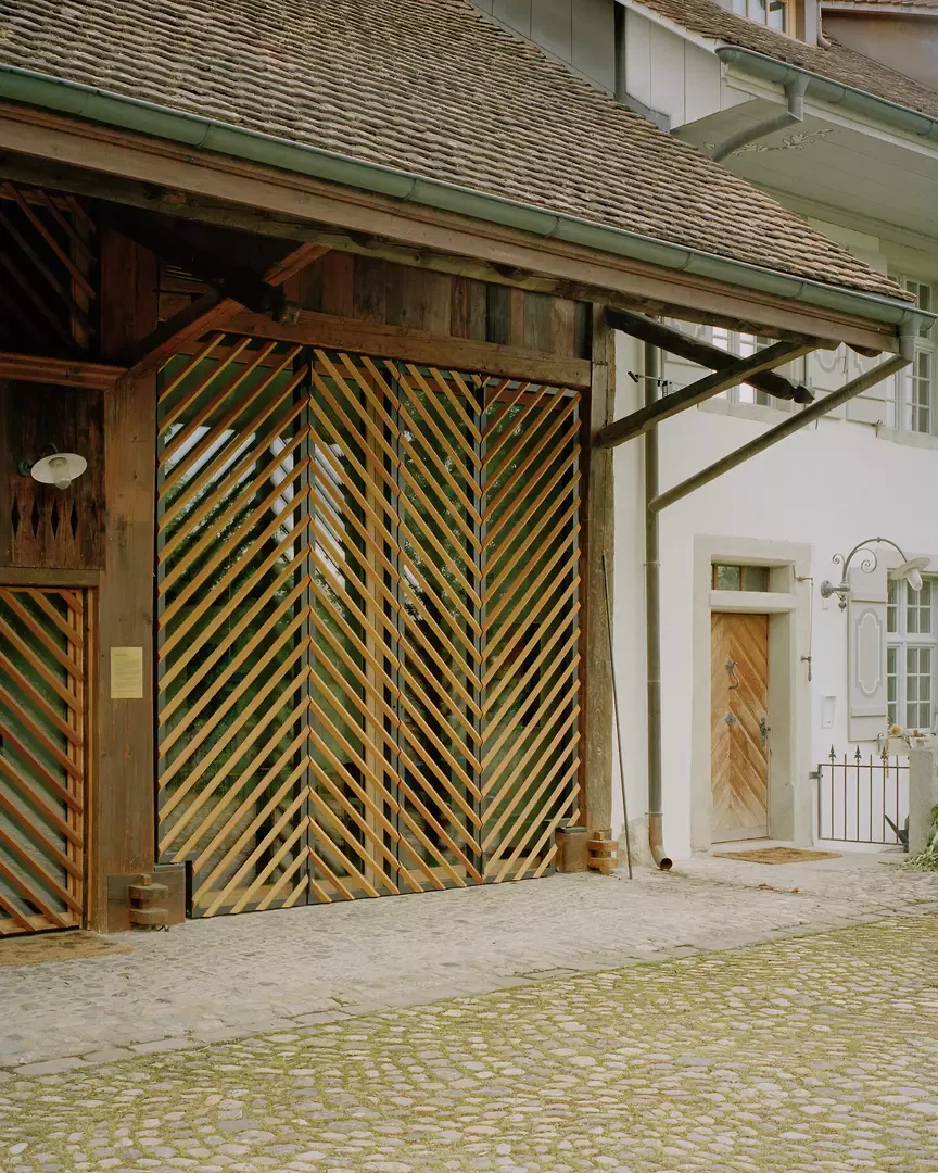 Der Bestand selbst gab den Rahmen vor. Der Wohnteil blieb äusserlich beinahe unverändert. Nord- und südseitig wurden je drei neue Schleppgauben anstelle von zwei kleineren gesetzt, was die Symmetrie der Fassade harmonisiert und die Belichtung des Dachgeschosses verbessert. Im Scheunenteil wurde die Fassade im Küchenbereich mit neuen Verglasungen hinter diagonalen Holzlamellen geöffnet. Die bauzeitliche Toreinfassung des Tennbereichs wurde rekonstruiert und mit innenliegenden Holzglastoren versehen, die sich typologisch an den ursprünglichen Holztoren orientieren. Ein vorgelagertes Falttor mit diagonaler Schalung reduziert den Glasanteil optisch und vermittelt zwischen alter und neuer Schicht. An der westlichen Giebelfassade wurde ein bestehendes Fenstergewände nach unten verlängert und als französisches Fenster ausgebildet, um den Blick auf den Teich freizugeben.