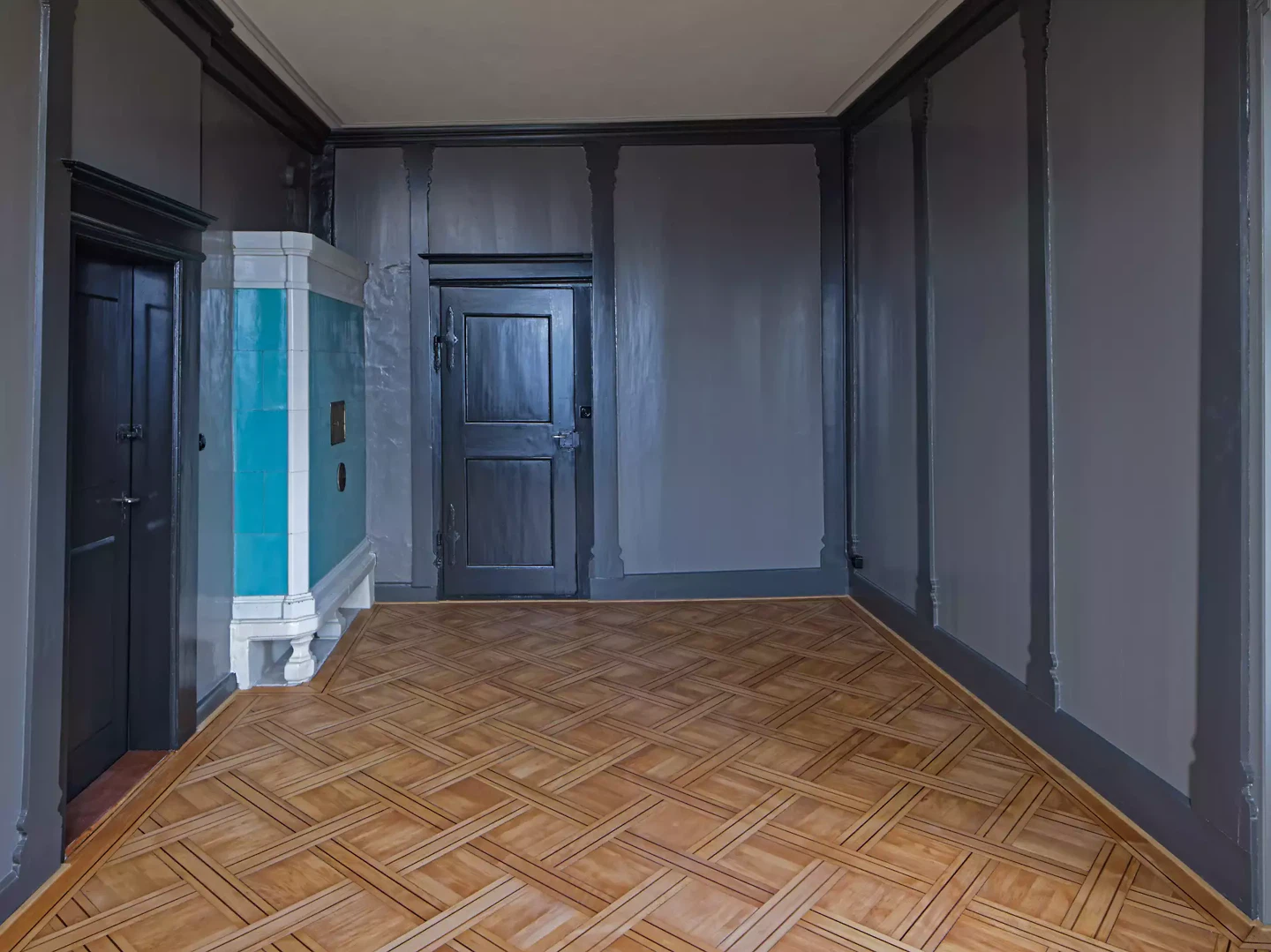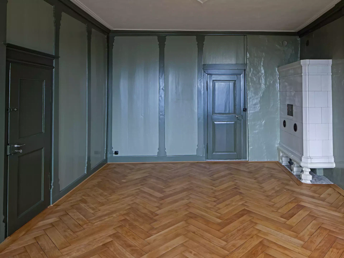 Was dieses Projekt von einer reinen Sanierung unterscheidet, ist der Umgang mit dem, was nicht verändert wurde. Die Entscheidung, wo nicht einzugreifen, war ebenso entwurfsprägend wie die Massnahmen selbst. Das zeigt sich am deutlichsten in den Südzimmern. Die Wandtäfer und Einbauschränke aus dem 18. Jahrhundert wurden abgelaugt und mit Leinölfarbe behandelt. Das Farbkonzept basiert auf Sondierungen, die die originalen Farbtöne schichtweise freilegten. Jedem Raum wurde eine eigene Farbkombination zugewiesen, die Enfilade der Südzimmer wird zur Abfolge kräftiger, aufeinander abgestimmter Farbtöne. Dieses Vorgehen verbindet denkmalpflegerische Methode mit einem räumlichen Erlebnis.