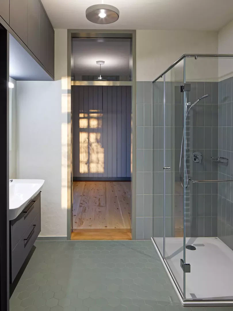 Vor dem Umbau diente das Gebäude als Wohnhaus für eine Pfarrfamilie, angelegt als Acht-Zimmerwohnung über beide Geschosse. In einer sich wandelnden kirchlichen Landschaft entschied sich die Bauherrschaft in Absprache mit den Denkmalbehörden für eine Aufteilung in zwei eigenständige Geschosswohnungen, eine Drei-Zimmerwohnung im Erdgeschoss und eine Fünf-Zimmerwohnung im Obergeschoss. Eine über Jahrhunderte gewachsene Struktur bringt ihre eigene Hierarchie mit: die repräsentativen Südzimmer mit Enfilade, Täfer und Kachelöfen auf der einen Seite, die nördliche Erweiterung von 1725 mit den Nebenräumen auf der anderen. Der Entwurf nimmt diese Gliederung auf und schreibt sie fort. Alle neuen Einbauten wurden im nördlichen Gebäudeteil gebündelt. Im Erdgeschoss wurde der Raum der alten Küche verkleinert, um ein Reduit mit allen Anschlüssen für eine spätere Ergänzung einzurichten. Im Obergeschoss nahm der geräumige Korridor die neue Küche auf, wodurch Platz für eine zusätzliche Nasszelle zwischen den östlichen Nebenzimmern gewonnen wurde, ohne die originale Wohntypologie wesentlich zu verändern. Die Südzimmer blieben von funktionalen Eingriffen weitgehend verschont.