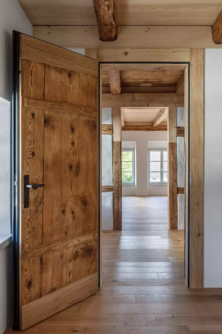 Die Schutzauflagen der Dorfzone zwangen das Planungsteam, bestehende Strukturen eingehend zu studieren, Materialien sinnvoll weiterzuverwenden und den Bestand als eigentliche Grundlage des Entwurfs zu begreifen. Unter jüngeren Verkleidungen kamen profilierte Balken und historische Brettertüren zum Vorschein, die ertüchtigt und bewusst als prägende Gestaltungselemente integriert wurden, weil der Bestand nicht als Hindernis, sondern als Ausgangspunkt begriffen wurde. Das Projekt steht für den Ansatz, Gebäude aus ihrer eigenen Logik heraus weiterzuentwickeln: Der differenzierte Umgang mit Tragstruktur, Materialität und Ortsbildschutz macht deutlich, wie sich unter strengen Auflagen zeitgemässe Wohnqualität schaffen lässt, ohne den historischen Charakter zu überformen.