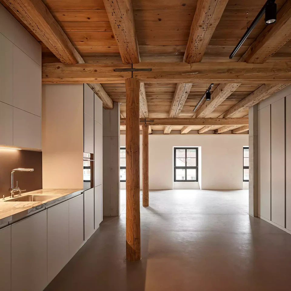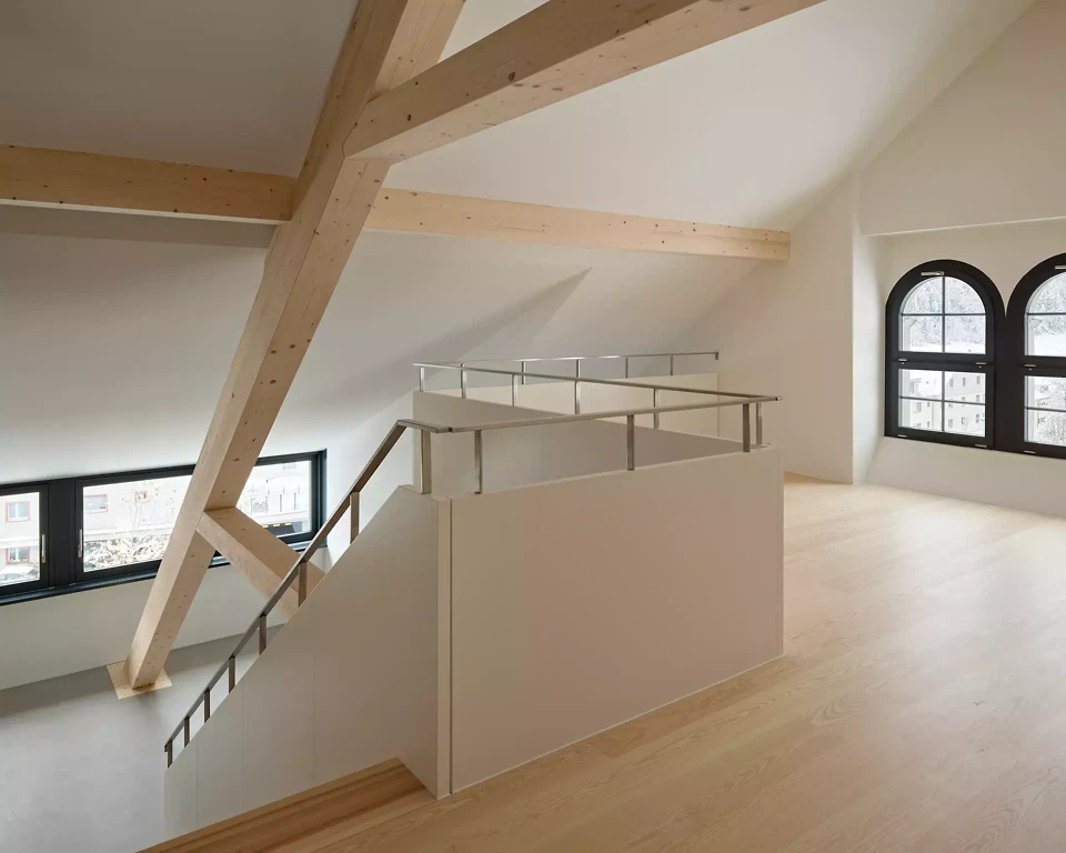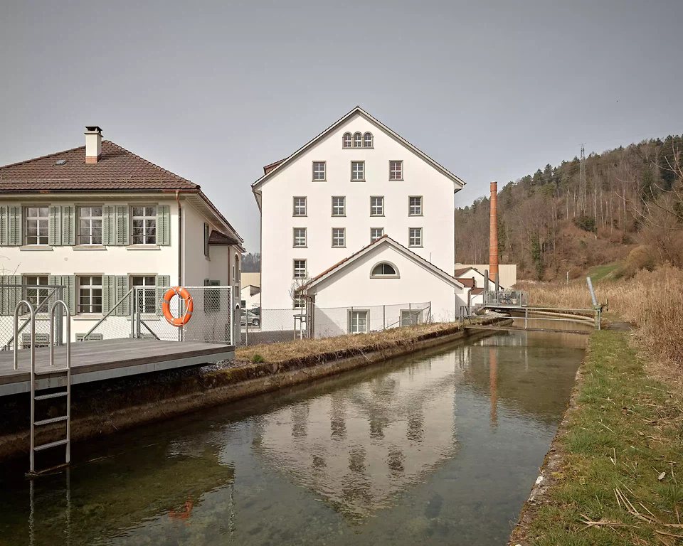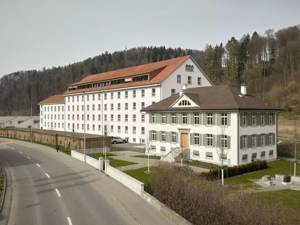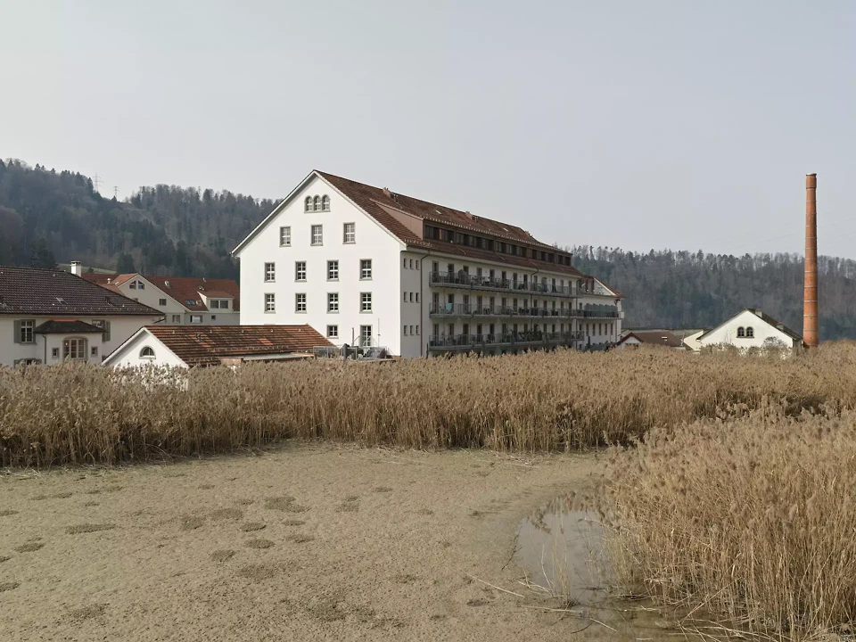 Wohnen am Weiher im Tösstal: Im Zuge der Umnutzung des Areals einer alten Spinnerei mit fantastischer, vorherrschender früherer Fabrikkonstruktion entstehen höchst vielseitige, spektakuläre Wohnungsgrundrisse. Loftwohnungen mit Holzfachwerkdecken bieten einen kunstvollen Industrie-Touch in den neuen Wohnräumen. Zusätzlich sind einmalige Wohnungs-Aussenräume geboten: Ob als Plattformen über dem Kraftwerkskanal, einer Balkonschicht zum Weiher oder mit Attika-Bandfenster zum Schieben, welche die Weite ins Innere der Umgebung holen. Dem Erscheinungsbild der alten Spinnerei von aussen und der Hallenkonstruktion von innen galt es den Vortritt zu geben, und die Entwurfsarbeit hatte sich dieser Prämisse unterzuordnen. Die eine langgezogene Lukarne konnte mit der Denkmalpflege mehreren kleineren vorgezogen werden, um ein ruhiges Dachbild selbstverständlich zu vermitteln und erst auf den zweiten Blick die neue Gestaltung erkennbar zu machen. Im Inneren sind Grundrisstypologien massgeschneidert umgesetzt, welche die Statik (Decke und Stützen) mit ihrem Raster in Szene setzen.
