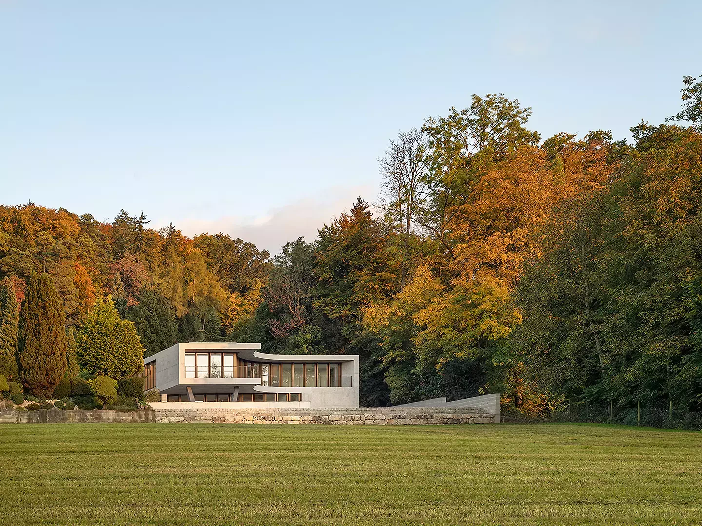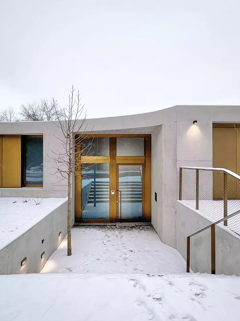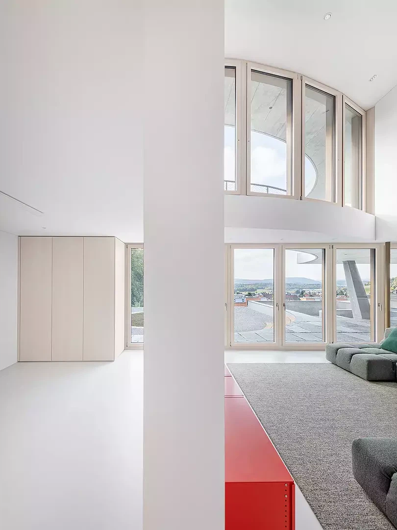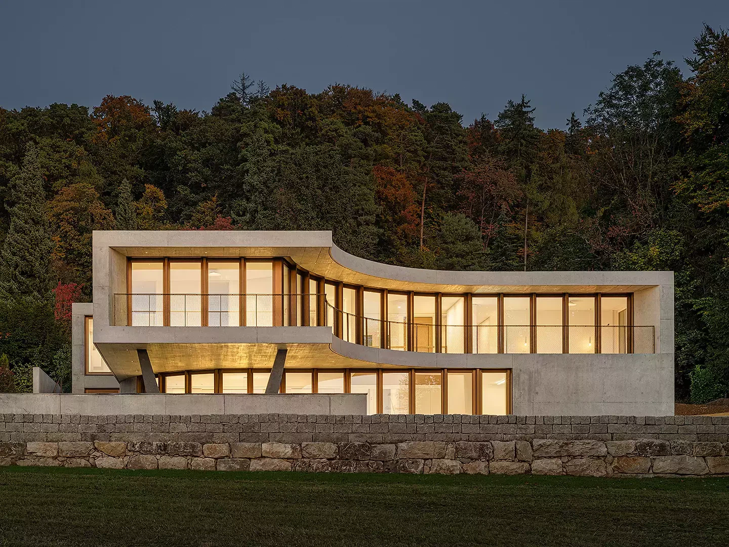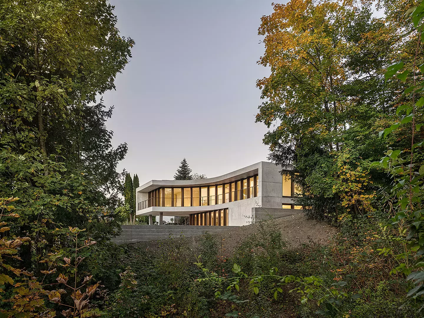 Das Winkelhaus ist das erste Soloprojekt des Architekturduos Angela Kurmann und Frederico Montanha in der Schweiz. Das Einfamilienhaus wurde mit dem Ziel entworfen, sich mit dem nahen Wald und dem weiten Blick ins Tal zu verbinden. So wurde das Gebäude sanft in Richtung beider Elemente – Wald und Aussicht – gebogen, um das Beste aus ihnen herauszuholen. Aufgrund seiner Form öffnen sich alle Räume zur Landschaft hin und ermöglichen es den Bewohner:innen, die Natur in allen vier Jahreszeiten zu erleben. Mit grossem Respekt in das Gelände eingebettet, tragen Erdreich, Solaranlage und Erdwärme zu einem ausgeglichenen Raumklima und hoher Energieeffizienz bei. Eine konzeptuelle Umgebungsgestaltung lässt den rohen Betonbau behutsam in die natürliche Umgebung übergehen – als wäre er schon immer Teil dieser Landschaft gewesen.