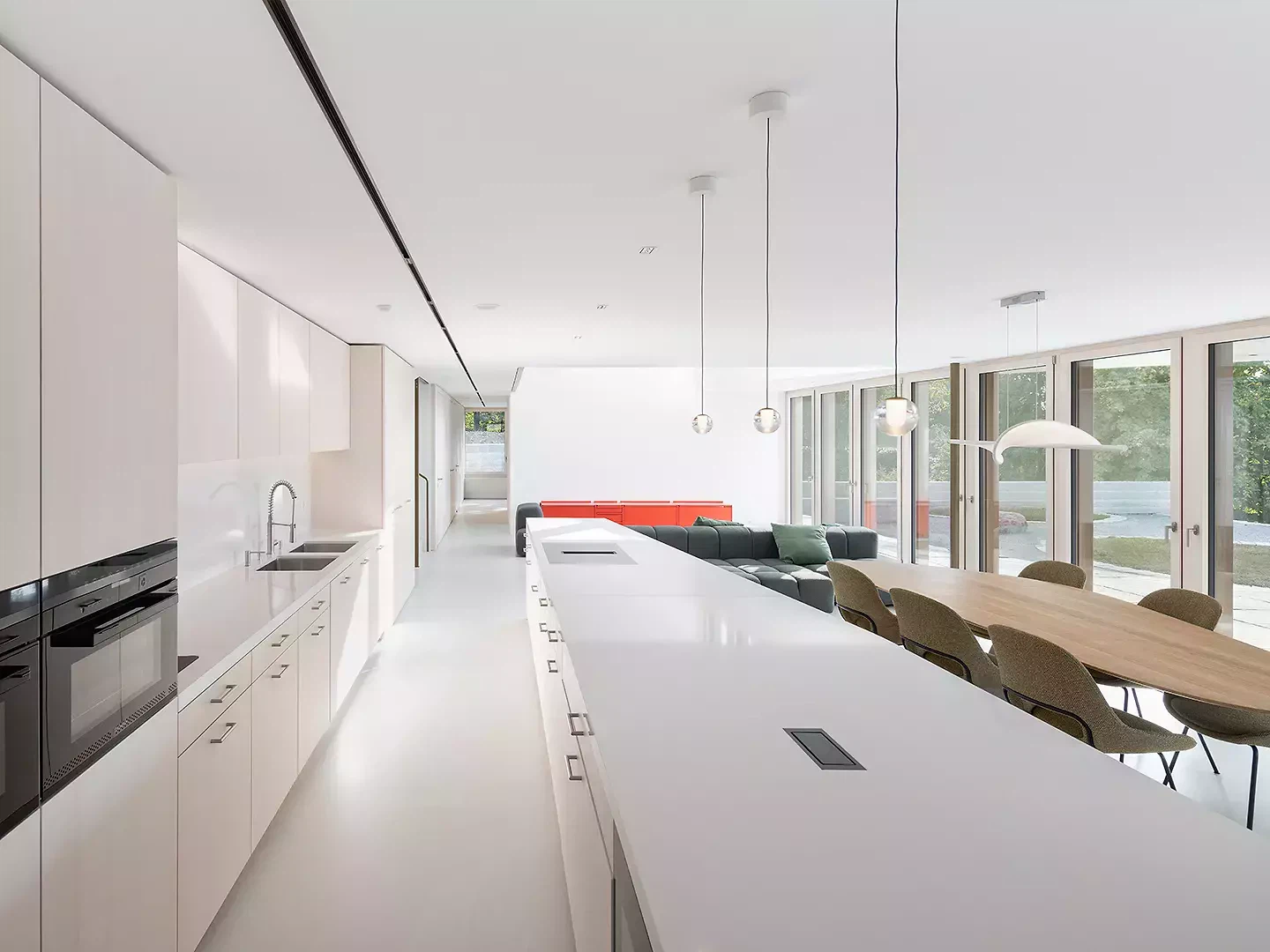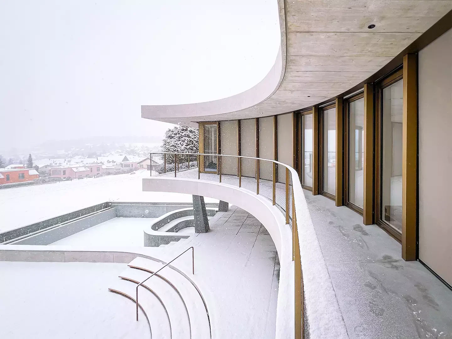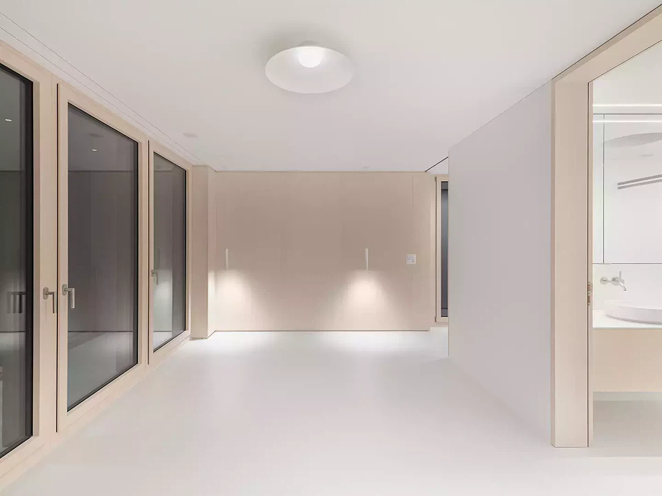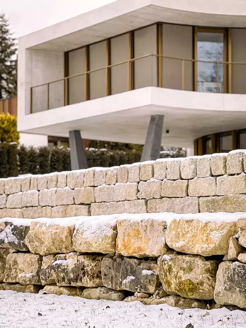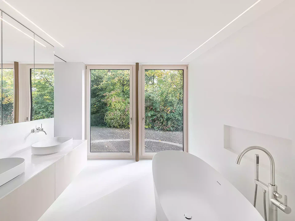 Das Winkelhaus ist das erste Soloprojekt des Architekturduos Angela Kurmann und Frederico Montanha in der Schweiz. Das Einfamilienhaus wurde mit dem Ziel entworfen, sich mit dem nahen Wald und dem weiten Blick ins Tal zu verbinden. So wurde das Gebäude sanft in Richtung beider Elemente – Wald und Aussicht – gebogen, um das Beste aus ihnen herauszuholen. Aufgrund seiner Form öffnen sich alle Räume zur Landschaft hin und ermöglichen es den Bewohner:innen, die Natur in allen vier Jahreszeiten zu erleben. Mit grossem Respekt in das Gelände eingebettet, tragen Erdreich, Solaranlage und Erdwärme zu einem ausgeglichenen Raumklima und hoher Energieeffizienz bei. Eine konzeptuelle Umgebungsgestaltung lässt den rohen Betonbau behutsam in die natürliche Umgebung übergehen – als wäre er schon immer Teil dieser Landschaft gewesen.