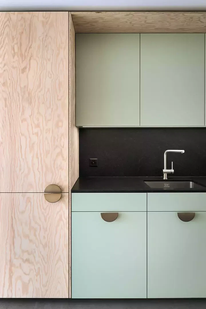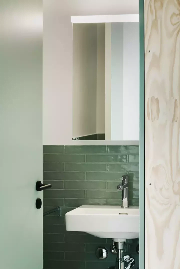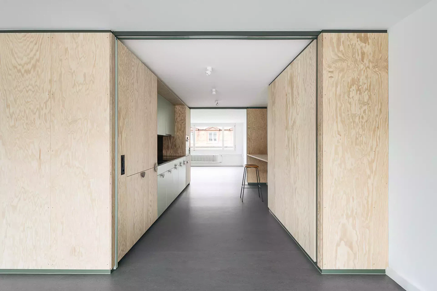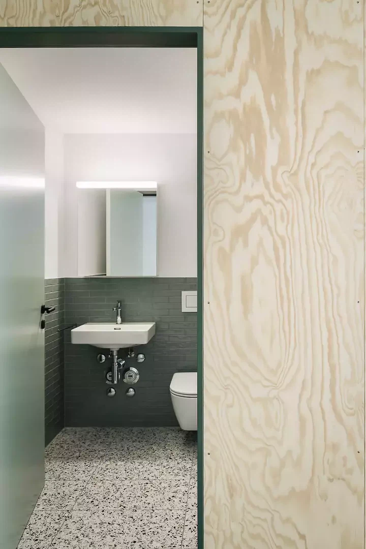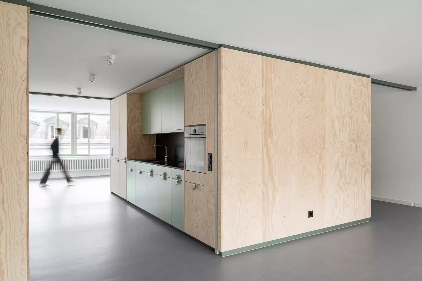 Wohnen oder Gewerbe? Diese Frage prägte die Planung. Die Antwort: beides. Der Nutzungsmix sorgt für Flexibilität, Nachhaltigkeit und Marktfähigkeit. Ein zentraler Holzkern mit Küche, Sanitärbereich und Reduit bildet das funktionale Rückgrat der Geschosse. So bleibt der offene Raumeindruck erhalten und die Flächen lassen sich vielseitig nutzen.