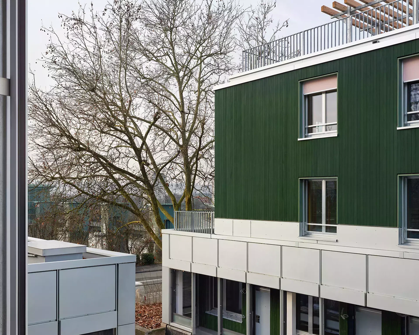 Das Gebäude an der Grenzacherstrasse 487 in Basel wurde 1969/70 durch die Hoffmann La Roche AG als Immunologisches Forschungsinstitut erstellt. Der neue Nutzungszyklus ist auf 30 Jahre angelegt. Durch den Umbau und die Aufstockung des Gebäudes sind 53 Wohnungen entstanden. Das neue Wohnungsangebot hebt sich von den Familienwohnungen in der Umgebung ab. Da die benachbarten Mehr- und Einfamilienhäuser ausschliesslich Wohnraum für Familien anbieten, bietet sich eine Ergänzung mit kleineren Wohnungen an diesem Ort an. Die beiden Innenhöfe bieten ein System beziehungsreicher Erschliessungen. Zusammen mit den Dachterrassen und weiteren gemeinschaftlichen Angeboten entsteht ein Netz von sozialen Anknüpfungspunkten. Das Wohnungsangebot lässt eine plurale Bewohnerschaft erwarten, was das Konzept der Vielfalt weiter unterstützt. Die spezifischen Qualitäten der Wohnungen entstehen aus der Überlagerung des Programms mit der vorgefundenen Baustruktur. Die überhohen Räume bieten einen räumlichen Luxus und erlauben es, auch sehr tiefe Grundrisse gut zu belichten. Der Holzbau bietet als Ergänzung wenig tiefe Räume an, die längs der Fassade liegen. Viele der Wohnungen werden direkt von den beiden Innenhöfen erschlossen. Die grossen Raumhöhen ermöglichen trotz hoher Dichte grosszügig angelegten Wohnraum. Das bestehende Gebäude besteht aus zwei Untergeschossen aus Stahlbeton und ein- beziehungsweise dreigeschossigen Aufbauten, die als Stahlskelettbauten ausgeführt sind. Die ergänzenden Aufstockungen wurden in Holzelementbauweise ausgeführt. Der Ausdruck des Gebäudes ist von den beiden Zeitspuren geprägt, die sich überlagern und ergänzen. Die bestehende Fassade ist aus präzisen Aluminiumpaneelen zu einer dünnen Haut zusammengefügt. Die neuen Bauteile sind mit einer Holzschalung verkleidet, welche die Erscheinung der Aufstockungen und der ergänzten Fassaden im Erdgeschoss prägt.