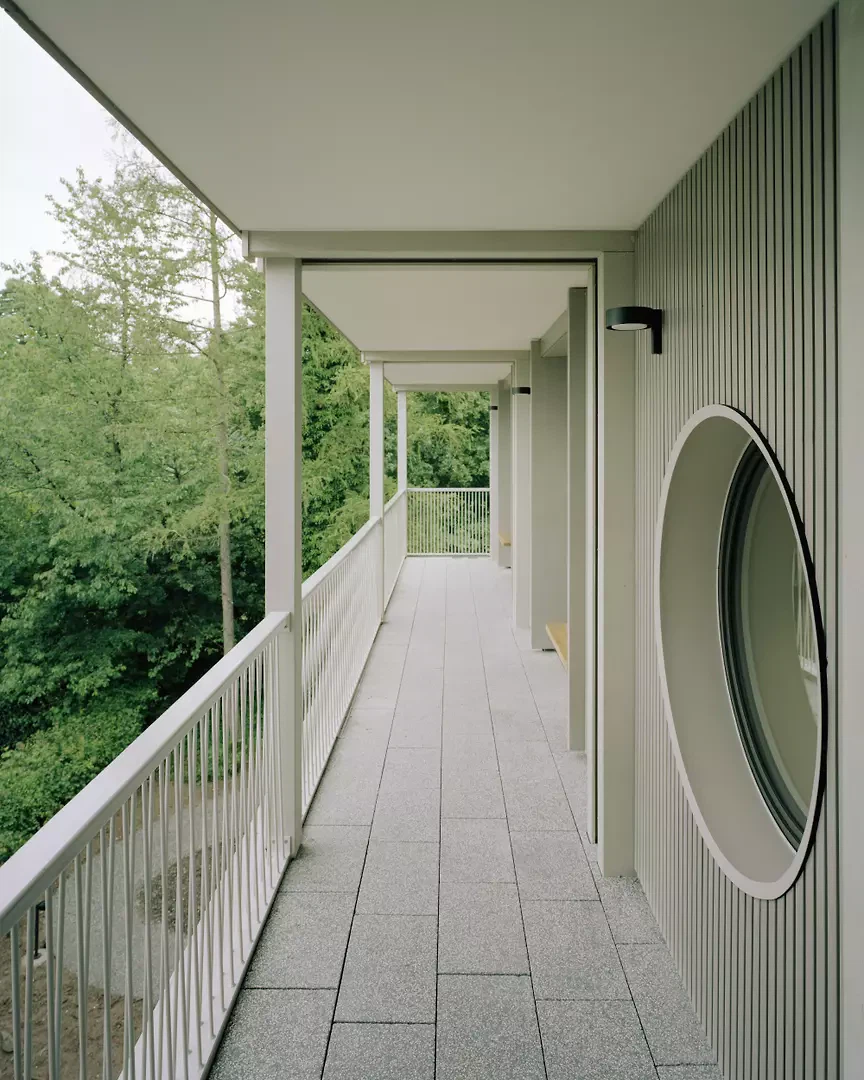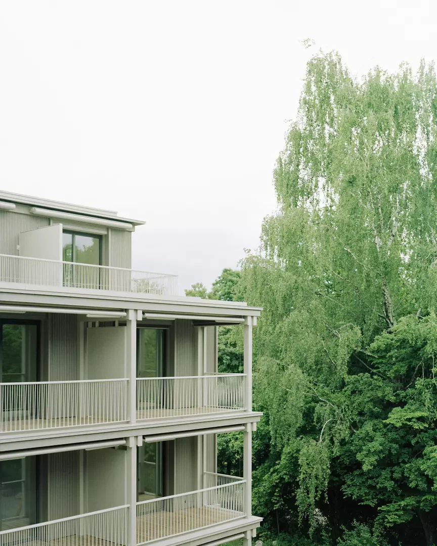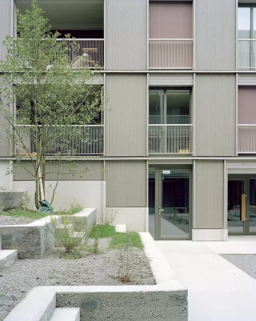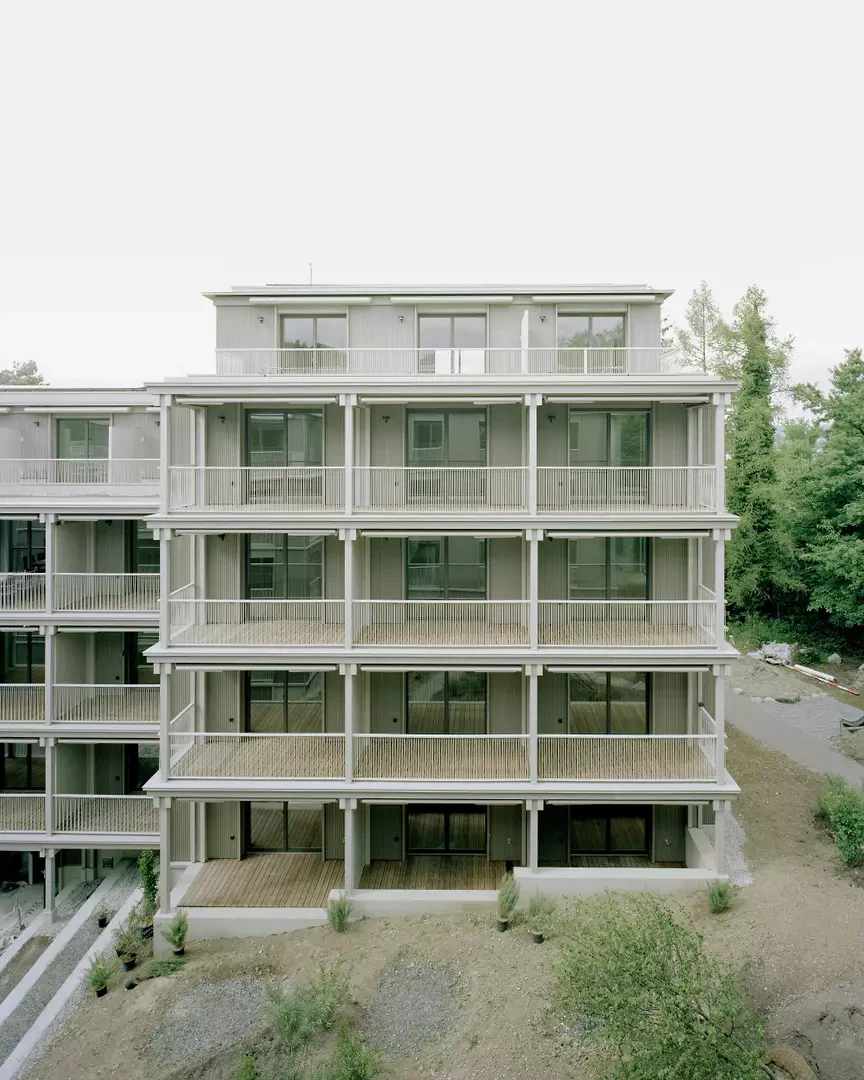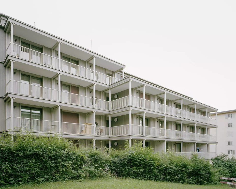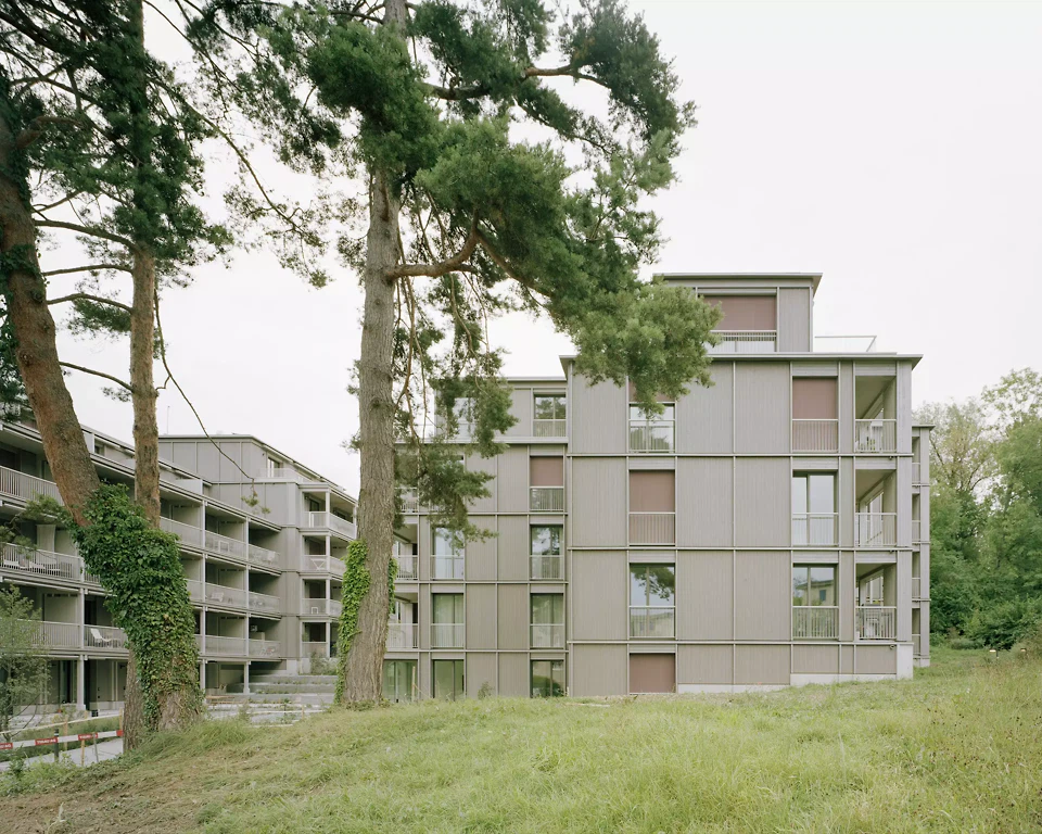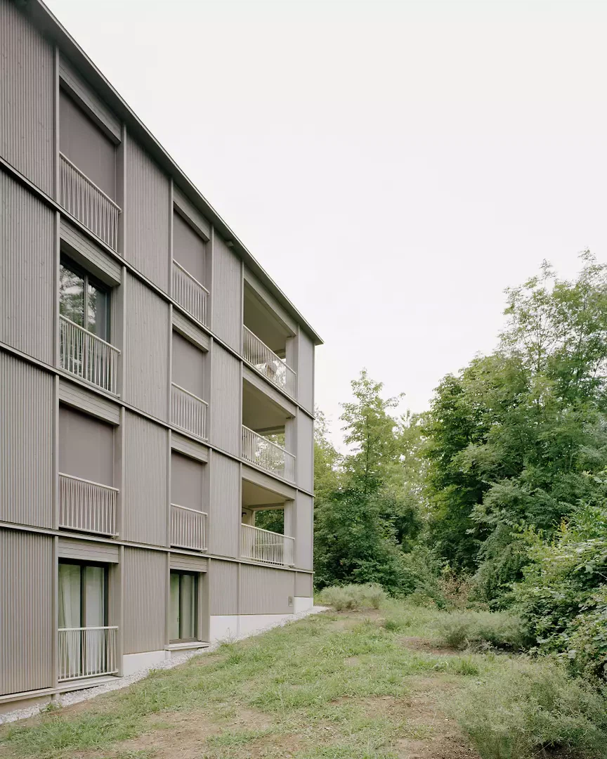Das Quartier Stettbacherrain im Norden der Stadt Zürich ist eine Wohnbebauung von sehr hoher städtebaulicher und landschaftlicher Qualität, gelegen an der Schnittstelle zwischen Stadt und Natur. Das Areal wurde nach modernistischen Idealen entwickelt, die Grün und Licht als menschliche Grundbedürfnisse betrachten. Ohne den sentimentalen Versuch, die Bestandsbauten zu kopieren, bewahren die beiden Holzvolumen die räumlichen und natürlichen Qualitäten des Ortes. Diese Strategie erlaubt es, die für die Ruhe und Naturnähe des Quartiers wichtigen Blickbezüge sowie die grünen Durchgänge und das feinmaschige Naturgeflecht zwischen den Gebäuden zu erhalten.