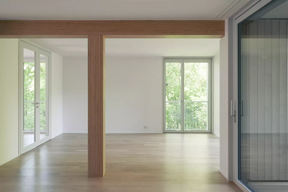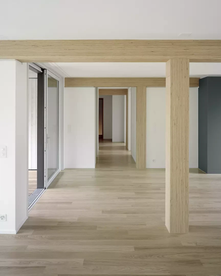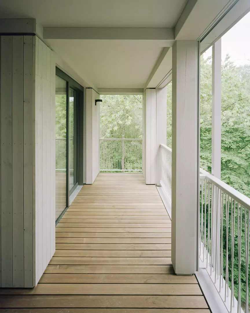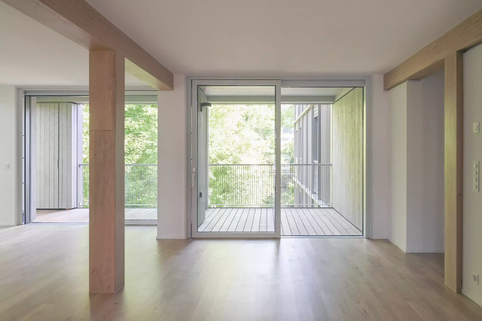 Die eingeschossigen Wohnungen des «Landhauses» im Süden sind geräumig und weitläufig. Das Haus bietet grosszügige, in alle Himmelsrichtungen ausgerichtete Räume. Diese Konstellation sichert einen hohen Eintrag an Tageslicht und stärkt die Blickbezüge zu den umliegenden Wiesen und dem Wald. Die Wohnungen sind um ein zentrales, von Norden her erschlossenes Treppenhaus herum gruppiert. In den Regelgeschossen befinden sich jeweils sechs Wohnungen, davon zum grössten Teil 4.5- und 3.5-Zimmer-Wohnungen. Jede Wohnung verfügt über eine überdachte Loggia, die sich innerhalb des Gesamtgebäudevolumens befindet und den räumlichen Abschluss der Fassade aufnimmt. Schatten bieten hier vertikale, textile Storen an der Fassadenstirn.