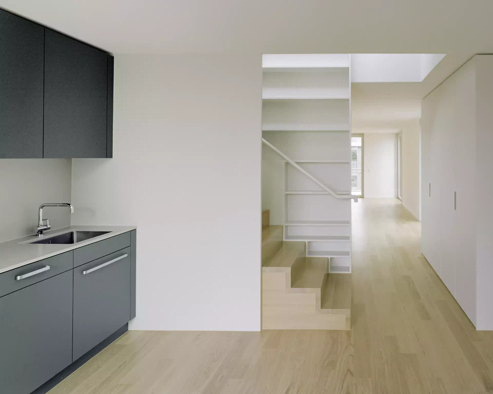 Die schlanken Wohnungen im «Dorfhaus» hingegen sind nebeneinander aufgereiht, ähnlich wie Häuser an Dorf- oder Altstadtstrassen. Sie weisen in ihren Raumproportionen Verwandtschaften zu kleinen Häusern im Grünen auf. Einige der Wohnungen sind zweigeschossig: Vertikale Verbindungen innerhalb der Wohneinheiten ermöglichen hier die Umsetzung von Maisonetten. Eine originelle Treppe fungiert hier zum einen als Erschliessung und zum anderen als Schrankmöbel. Entlang der Südfassade befinden sich im Erdgeschoss Atelierwohnungen, die jeweils über einen eigenen Eingang und einen Vorplatz verfügen. Alle weiteren Wohnungen bieten einen nach Süden, zum Platz hin ausgerichteten, Balkon mit Markisen zur Beschattung. Beide Häuser bieten Attikawohnungen in verschiedensten Grössen. Jede dieser Wohnungen hat über Türen oder Schiebetüren einen direkten Zugang zur begrünten Dachterrasse.