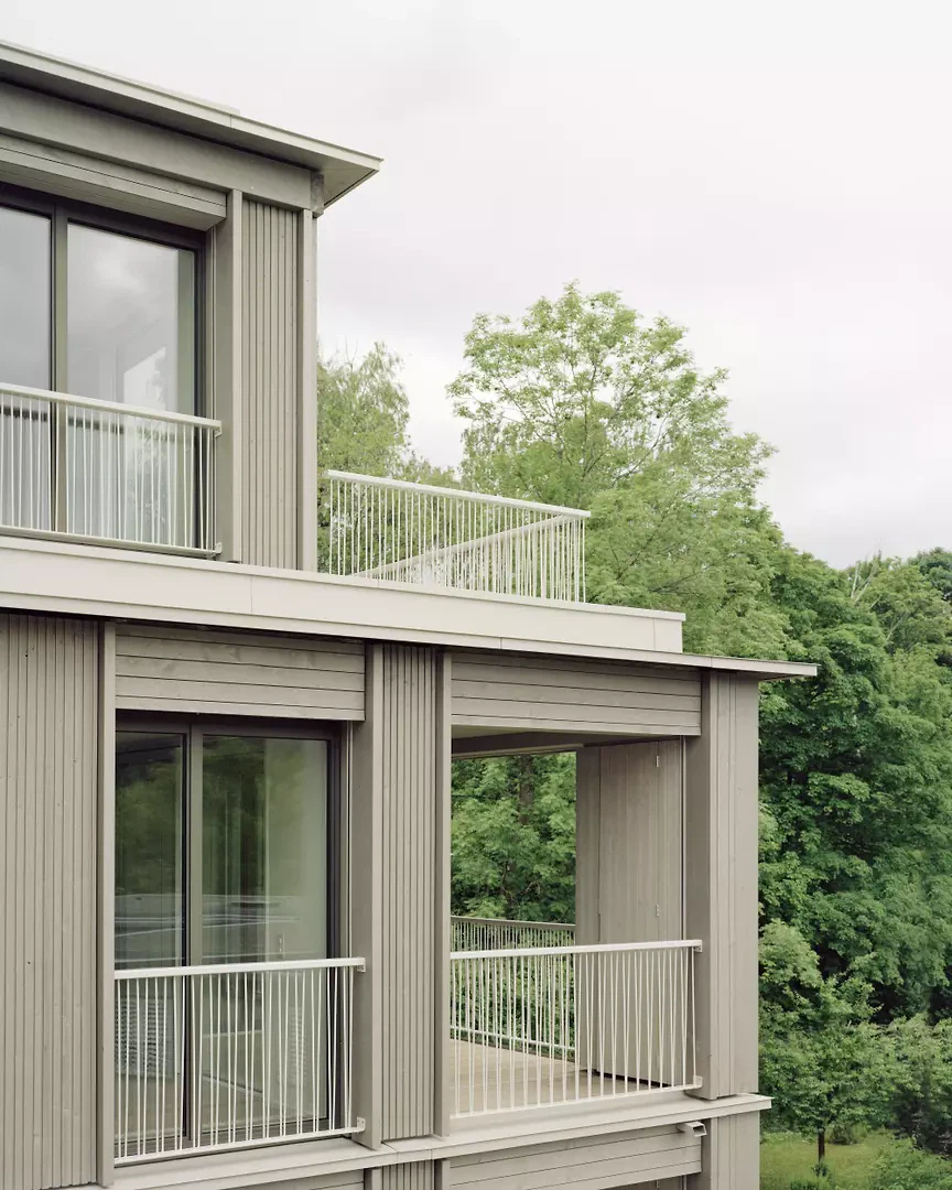 Beide Häuser erhalten eine Holzfassade, die sich durch ihren feinen, bewussten Detaillierungsgrad, Vor- und Rücksprünge, vertikale Profile und horizontale Bänder auszeichnet. Die raumhohen, grosszügigen Fenster sind aus Holz/Metall, ebenso die Schiebefenster hin zu den Loggien und den Terrassen. Vor den Fenstern sind vertikale, textile Storen angeordnet, im Fensterrahmen befinden sich Lüftungsmodule, die ein angenehmes, nachhaltiges Raumklima gewährleisten.