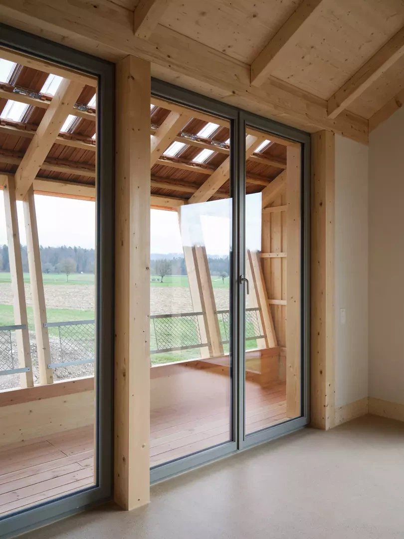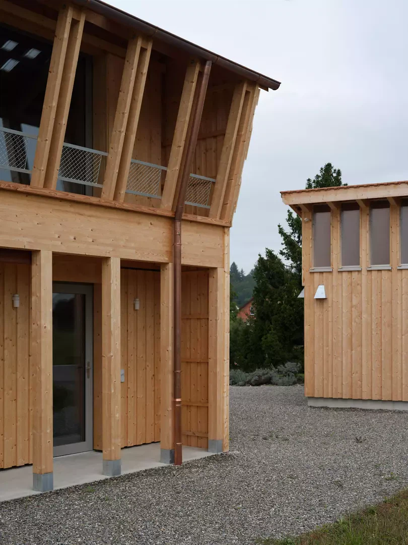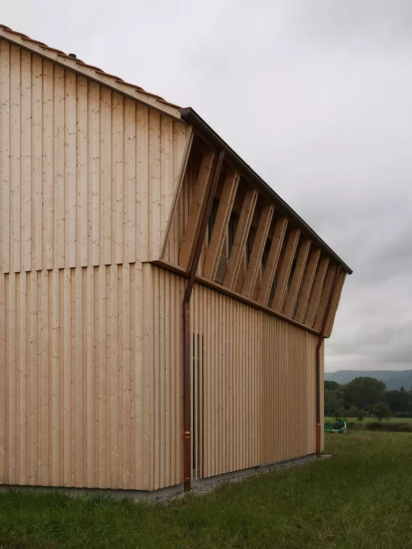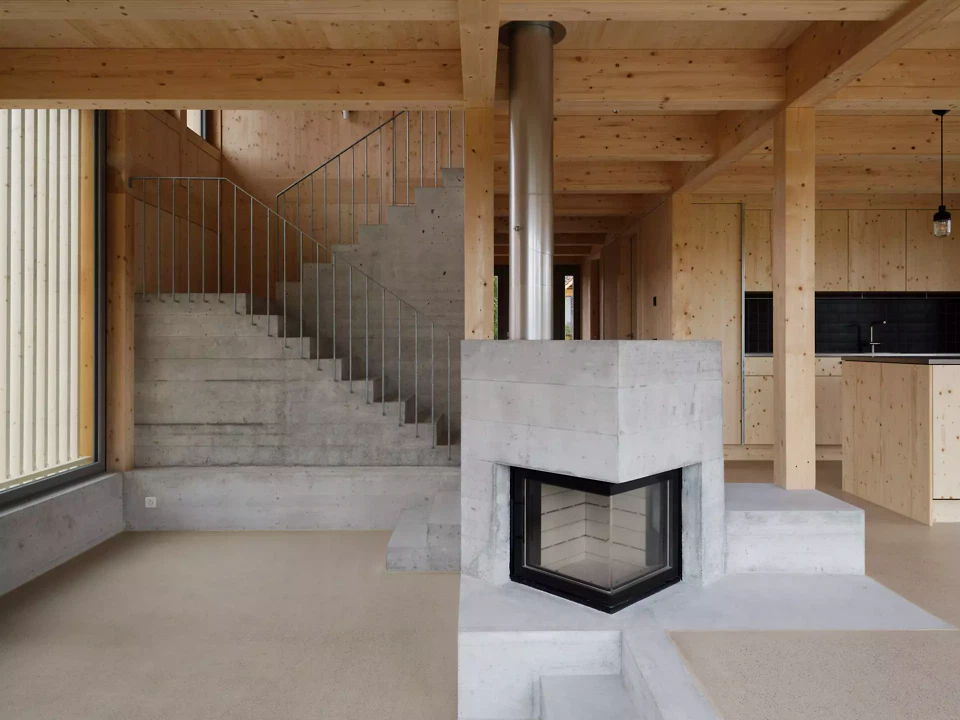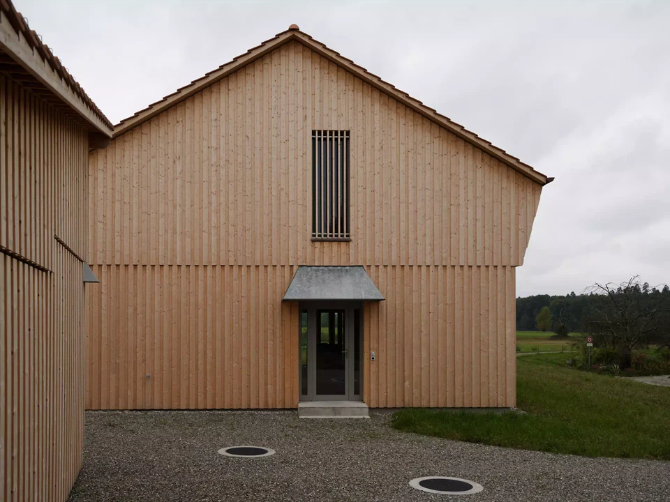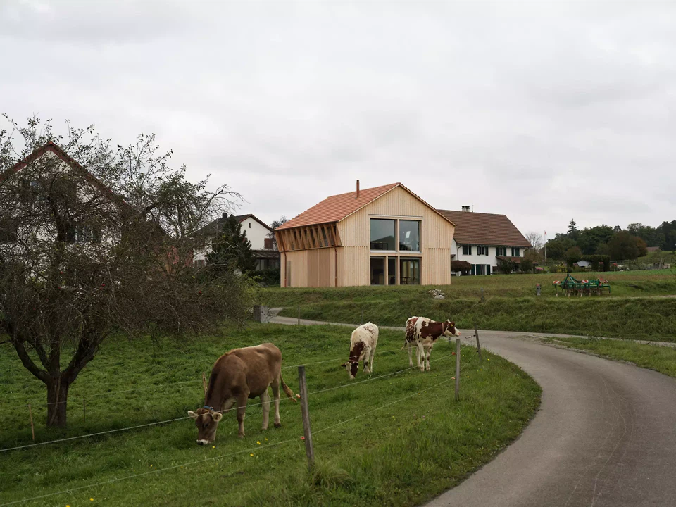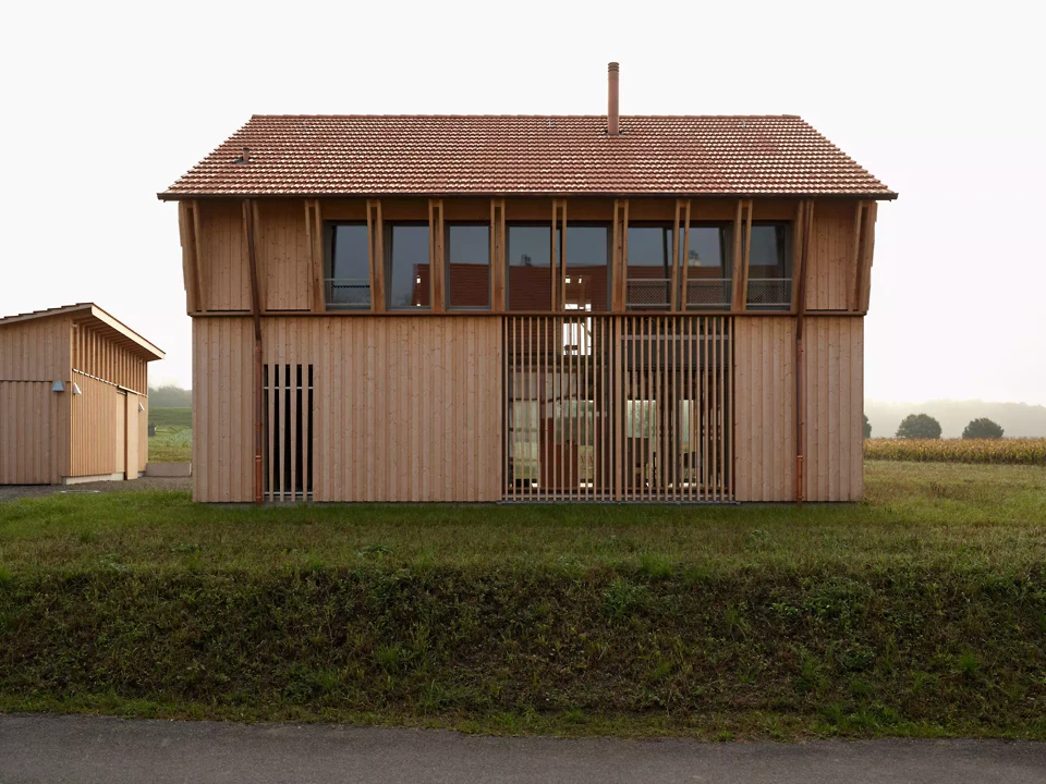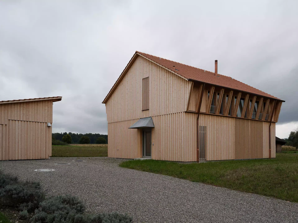 Die Fassaden reagieren differenziert auf ihre Orientierung. Die Nordfassade nimmt den Haupteingang auf. Eine verglaste Fläche mit Holzfilter belichtet das Bad und wahrt gleichzeitig die Privatsphäre. Ein kleines, pragmatisch als metallene Hütte ausgebildetes Vordach verleiht dem Haus eine Adresse. Diese Formgebung findet eine Fortsetzung in der Gestaltung der Aussenleuchten und des Briefkastens. An der Westfassade kaschiert eine verdichtete, schräg geführte Lattung die Verglasung im Obergeschoss und übernimmt zugleich eine konstruktive Funktion als Lastabtragung für die Sparren. Im Erdgeschoss regulieren verstellbare Lamellen Transparenz und Privatheit. Die Ostfassade ist als offene, durchlässige Laubenschicht ausgebildet. Zurückversetzte Verglasungen werden durch Stützen und Lamellen geordnet. An der Südfassade wird die Verglasung zum weiten Landschaftsraum geöffnet und definiert als singuläres Element die Giebelfassade. Im Inneren bleibt die Struktur des Holzbaus ablesbar. Der weite Raster verweist auf die Konstruktion einfacher Holzscheunen. Beton wird zurückhaltend als Bodenplatte und Sockel eingesetzt. Treppe und Feuerstelle sind materialgerecht und skulptural in Beton ausgebildet. Ein überhoher Raum neben der Treppe verbindet die Geschosse und vermittelt den Massstab des Ökonomiebaus, der sich auch an der Fassade zeigt. Der leicht abgesenkte Wohnraum schafft zusätzliche Intimität. Die Organisation folgt einer Erschliessungsachse und der konstruktiven Spannweite. Handwerk und Materialität prägen die Atmosphäre und bleiben sichtbar.