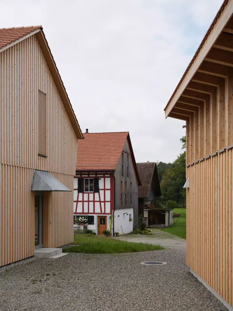 Der Neubau besetzt eine prominente Lage am südlichen Dorfeingang der ISOS-geschützten Siedlung und innerhalb der BLN-geschützten Landschaft. Körnung, Volumen und Firstrichtung orientieren sich am Bestand und greifen die rurale Struktur auf. Zwei hierarchisch abgestufte Baukörper fassen zwei Hofräume und vermitteln zwischen öffentlichem Strassen- und privatem Aussenraum. Die Setzung knüpft an ortstypische Siedlungsmuster an und stärkt die räumliche Lesbarkeit des Ensembles. Der Fussabdruck des Hauptgebäudes entspricht den Dimensionen historischer Bauten. Das ruhige, 30 Grad geneigte Satteldach lehnt sich an landwirtschaftliche Scheunen an und ordnet sich den bestehenden Wohnhäusern unter. Der Nebenbau wird selbstverständlich als eigenständiger, untergeordneter Baukörper mit einfachem Pultdach ergänzt.