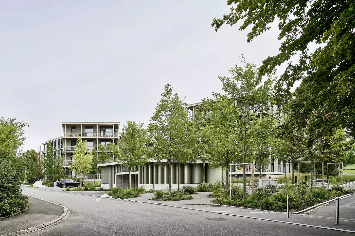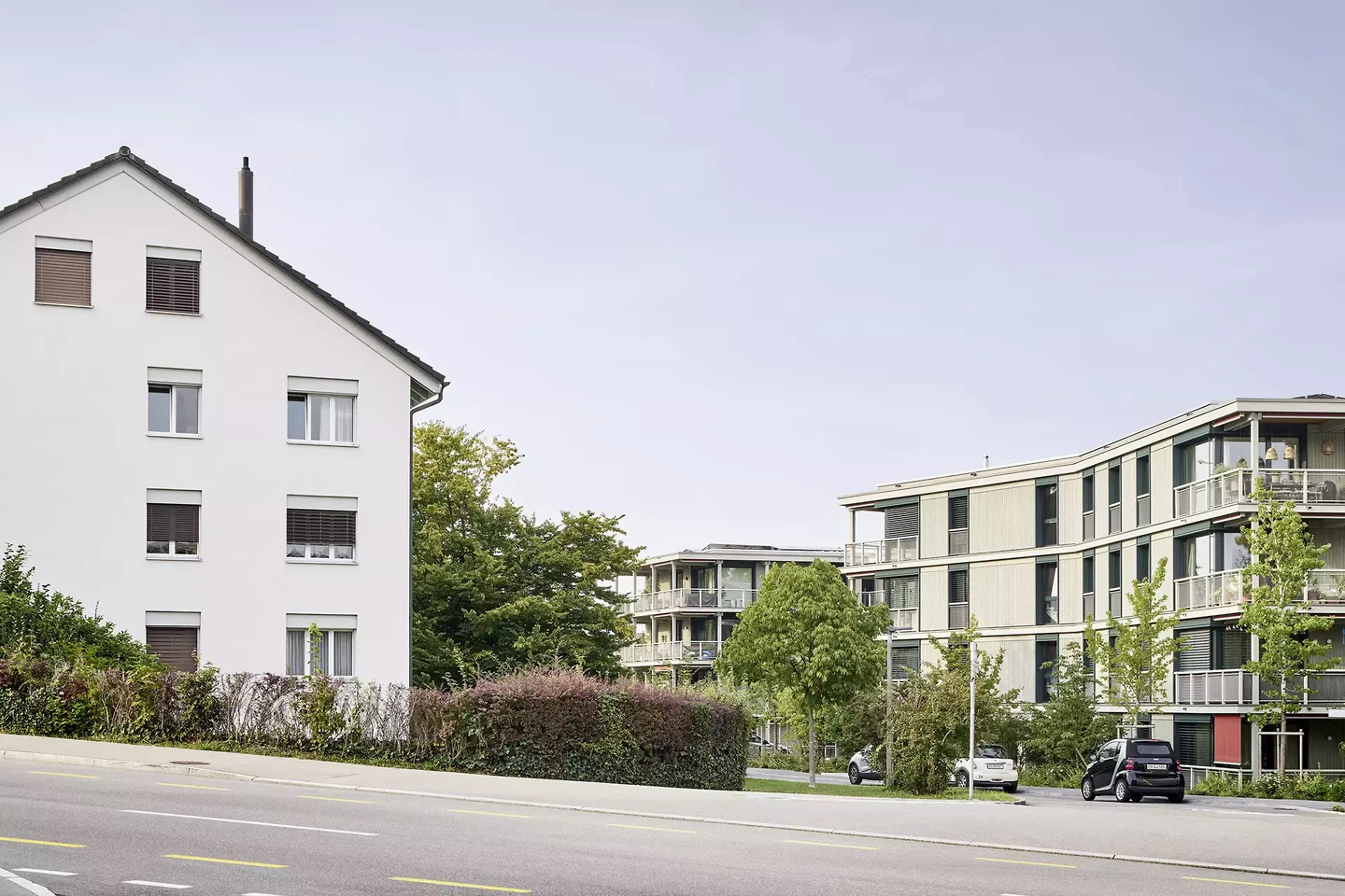 Gegen aussen treten die in Massivbauweise konstruierten Gebäude mit einer hölzernen Hülle in Erscheinung. Diese besteht aus einer hinterlüfteten Holzfassade mit vertikaler Brettschalung sowie einer aus Pfosten, Deckenplatten und Unterzügen gefügten Balkonschicht, die sämtlichen strassenabgewandten Fassaden durchgängig und in unterschiedlichen Tiefen vorgelagert ist. Zurückversetzte Sockel lassen die Gebäude scheinbar über dem leicht abfallenden Terrain schweben. Ein sorgfältig austariertes Farbkonzept mit modernen schwedischen Schlammfarben unterstützt die Wahrnehmung der vielschichtigen Fassade und setzt sich im Innern der Wohnungen fort.