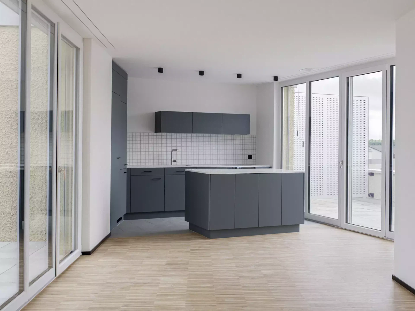 Das Aussenraumkonzept basiert auf dem gewohnt engen Zusammenwirken von Freiraum und Architektur und ermöglicht durch die grosszügige Grünanlage das Wohnen in einem Park mit direktem Bezug zum Gewässer. Der Verzicht auf private, voneinander abgegrenzte Aussenräume lenkt den Fokus auf die privat genutzten Loggien und Terrassen. Im Umkehrschluss sorgt dies für eine grösstmögliche zusammenhängende Grünfläche entlang des Flusses. Die sorgfältig gestalteten Wohnungen sind mindestens dreiseitig orientiert: Die Hauptausrichtungen sind jeweils die Glatt im Norden und die Mittagssonne im Süden, durch die gestaffelten Fassaden öffnen sich die Wohn- und Aussenräume aber auch gegen Osten und teilweise gegen Westen.