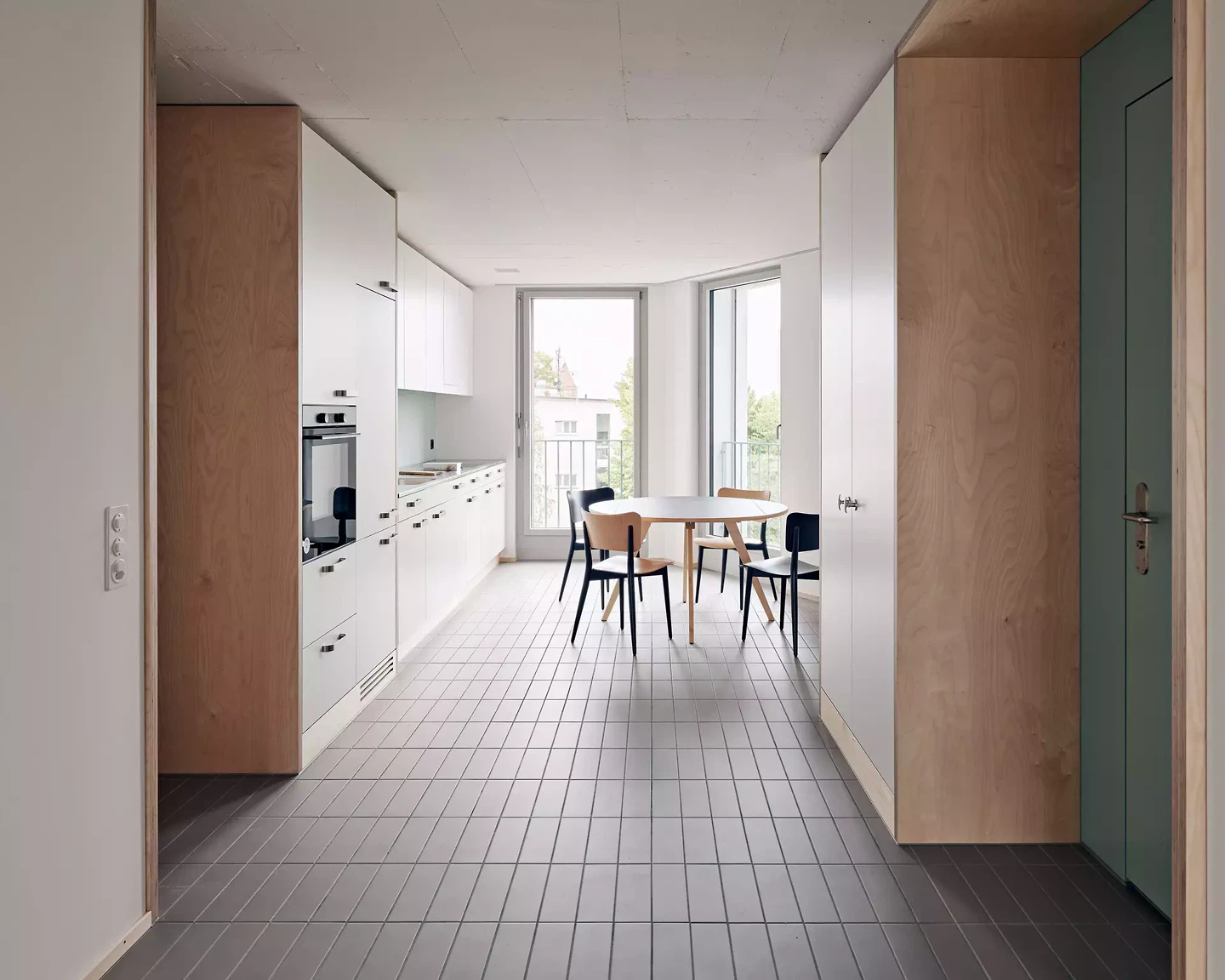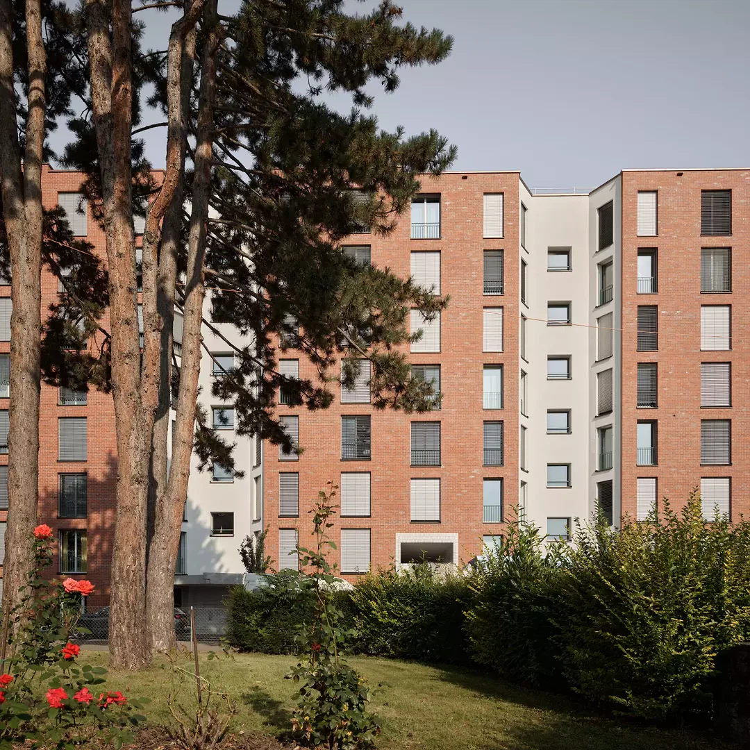 Die Aussenräume stufen die gewünschte Öffentlichkeit ab. Dort, wo sich die beiden Strassen kreuzen, bildet die eingezogene Ecke des Gebäudes einen kleinen Stadtplatz. Den Riegel an der Freihofstrasse säumen die Vorgärten der Erdgeschosswohnungen und zwei hohe Durchgänge führen in den frei zugänglichen Gartenhof. Dort grenzen Hecken die Kiesflächen der Bewohner ab. In der Mitte des Hofes umrahmt ein Baumkranz das gemeinschaftliche Herz aus Rasen, Spielplätzen und Kieswegen. Ein Grünraum, der von innen heraus Identität stiftet.