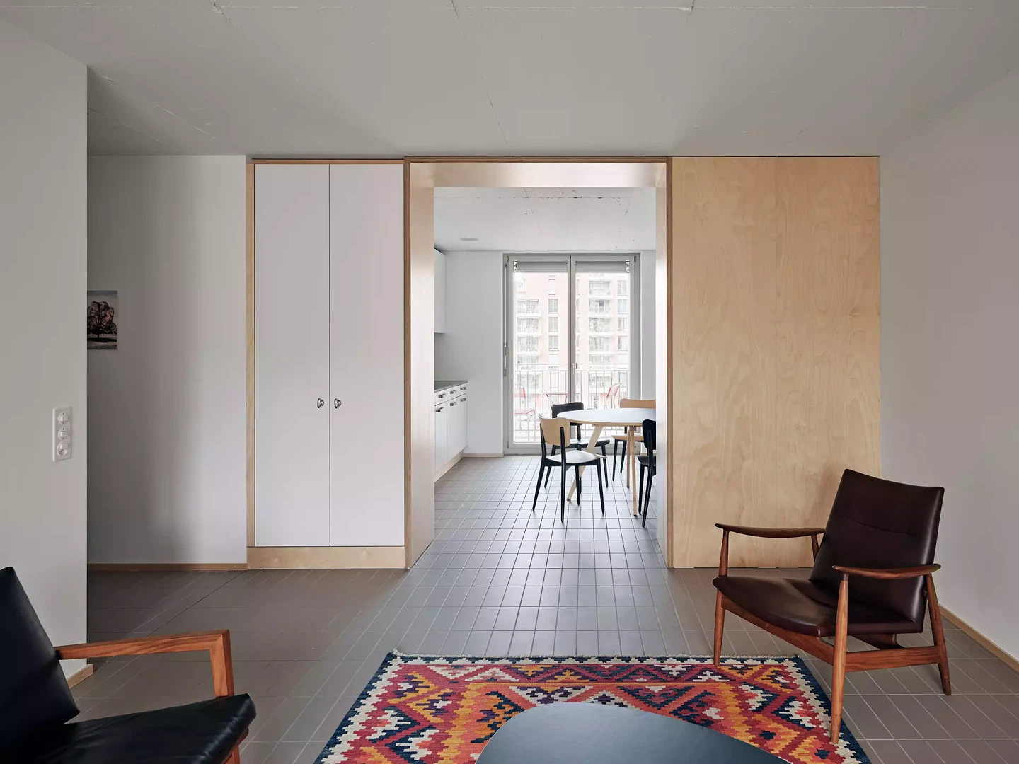 Grossmassstäblich und heterogen soll auch der neue Wohnhof werden. Er besteht aus drei unterschiedlichen Teilen: Ein kräftiger, achtgeschossiger Riegel fasst mit ruhigem Rhythmus die Freihofstrasse. Regelmässige Einbuchtungen gliedern diese mächtige Wand in Abschnitte aus Backstein oder Verputz. An ihren Enden bauen zwei gänzlich verschiedene Kopfbauten die Körnung und Ausrichtung der Nachbargebäude weiter: ein Solitär an der nördlichen Hohlstrasse und ein abgetreppter Kamm zu den Wohn- und Gewerbebauten im Süden. Der grosse, grüne Hof verbindet sich mit dem schönen Garten des Restaurants Da Angela. Jeden dieser Gebäudeteile prägt ein anderer Wohnungstyp. Im Riegel verbindet ein grosser Raum die Strasse mit dem Hof. Wenige schräge Wände setzen diese relativ kleinen Familienwohnungen unter Spannung. Im nördlichen Kopfbau richten sich die Wohnungen nach drei Seiten und nehmen die Regelhaftigkeit und Symmetrie der dortigen Altbauten auf. Im Kamm gruppieren sich die Wohnungen um die offenen Höfe und richten ihre Terrassen zur Sonne.