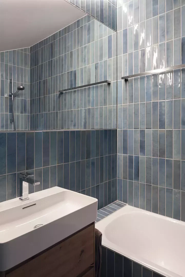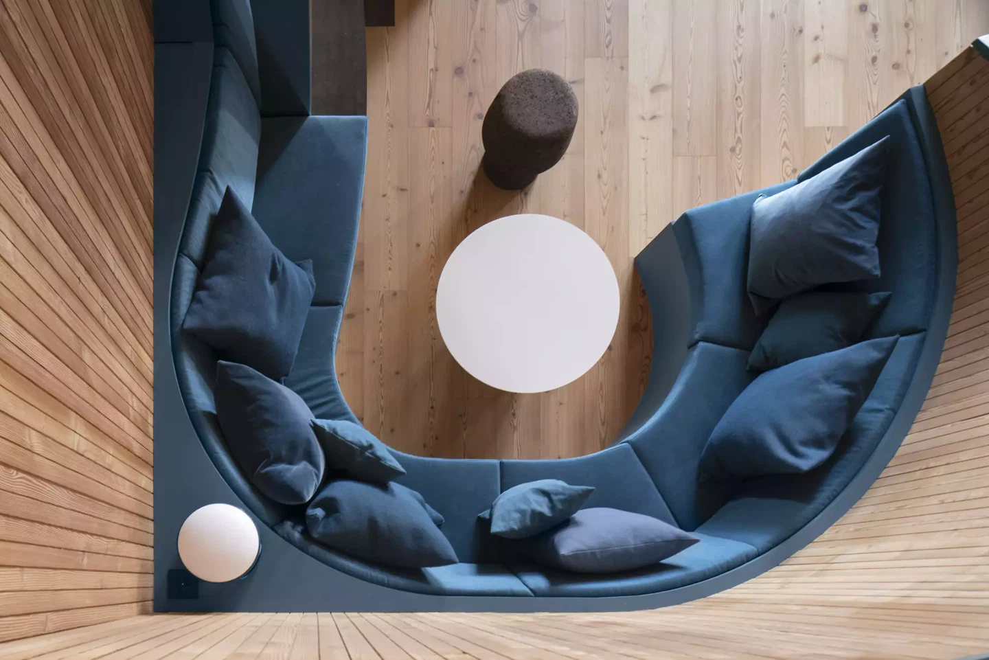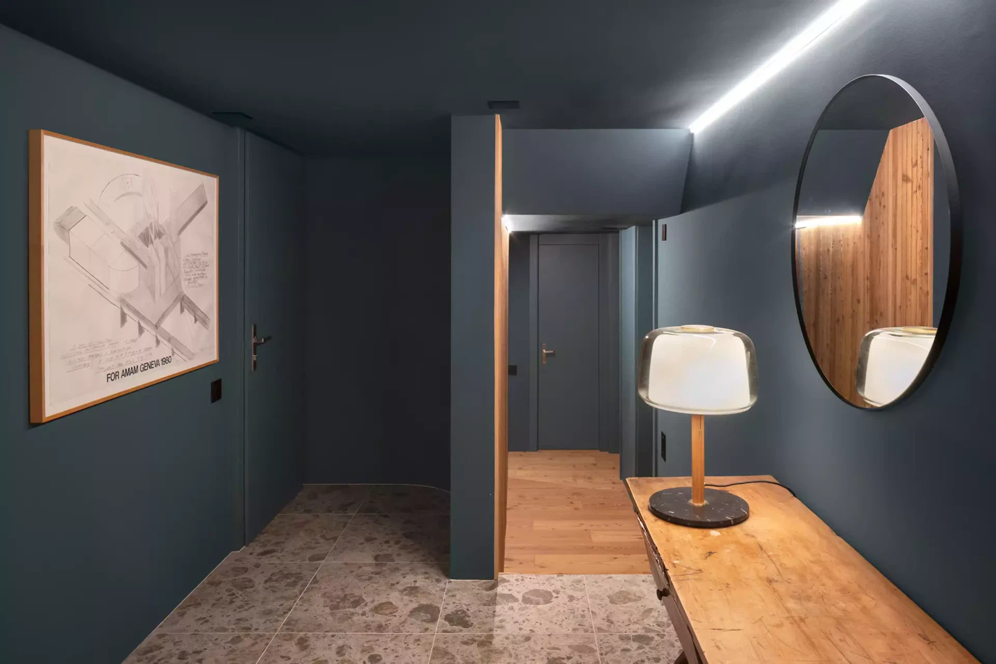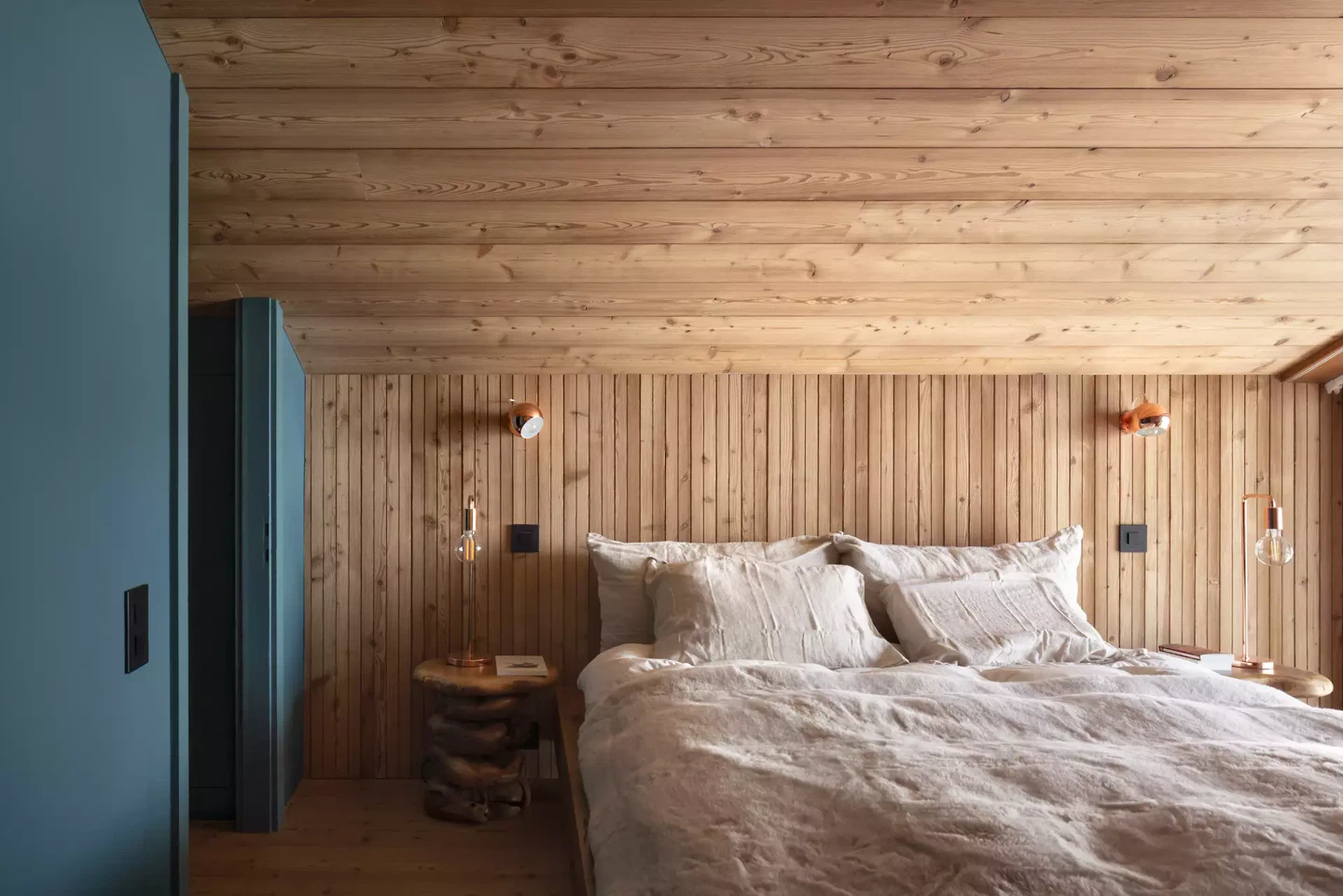 Die Materialien wurden sorgfältig gewählt, mit einem Fokus auf hochwertige und nachhaltige Lösungen. Dampfgebeiztes Lärchenholz prägt Böden, Wände und Decken und verleiht der Wohnung eine warme, einheitliche Atmosphäre, ergänzt durch Naturlehmputz, der für Struktur und Kontrast sorgt. Akzente in Petrolgrün setzen gezielte Kontraste, während der als Kokon gestaltete Eingangsbereich den skulpturalen und immersiven Charakter der Wohnung verstärkt.