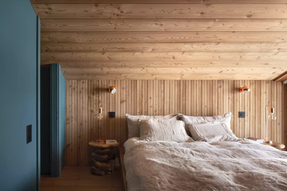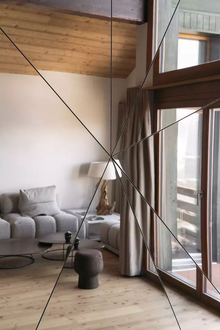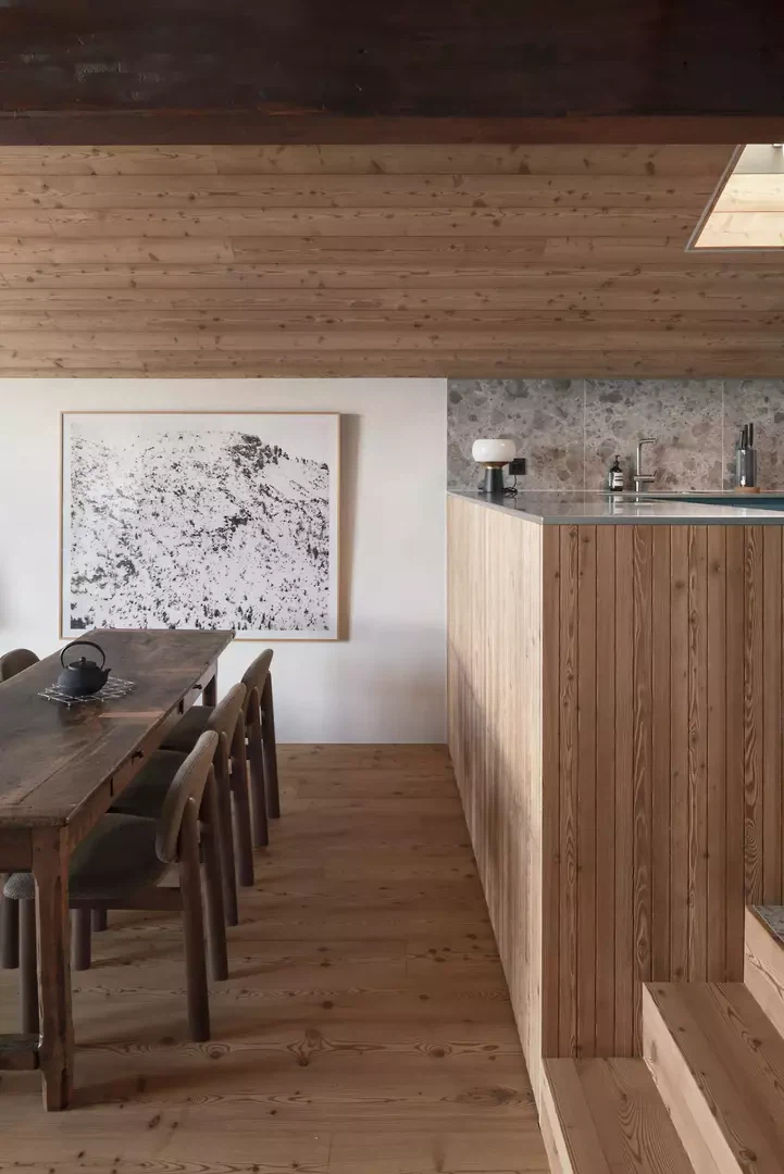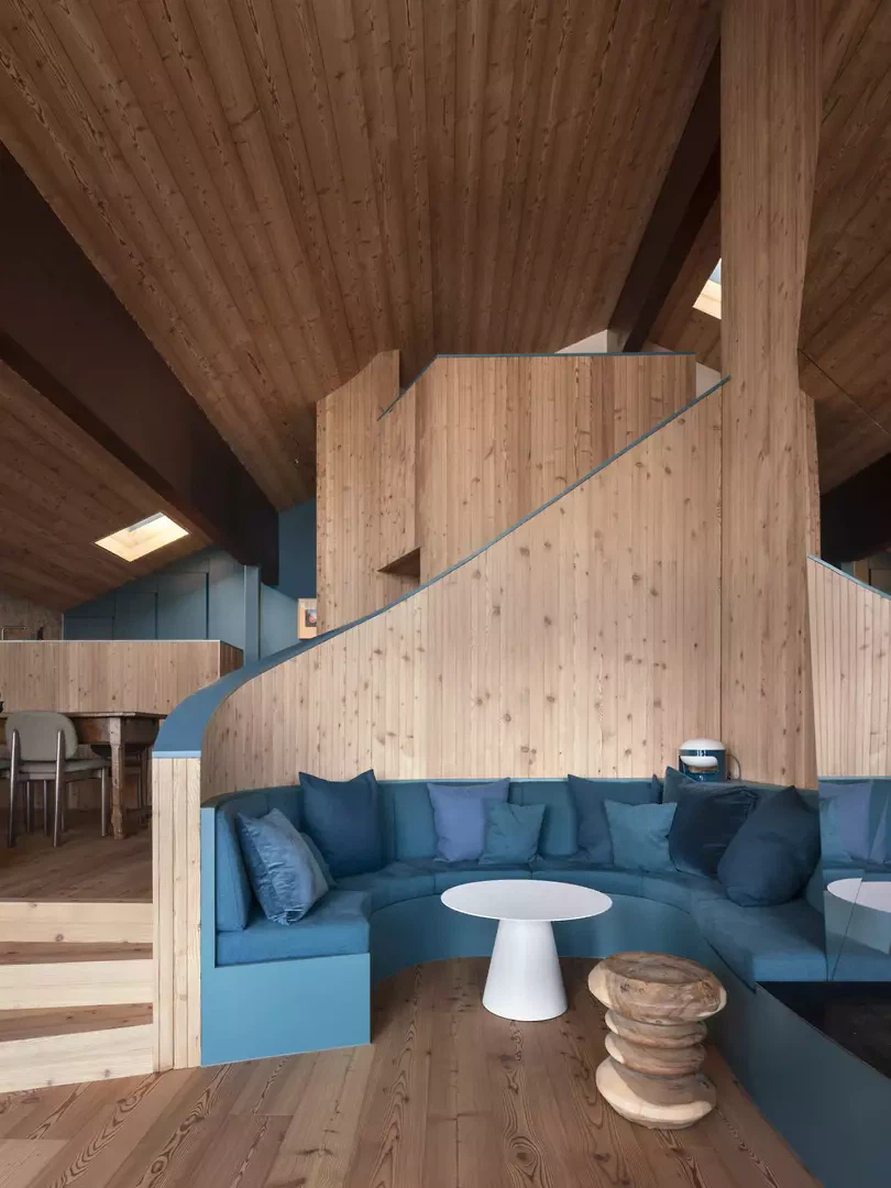 Der Kamin als zentrales Element verleiht dem Projekt eine skulpturale Dimension: Als monolithischer Körper mit dreieckigen Facetten steht er im spannungsvollen Kontrast zu den geschwungenen Holzformen. Seine Verkleidung aus poliertem Edelstahl reflektiert Innenraum und Landschaft und schafft einen Dialog zwischen Architektur und alpiner Umgebung.