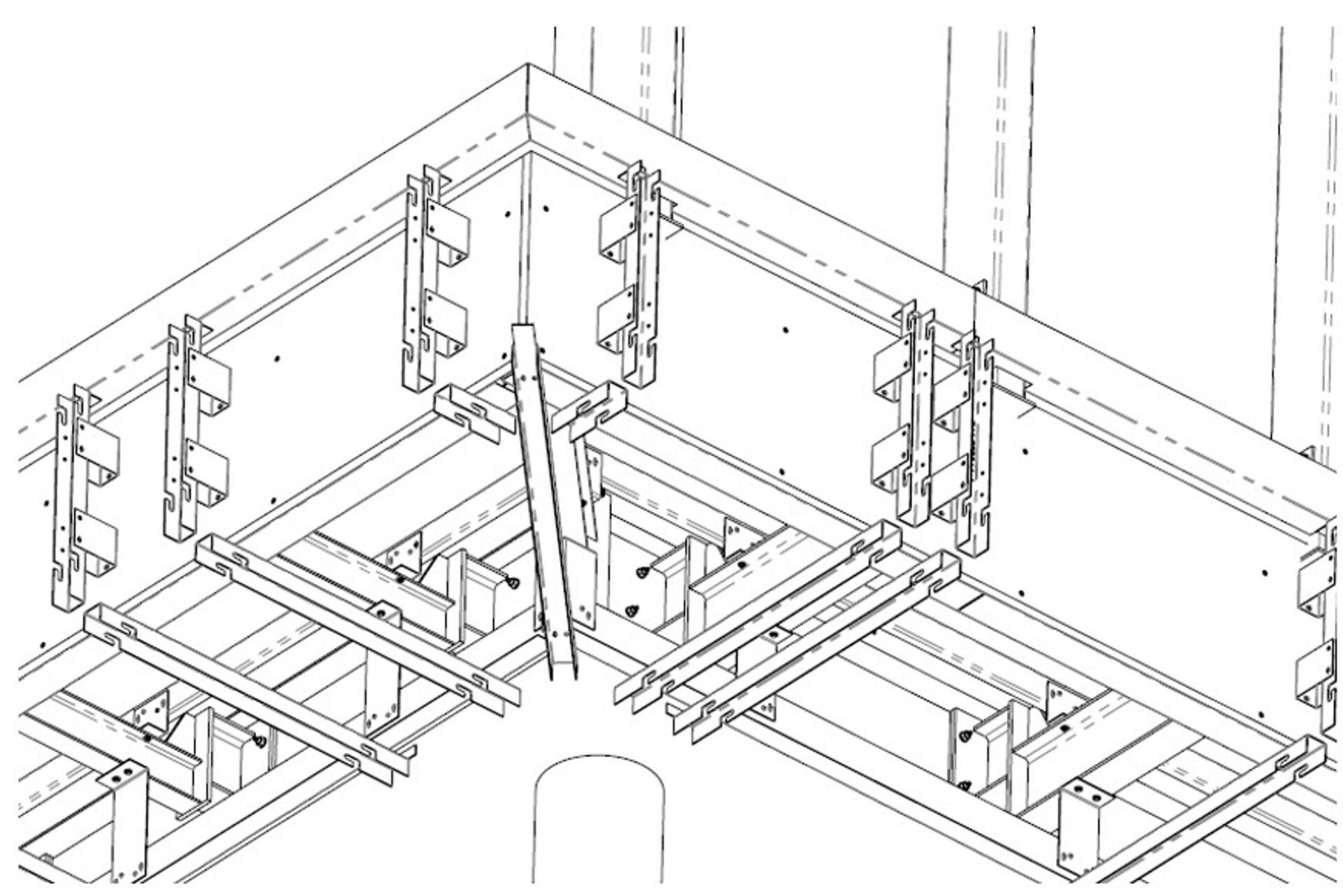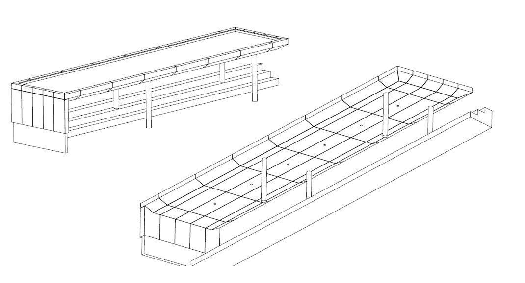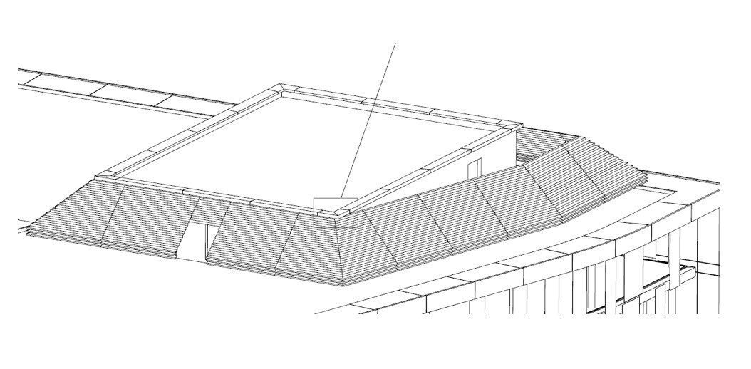 L’habillage du plafond et de l’acrotère est réalisé avec une structure en béton, recouverte de panneaux composites. Il comprend l’intégration de l’éclairage, des haut-parleurs et des dégorgeoirs de sécurité. La sous-construction supérieure est composée d’une tôle de quatre millimètres pliée en équerre, fixée sur la structure en béton, et d’une deuxième tôle en forme de U, qui reçoit les cassettes en Alucobond. Ces cassettes sont fixées à l’aide d’un système d’ancrage type baïonnette. Le revêtement en Alucobond A2 (épaisseur quatre millimètres, finition Terra Arctic Frost 380) est plié pour s’adapter à la forme souhaitée. Le système de fixation invisible repose sur un système d’accrochage avec des équerres collées à l’arrière des panneaux pour des fixations intermédiaires discrètes.