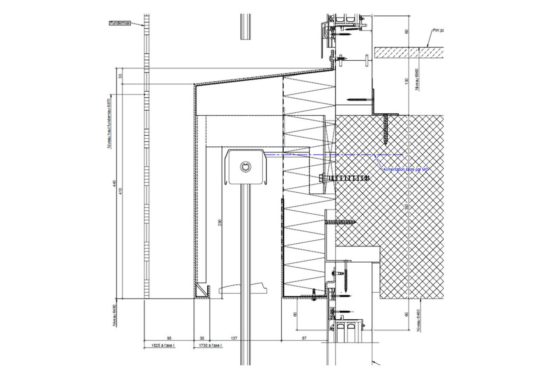 Les têtes de dalle sont habillées en tôle aluminium sur deux niveaux du bâtiment pour créer une façade-rideau. Comprenant isolation RF1, ancrages d’échafaudage, tablette et caisson de store. La sous-construction en aluminium est fixée en tête de dalle avec rupture thermique, étanchéité et isolation en laine de roche. L'habillage en tôle aluminium trois millimètres pliée en plusieurs fois sert comme caisson store. La tôle est perforée pour garantir une bonne ventilation.