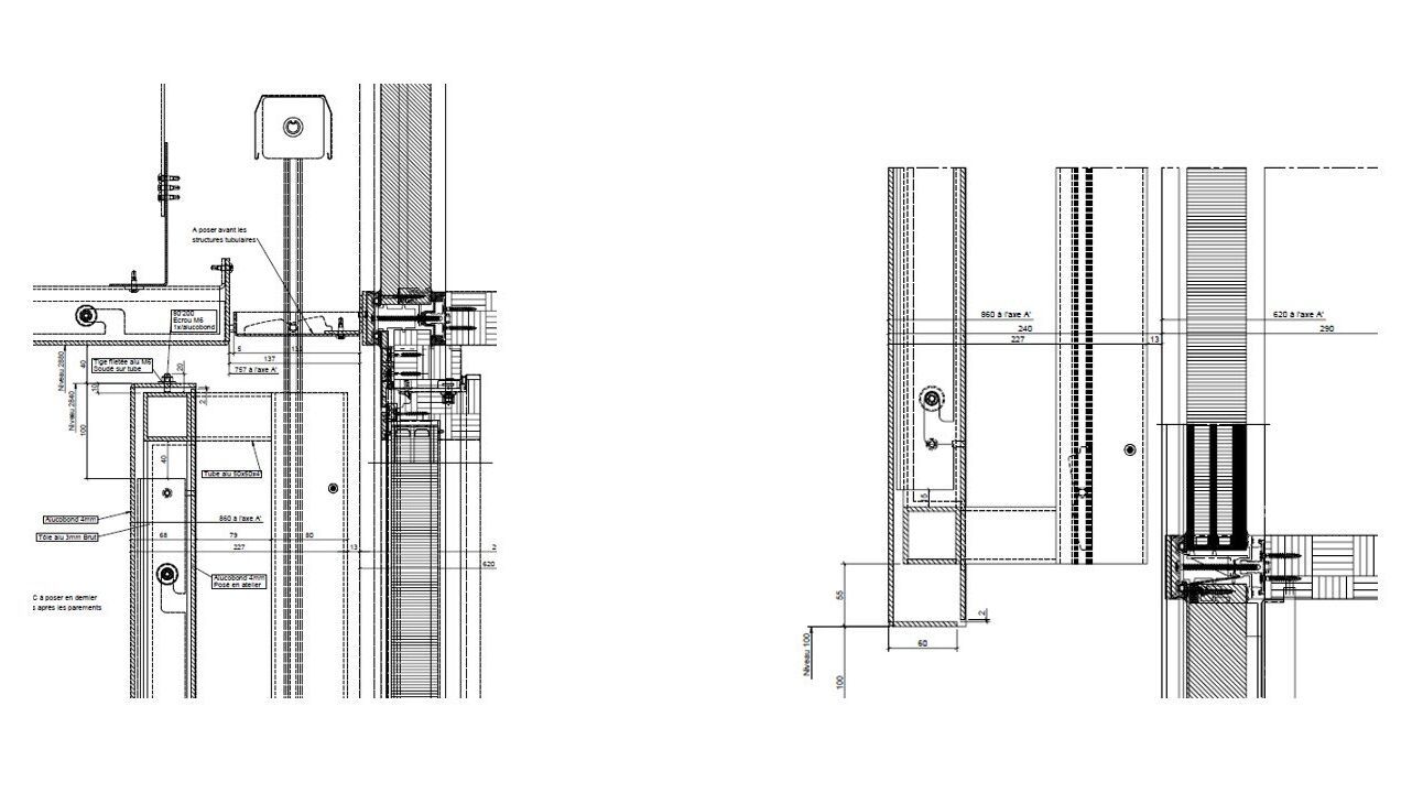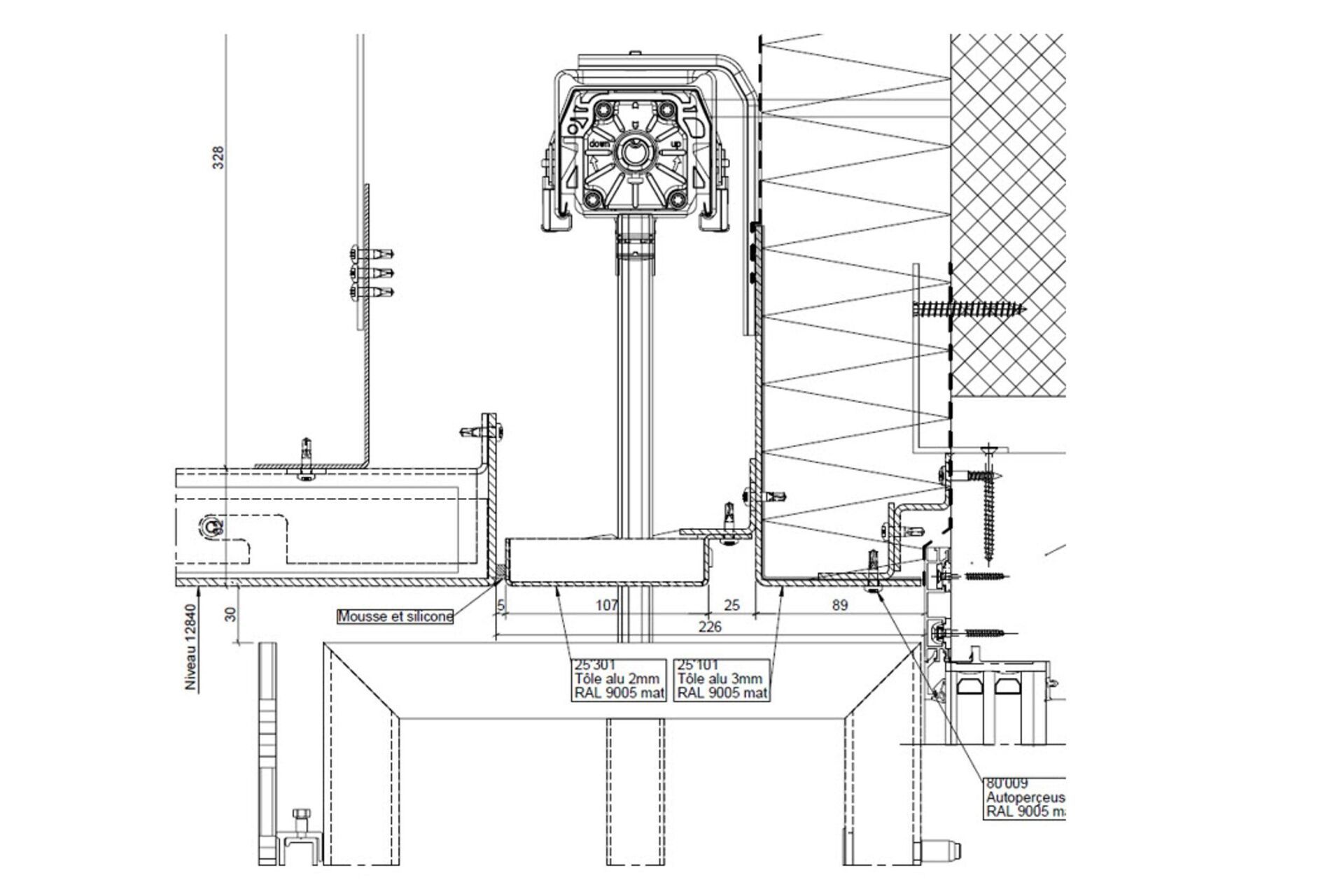 La serrurerie lourde est composée d’une structure en tubes d’aluminium, habillée de lames en tôle d’aluminium. Les châssis porteurs en aluminium sont fixés à la dalle à l’aide de potelets et d’une rupture thermique au niveau supérieur sur le béton. La sous-construction primaire est en tôle d’aluminium de quatre millimètres, pliée en forme de Z avec des ouvertures pour l’évacuation de l’eau. La sous-construction secondaire, en tubes d’aluminium de 80 x 80 millimètres, permet la fixation à la première structure. Les tôles d’habillage en aluminium de trois millimètres, pliées et développées à 350 millimètres, sont fixées sur la sous-construction secondaire.