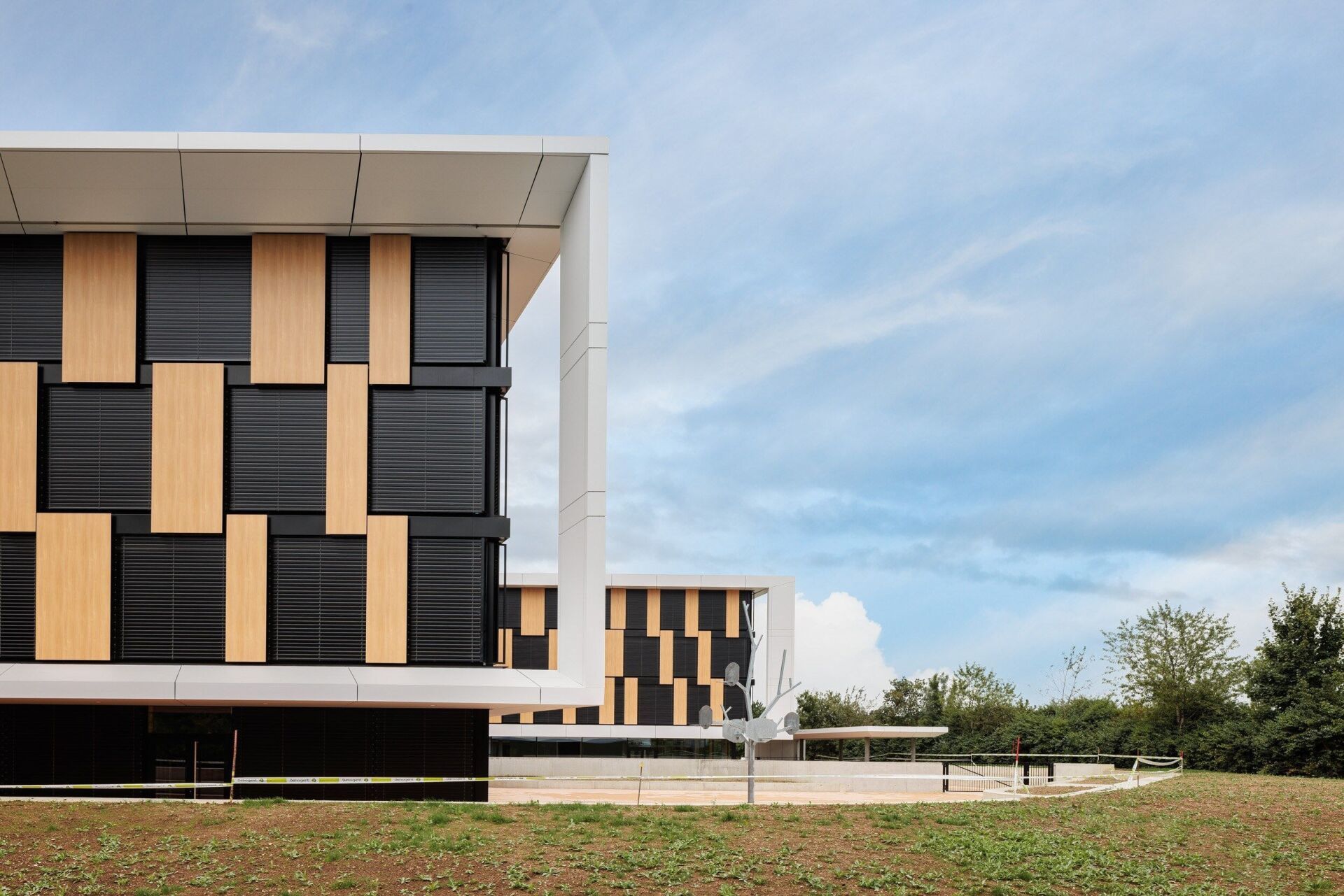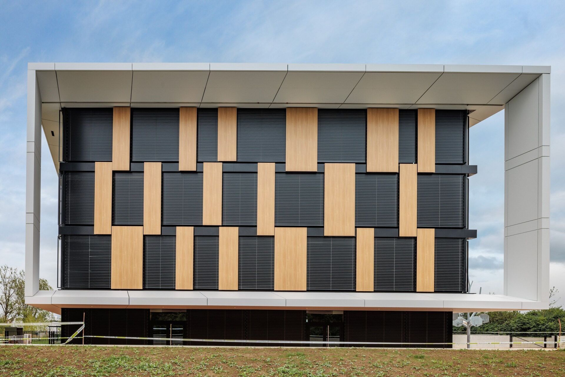 Les façades du bâtiment ont été enrichies par l’installation d’écrans décoratifs réalisés en éléments composites Fundermax, répartis sur les trois niveaux. Ces panneaux sont supportés par une structure tubulaire en aluminium thermolaqué. La structure, composée de cadres assemblés à partir de profils verticaux et horizontaux en aluminium, est directement fixée aux dormants des vitrages bois-métal via un profilé spécialement développé pour accueillir ces châssis. Les fixations sont réalisées à l’aide de vis métriques, dissimulées à l’intérieur des tubes grâce à des bouchons plastiques assortis à la couleur du cadre, assurant ainsi une finition soignée et uniforme. Un élément central du cadre en aluminium joue un rôle multifonctionnel, intégrant la coulisse des stores. Du côté extérieur, des demi-crochets femelles sont fixés pour accueillir les panneaux de Fundermax. Les panneaux utilisés proviennent de la collection m.look Exterior A2. D’une épaisseur de neuf millimètres, ces éléments présentent une finition imitation bois de chêne sur les deux faces. Leur fixation est assurée par un système invisible de type SFS eclip’s, associé à des demi-crochets mâles de marque Hilti.