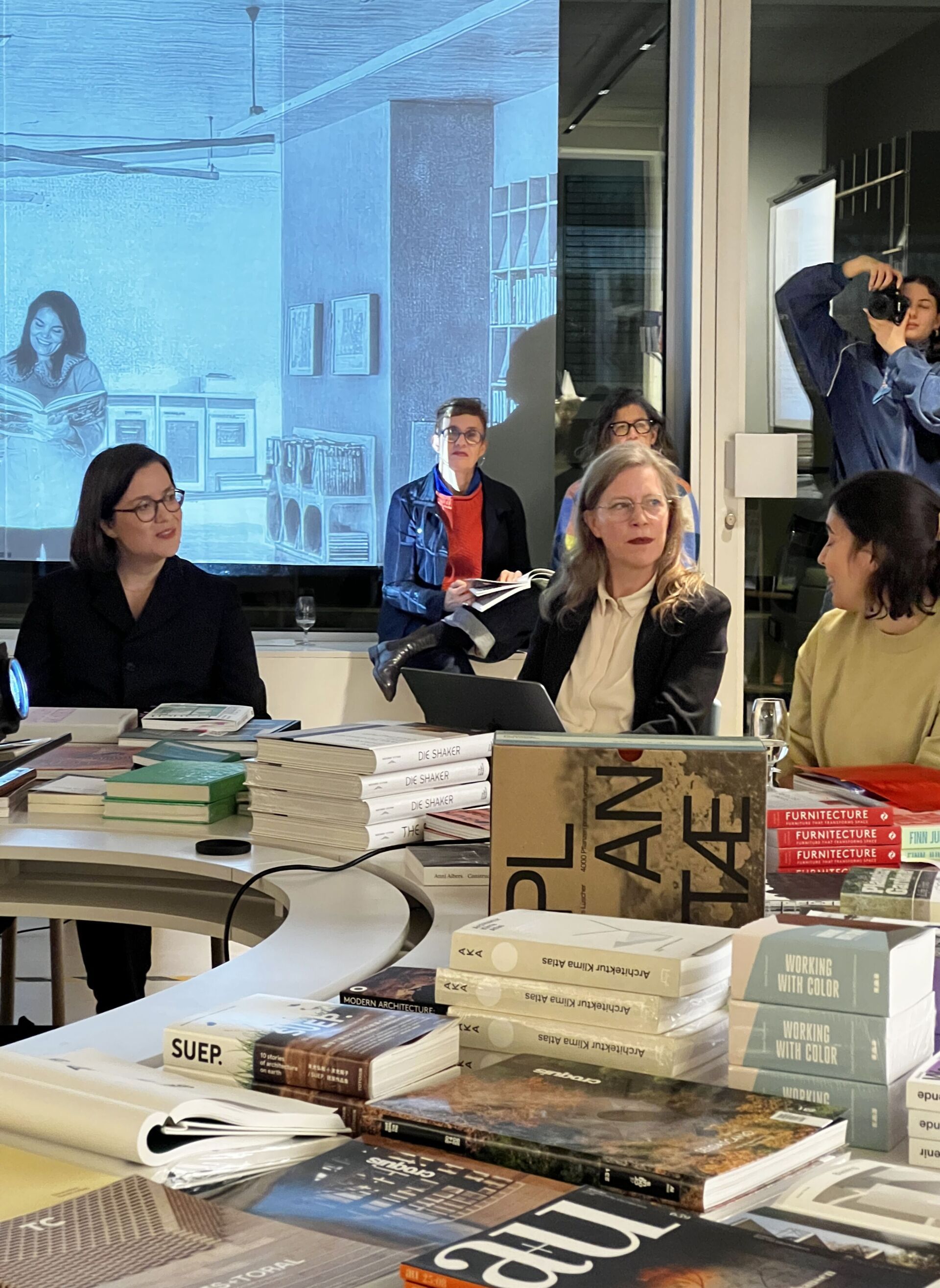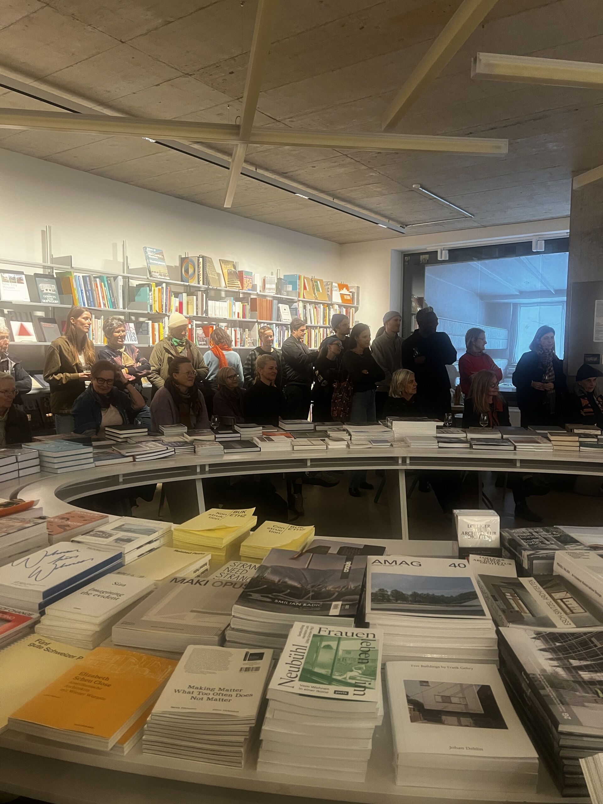 Entre les nouvelles parutions, les piles de livres et une grande table ronde, il ne s’est pas tenu ce soir-là un lancement de livre classique, mais une discussion approfondie sur l'architecture en tant que pratique vécue. Le salon du livre était bondé. Des auditeurs se tenaient entre les rayonnages, s’appuyaient aux tables, feuilletaient le livre. Le fait que la discussion n’ait pas eu lieu de manière frontale, mais au centre de l’espace, correspondait à la posture de la publication: s’éloigner d’un regard distancié pour se tourner vers l’expérience. Au fil de la soirée, il est apparu clairement à quel point l’atmosphère et le contenu se renforçaient mutuellement. Le salon du livre s’est révélée être le cadre idéal pour penser l’architecture non comme une œuvre achevée, mais comme une relation continue entre espace, usage et biographie.