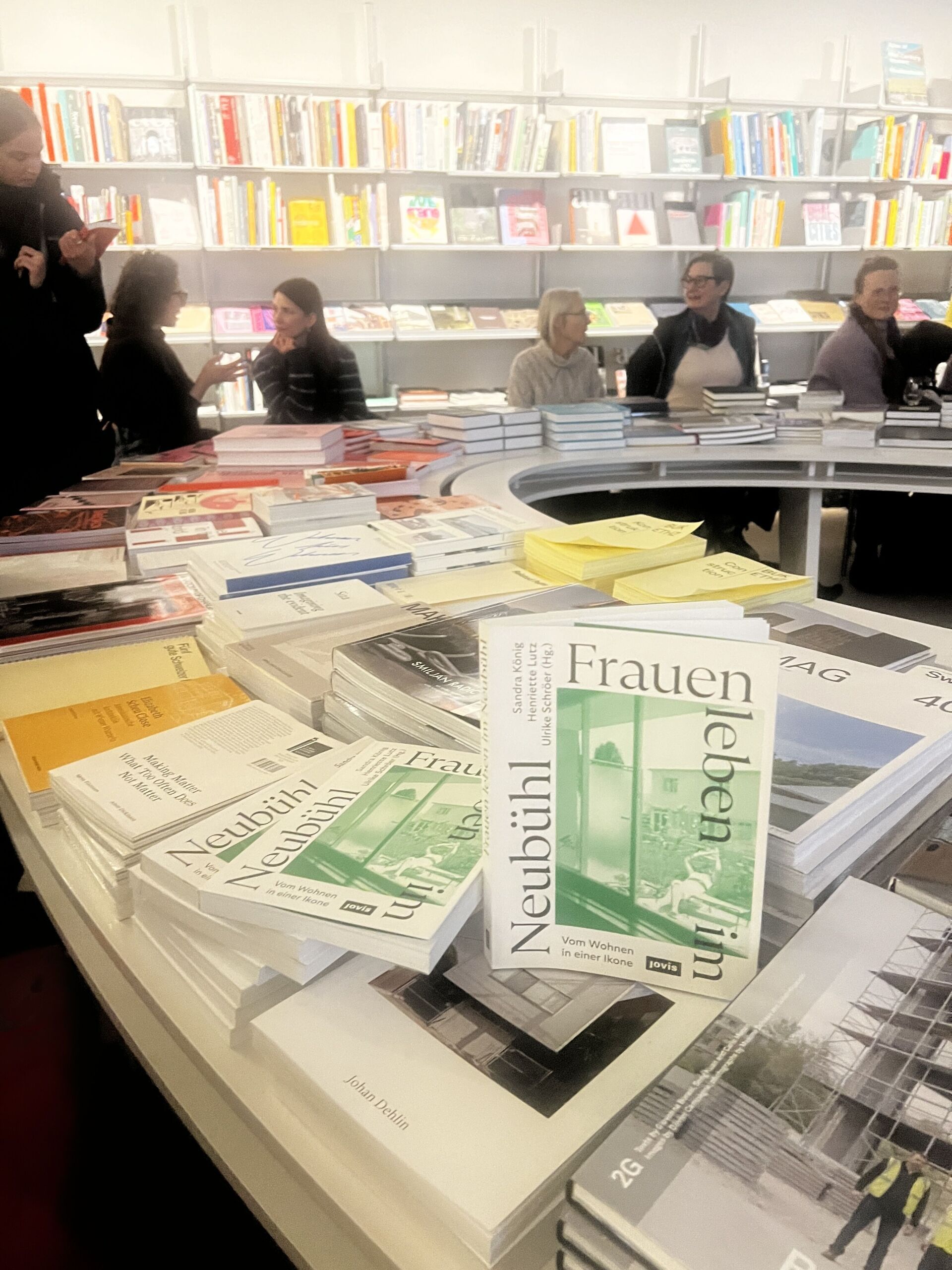 Au cœur de la soirée se trouvait la table ronde réunissant les éditrices Sandra König, Henriette Lutz et Ulrike Schröer, ainsi que l’historienne de l’architecture Frida Grahn, membre du comité de créatrices.ch. Le point de départ de la discussion était constitué par les huit portraits de résidentes rassemblés dans l’ouvrage: des récits biographiques dans lesquels des parcours de vie individuels, des formes d’habitat et des stratégies d’appropriation rencontrent la typologie architecturale de la cité Werkbund de Neubühl.