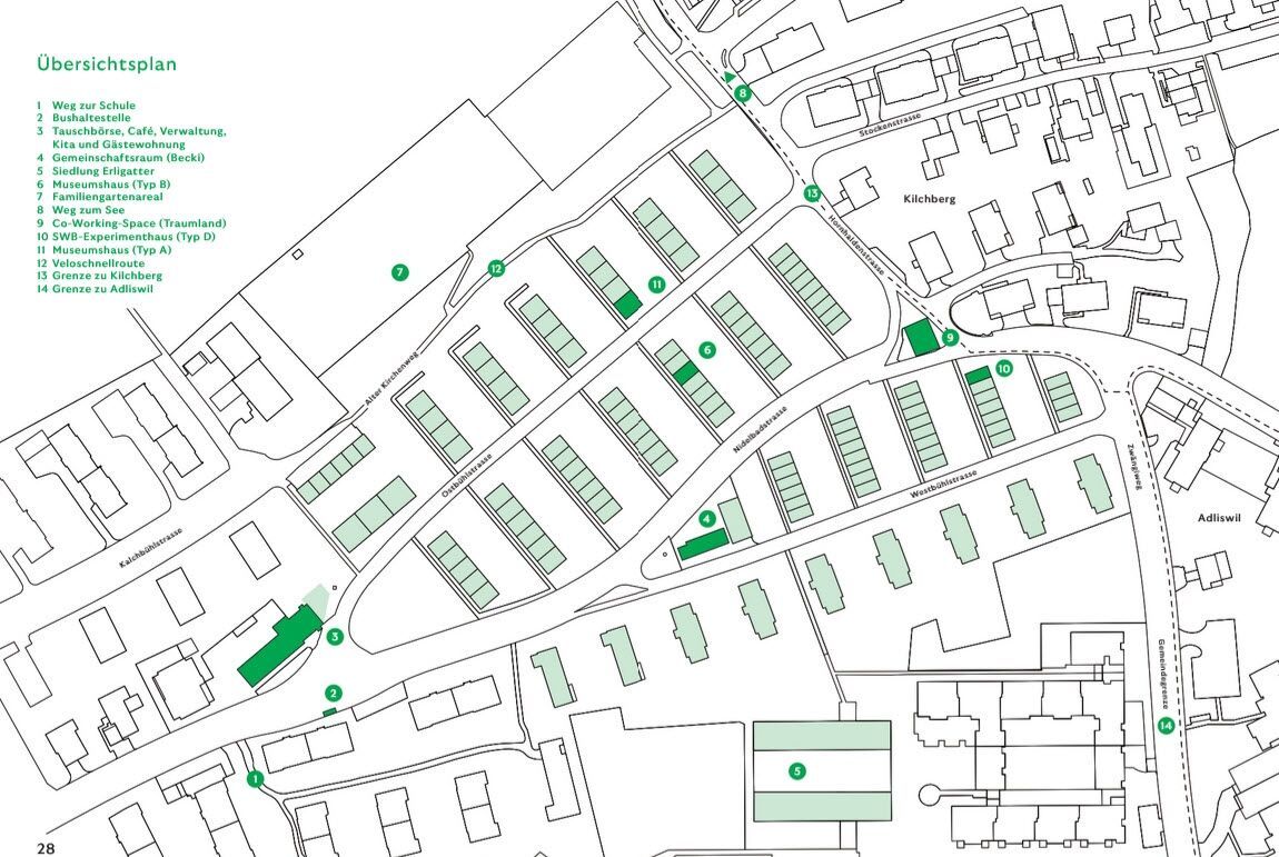 Vue d’ensemble des types de logements et de maisons: les plans historiques révèlent l’organisation typologique de la cité – et rendent en même temps perceptible à quel point le système de conception moderne reposait sur la standardisation. Ce n’est que dans l’usage quotidien, tel que le décrivent les habitantes, que ces types deviennent des espaces réellement vécus. | Plan © Jovis Verlag
