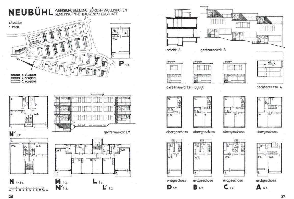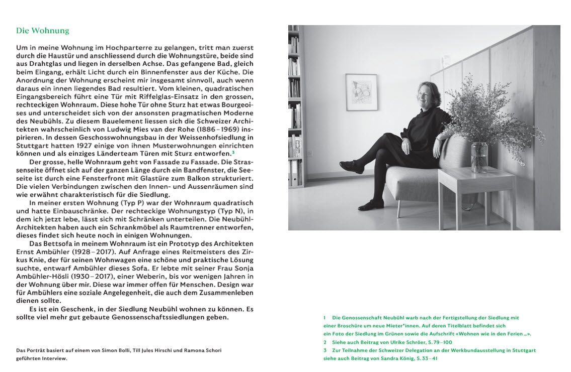 Les portraits ne se suffisent pas à eux-mêmes: ils sont complétés dans l’ouvrage par un second fil conducteur constitué d’essais. Construite entre 1930 et 1932, la cité Werkbund de Neubühl est considérée comme l’ensemble architectural le plus important du mouvement du Neues Bauen en Suisse. Réalisée à l’initiative de privés en pleine crise économique mondiale, la cité comprend 121 maisons et 194 logements et est placée sous protection cantonale des monuments historiques depuis 2010.