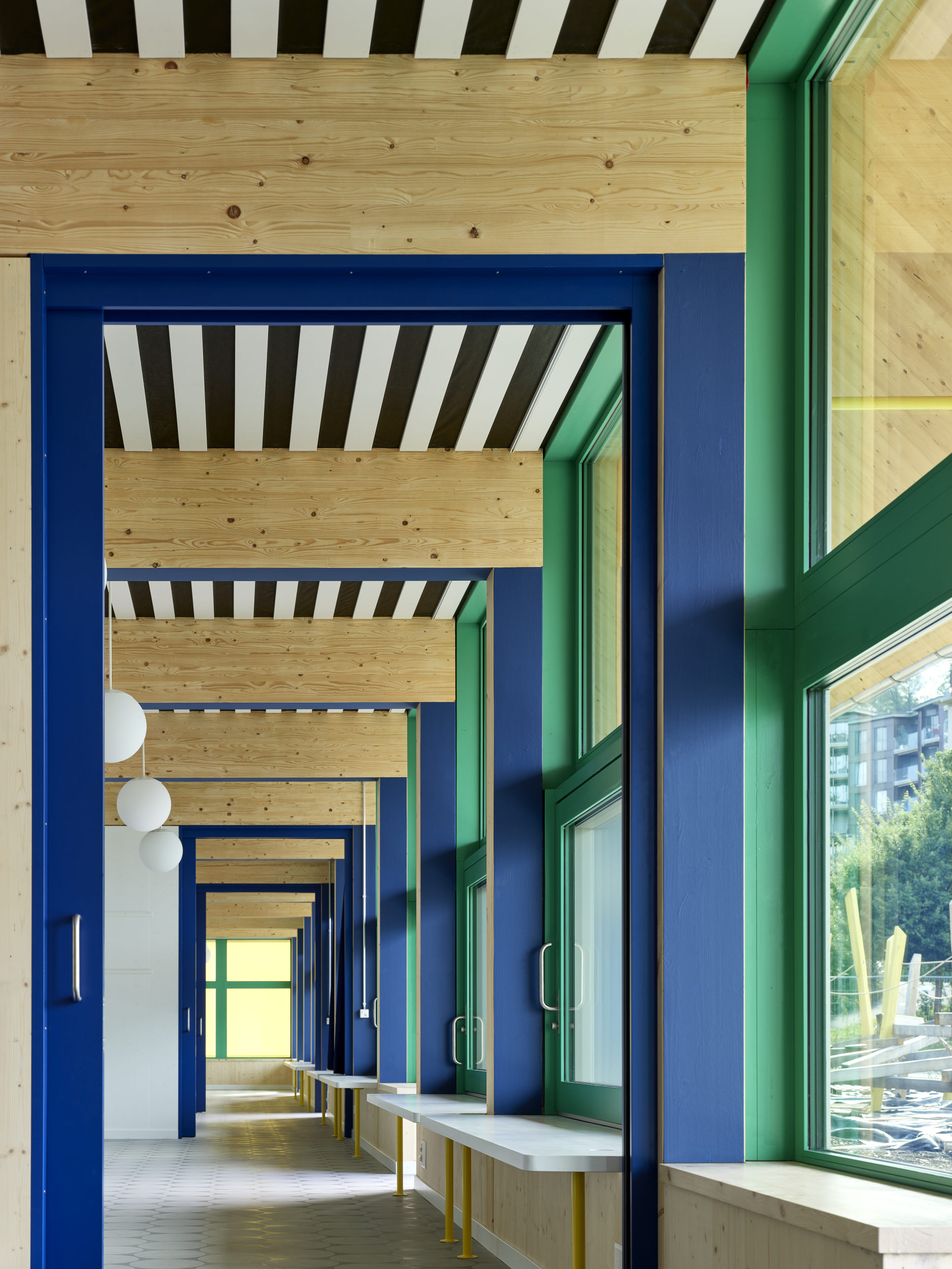 Si elle peut sembler née d’une inspiration ludique, cette diversité est avant tout le fruit de réflexions pragmatiques. L’ensemble a été réalisé avec des matériaux les moins chers et les plus écologiques possibles. Pour des raisons économiques, les murs et les plafonds ont été construits en béton optimisé en termes environnementaux. Grâce à une nouvelle formule, ce matériau a une empreinte carbone inférieure d’environ dix pour cent à celle d’un béton conventionnel. Les autres murs extérieurs et les cloisons intérieures ont été réalisés avec des éléments préfabriqués en bois. Les piliers ronds de 70 centimètres de diamètre qui marquent les entrées au rez-de-chaussée sont en grès Bolliger de la région zurichoise du Haut-Lac. Et même s’ils n’ont pas passé le test de résistance en laboratoire et ont dû être percés et renforcés, leurs noyaux ont malgré tout pu être utilisés pour les revêtements de sol et les bancs.