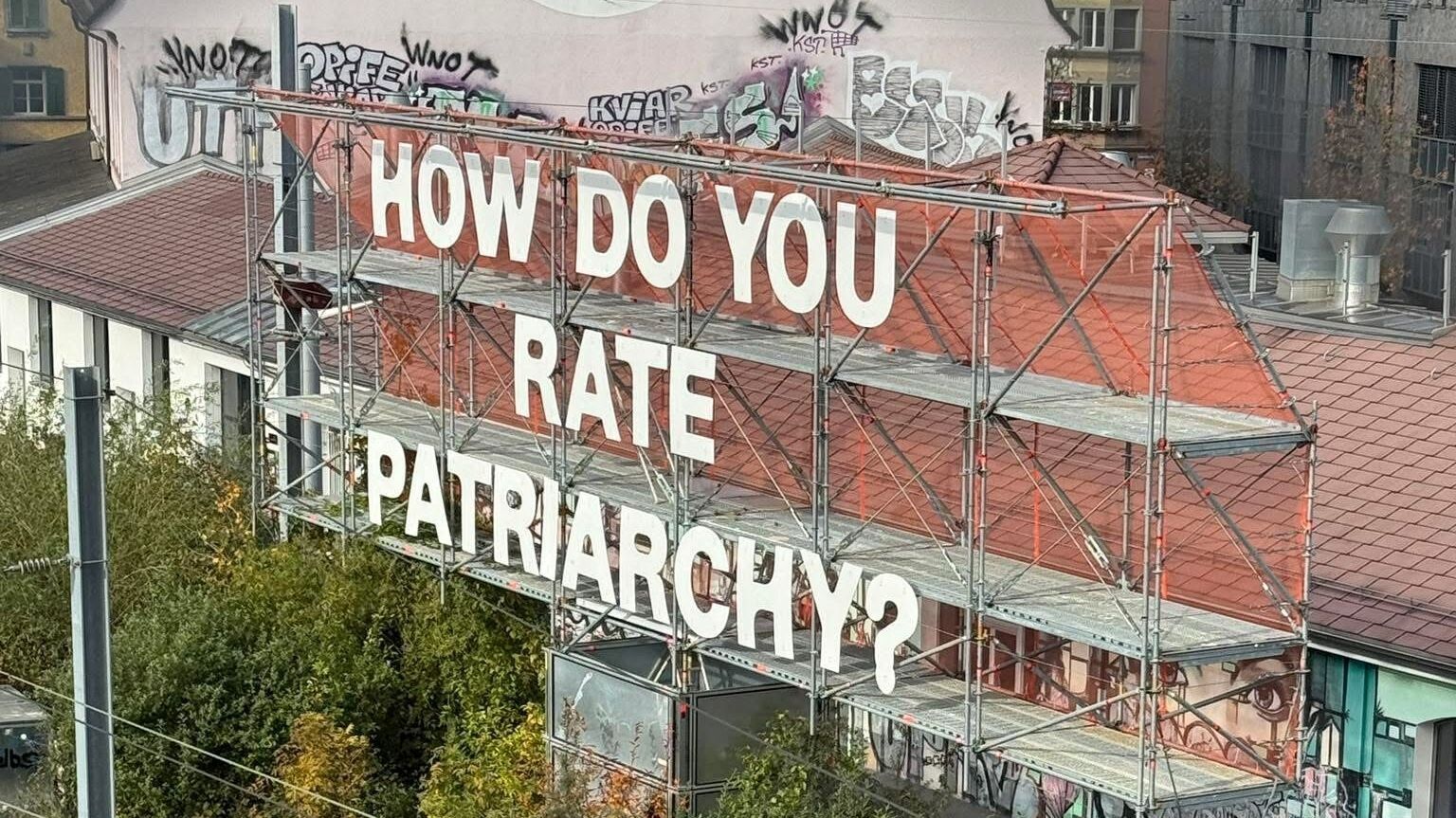 Les lignes tracées par le faisceau des voies brillent sous le soleil couchant. Sous nos pieds, les trains entrent en gare de Zurich à vitesse diminuée. A proximité du Negrellisteg, un slogan, «How do you rate patriarchy?», brille en grandes lettres blanches accrochées à la structure en acier monumentale qui jouxte les voies – un panneau féministe de huit mètres de haut pour dix-huit de large.