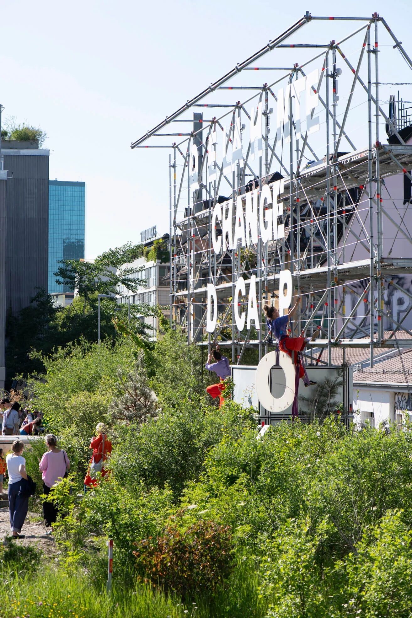 Le groupe était déjà à l’origine de la très remarquée intervention FrauMünsterhof21 (2021), qui célébrait cinquante ans de suffrage féminin en Suisse en proposant performances et discussions sur le Münsterhof, à Zurich (voir à ce sujet l’Arc Mag 2022–6, p. 170–173). Et comme c’était le cas en 2022, c’est un échafaudage de l’entreprise Kamber installée à Olten qui sert de construction temporaire, modulaire et réutilisable pour BILLBOARD.