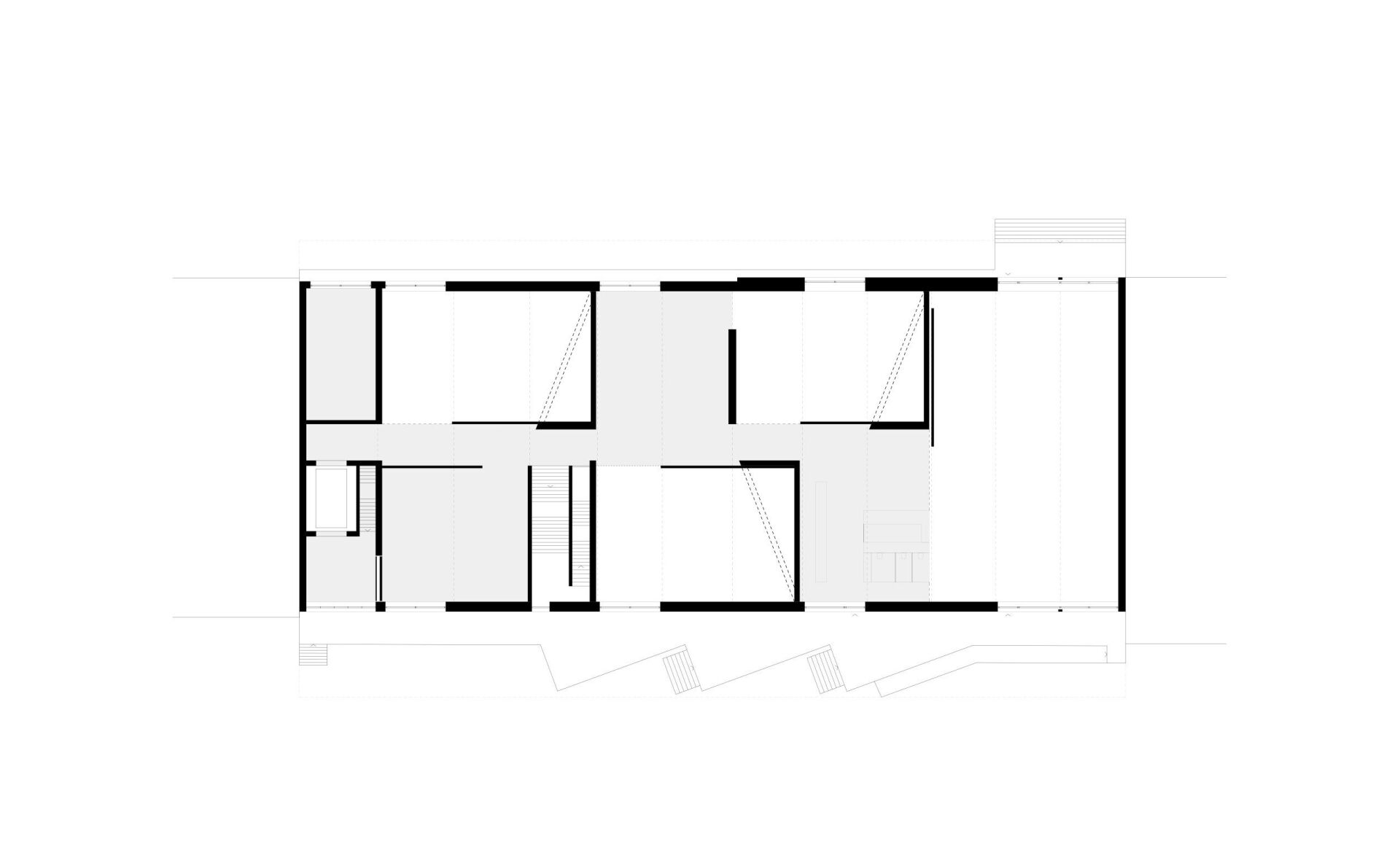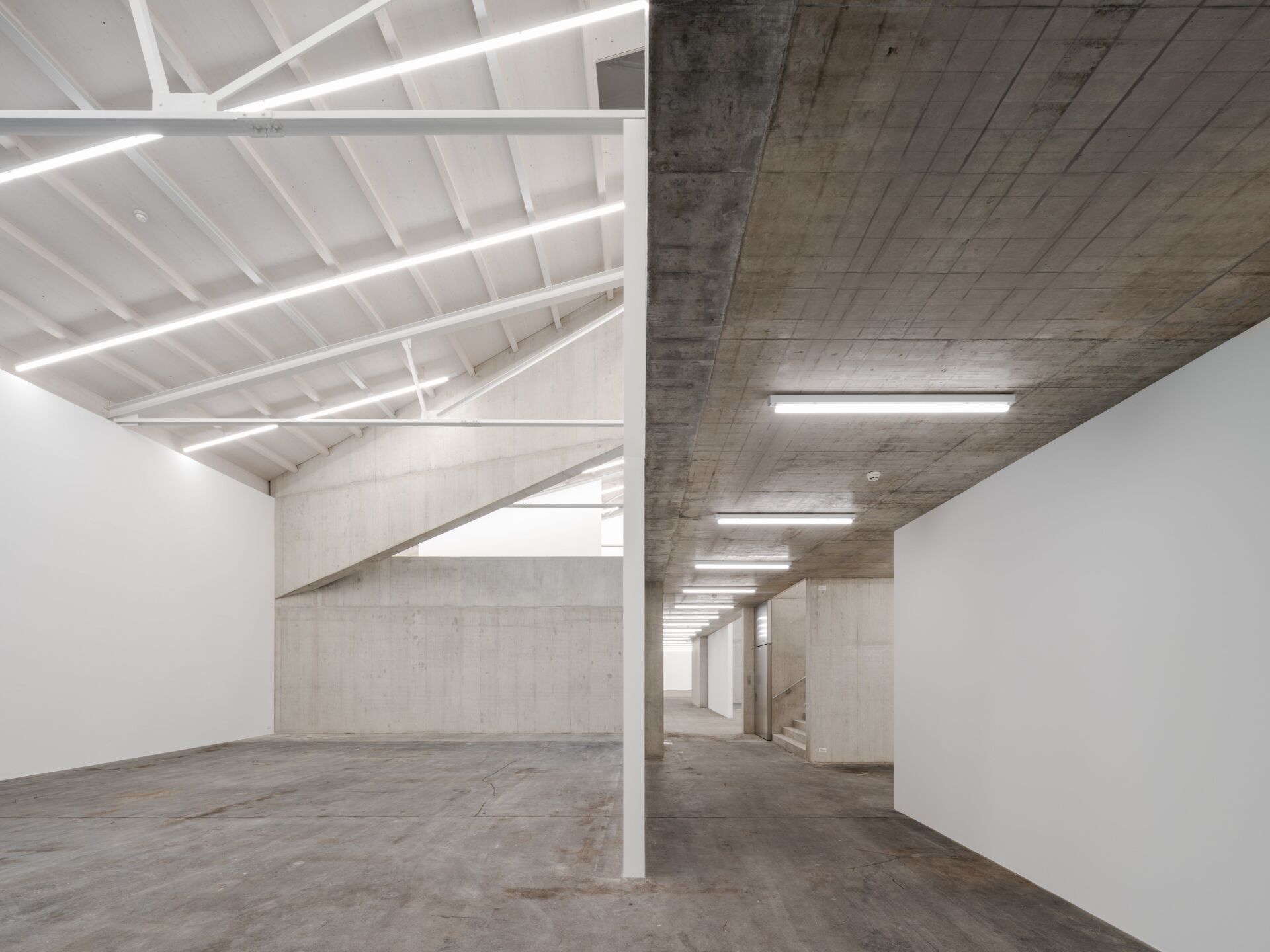 Pour le projet de la Kunsthaus Baselland, Buchner et Bründler ont caressé l’idée d’une construction nouvelle actant de la destruction de la halle existante. Leur analyse de la situation actuelle et de l’avenir du périmètre révélant cependant que la plupart des anciens entrepôts disparaîtraient tôt ou tard, ils décidèrent d’emprunter la voie de la transformation et de conserver un bâtiment à la typologie par ailleurs marquante. Les halles de ce type se prêtent parfaitement à l’exposition d’œuvres d’art, ce que Urs Raussmüller avait déjà testé en 1978 en aménageant la halle pour l’art nouveau international (InK) à Zurich. Les architectes ont proposé d’insérer dans le hall de 63 x 25 mètres et de 10 mètres de haut trois espaces de galeries de taille identique, qui s’étendent jusqu’au toit. Au rez-de-chaussée et à l’étage, elles sont entourées d’autres salles de galeries. Il en résulte une succession méandreuse et variée de salles d’exposition de tailles et de hauteurs différentes. Sorte de mobilier spatial, cet aménagement intérieur est porté par trois «silos de lumière» de 20 mètres de haut qui percent les tôles ondulées de la toiture à faible pente, stabilisent l’ancienne halle et signalent le nouveau centre d’art au loin. Buchner Bründler avaient testé en 2010 un principe semblable pour la transformation d’un rustico dans le village montagnard de Linescio au Tessin. Seule une cheminée sculpturale blanche laisse deviner l’insertion d’un corps en béton à l’intérieur de l’enveloppe érodée en pierre naturelle.