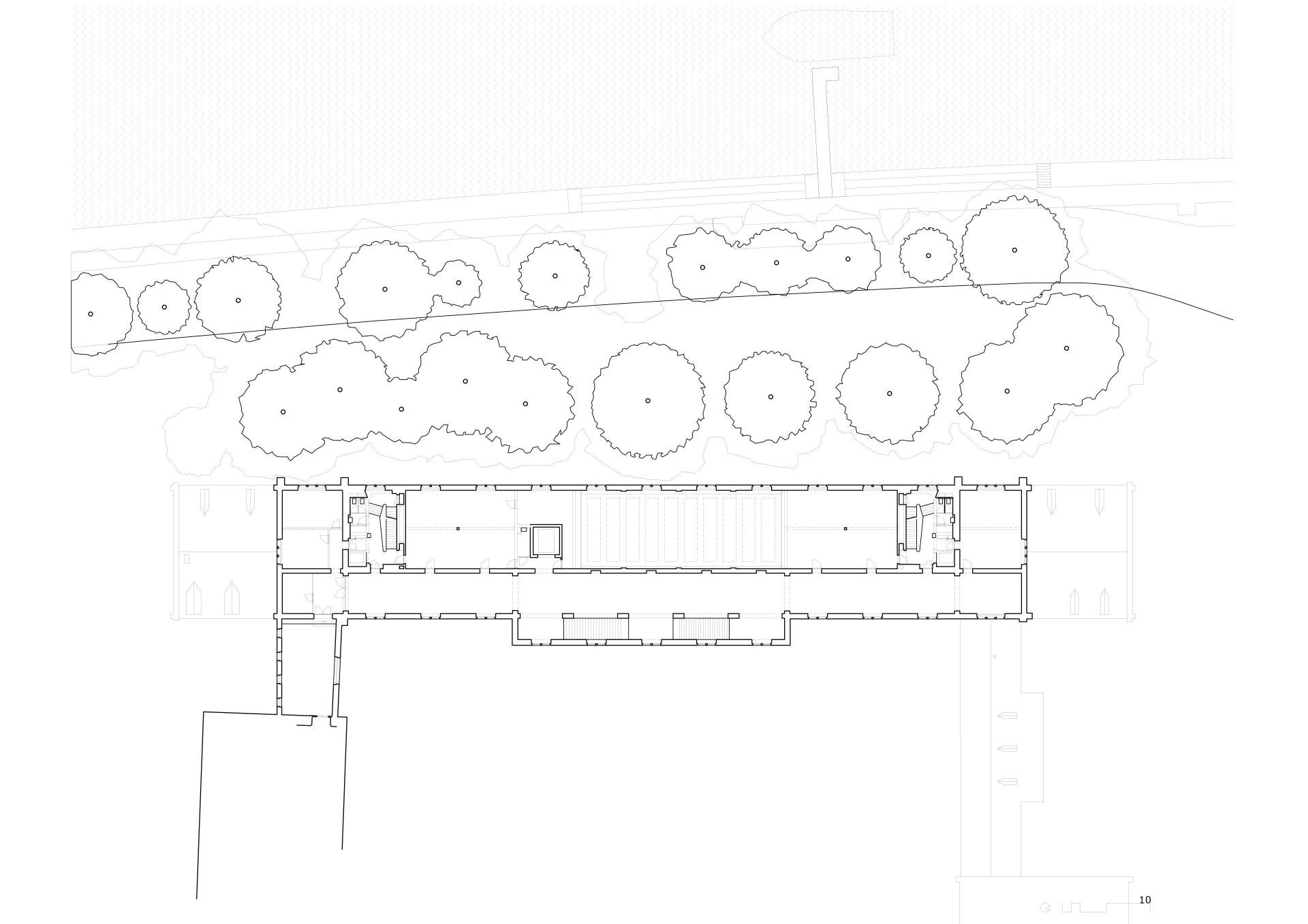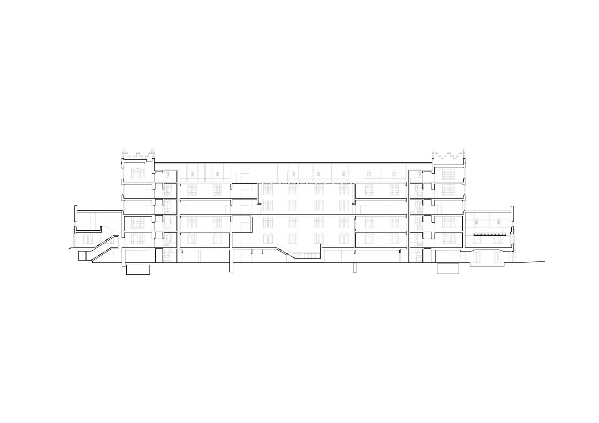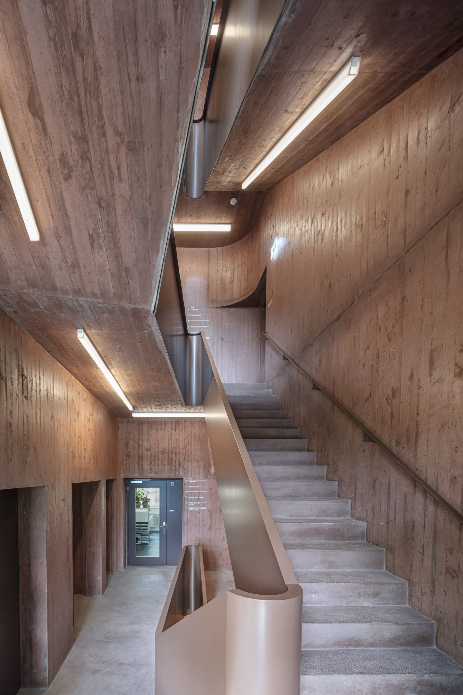 Malgré la réaffectation, Focketyn et del Rio sont parvenus à conserver le charme de l’ancien bâtiment. De petits détails comme les vieux radiateurs ou les rebords de fenêtres usés, à peine restaurés, y contribuent. Juste à côté des deux tourelles, deux cages d’escalier de secours ont été créées à la place d’étroits dortoirs. Leur construction massive en béton coulé sur place et de couleur rouge grès rhénan, d’aspect très organique, assurent également le renforcement de la résistance sismique du bâtiment. Les cages d’escalier permettent en outre une desserte des bureaux, libérant de la sorte les couloirs qui deviennent des lieux de travail temporaire supplémentaires pour les artistes indépendants et les nomades numériques. Mais la plus grande intervention est le nouvel espace central, dissimulé derrière le volume en saillie donnant sur la cour. L’espace en question s’étend sur cinq axes et n’occupe, comme les escaliers de secours, que la couche spatiale des anciens dortoirs. Pour ce faire, une «bulle» de 22 mètres de hauteur a littéralement été libérée dans le bâtiment. Un foyer de 13 mètres de haut, soit trois étages, y est inséré et sert d’intermédiaire entre les entrées du rez-de-chaussée côté cour et celles du rez-de-chaussée inférieur côté Rhin. Exactement au-dessus se trouve une salle polyvalente de deux étages et de neuf mètres de haut.