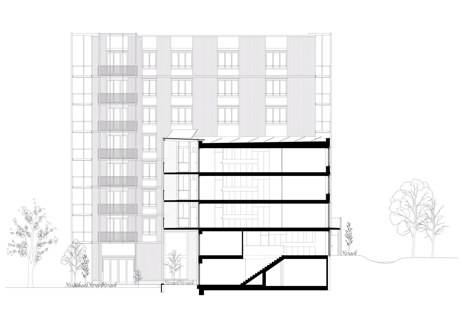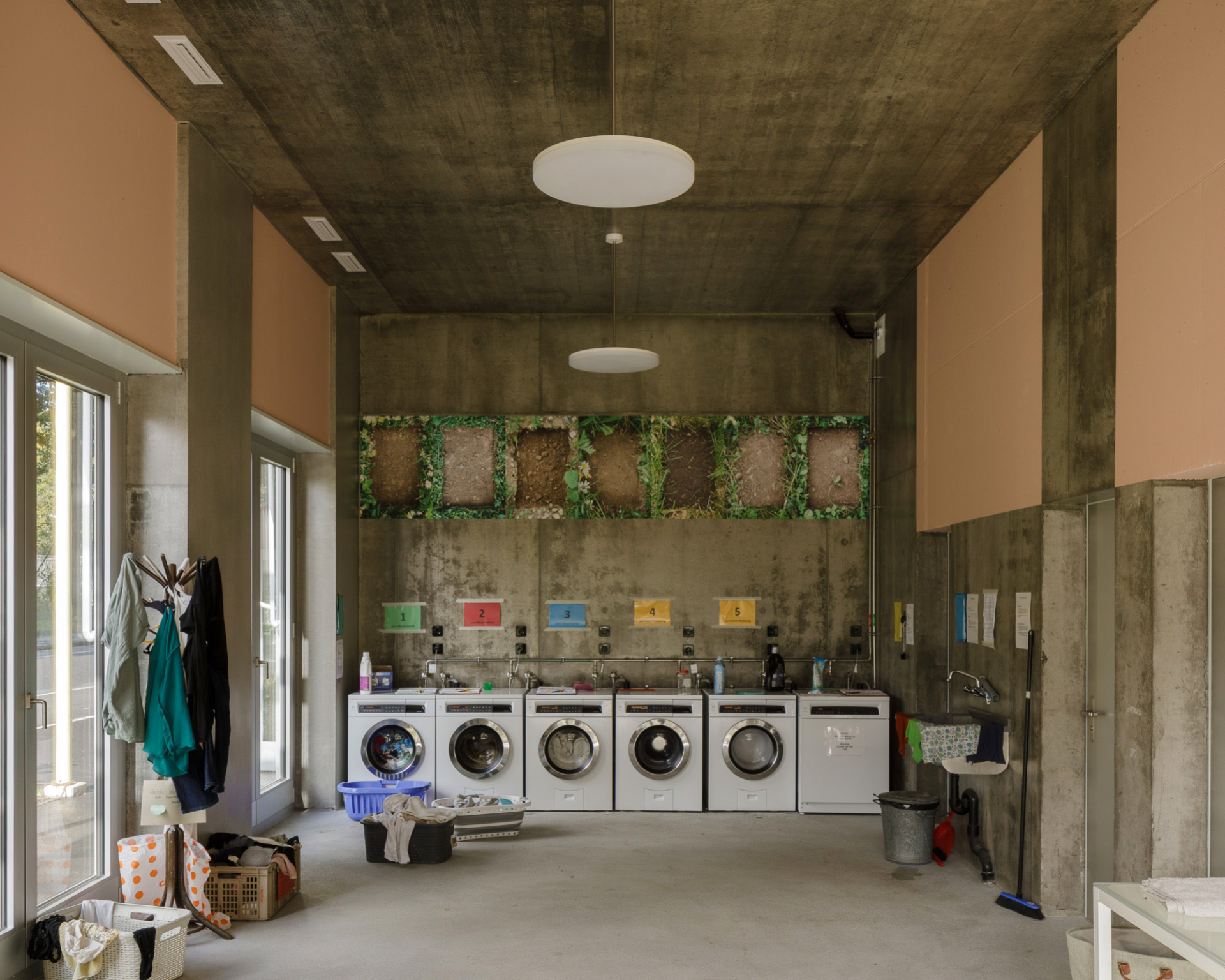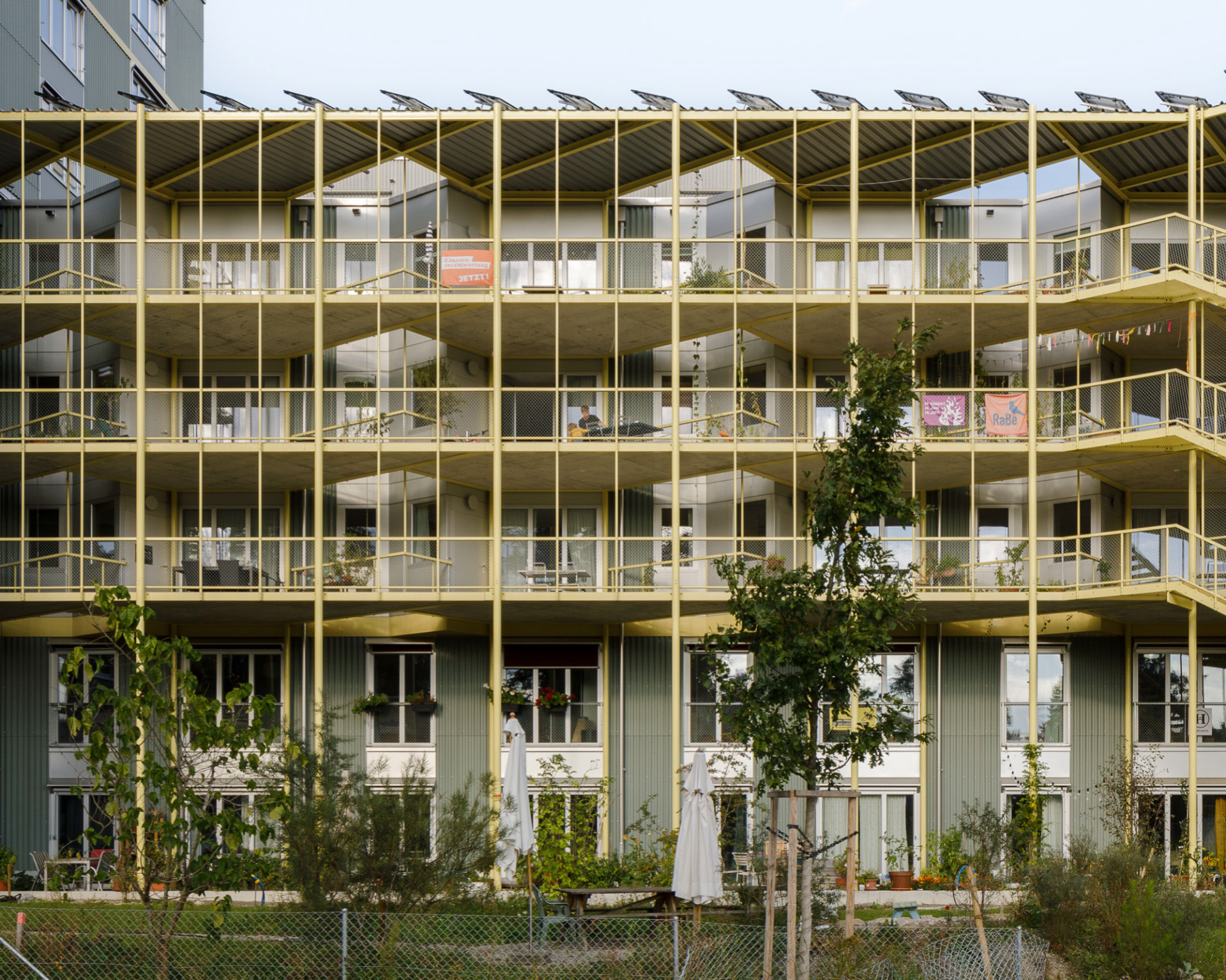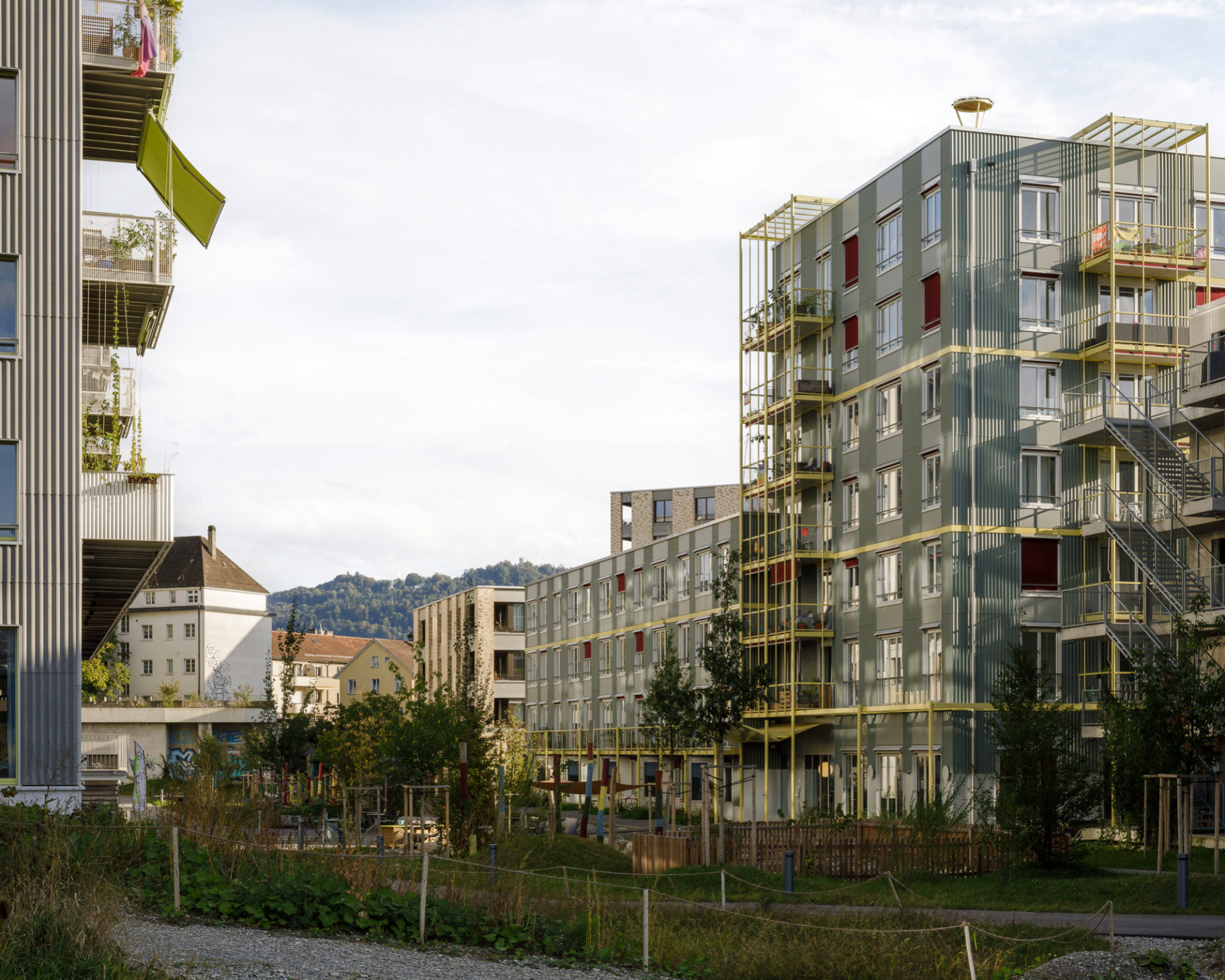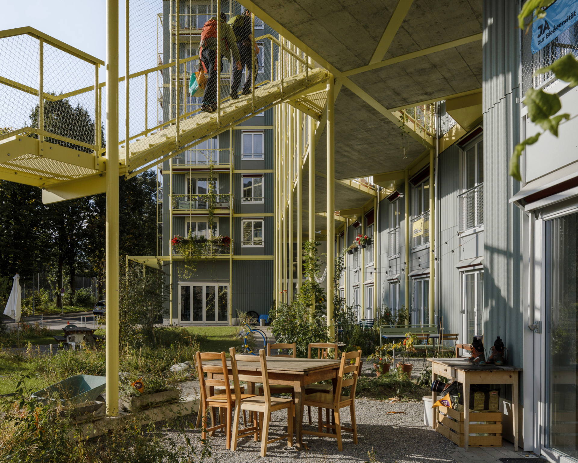 Maître d’ouvrage du projet, NPG SA porte des projets synonymes de construction durable, de processus participatif et d’utilité publique. Le programme comprend donc une bibliothèque, un jardin d’enfants et différents espaces extérieurs à usage collectif , en plus de 47 logements pouvant accueillir jusqu’à 150 personnes. Les types de logements répondent aux attentes de NPG: vivre ensemble de la manière la plus sociale, économique et écologique possible. Les architectes étaient donc invité·e·s à imaginer non pas un simple immeuble, mais une communauté d’habitant·e·s. Aucune place de parking n’a été prévue et, avec une consommation de surface de 35 mètres carrés en moyenne par personne, l’immeuble contribue à la densification urbaine en Suisse. L’obtention du label Minergie-P-Eco témoigne en outre d’un très bon bilan écologique.