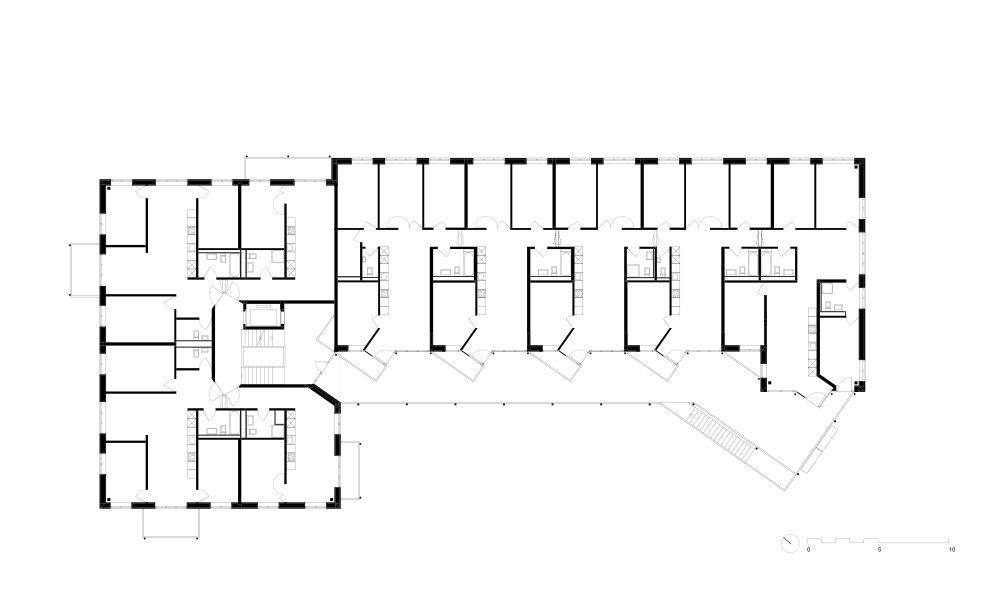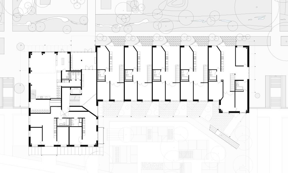 Ce concept est aussi appliqué dans le deuxième volume. En plus de duplex qui permettent de négocier une différence de hauteur de terrain de près de quatre mètres, le volume étiré abrite en plus quinze logements traversants donnant sur la cour au nord-est, et sur des jardins collectifs au sud-ouest. Les cinq logements à chaque étage ont tous été cloisonnés avec le même principe de cloisons légères, permettant ainsi la création de très grandes unités. C’est d’ailleurs le cas à l’un des étages qui accueille une communauté de dix personnes. À l’instar du volcan qui a donné son nom au projet, les espaces communs libres d’utilisation s’agglutinent et se séparent tel un magma liquide, entourent des chambres disséminées et s’ouvrent à plusieurs endroits sur des espaces extérieurs semi-publics.